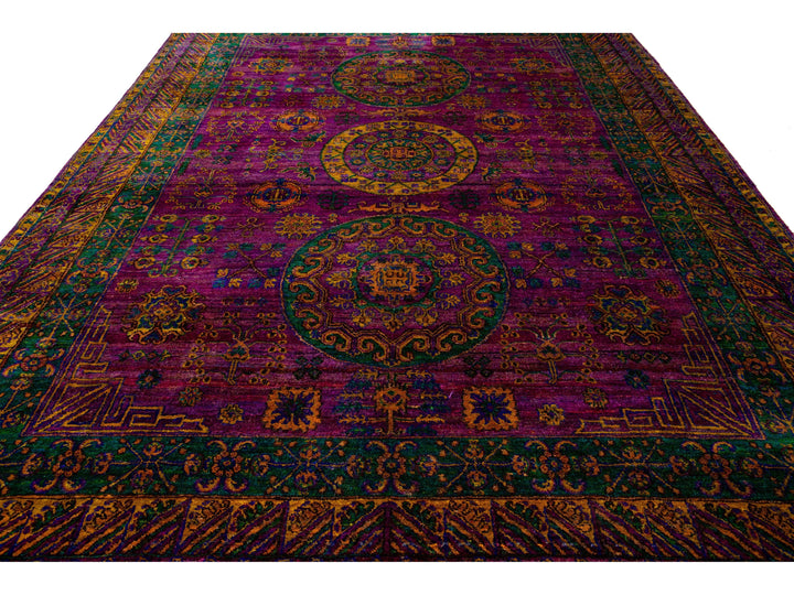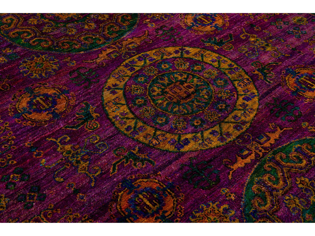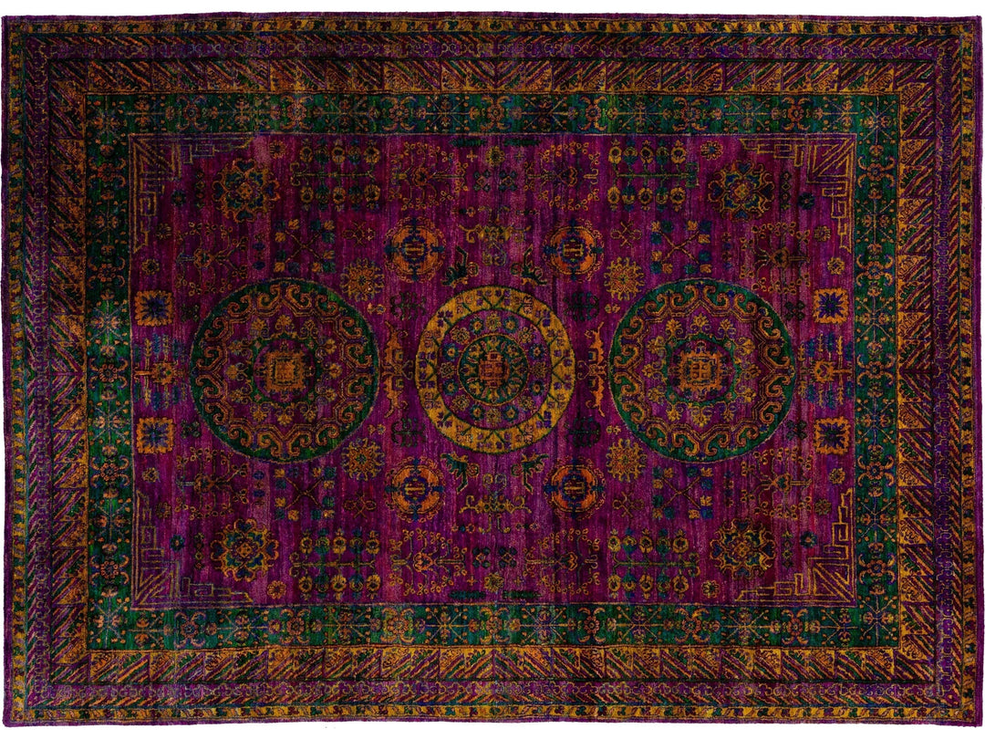 This beautiful hand-knotted rug features an enchanting rosette pattern in vibrant colors that effortlessly draws the eye. Crafted from high-quality silk, it boasts a purple background that emphasizes the meticulous details of the design. With a vibrant blend of green, blue, yellow, and orange, this piece adds an element of artistry and elegance to any space. This rug measures 8'11" x 12'3".