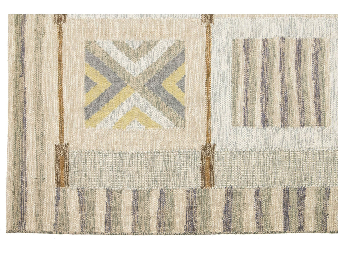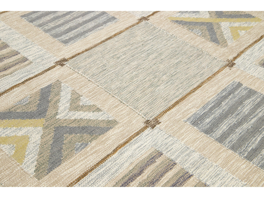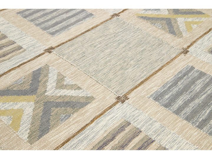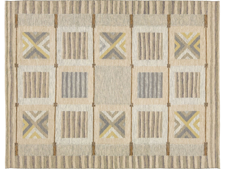 Discover the charm of this beautifully crafted Swedish-style rug, expertly hand-knotted from premium wool. Its elegant color scheme artfully combines shades of beige, gray, and brown, while lively yellow accents bring a cheerful pop. The all-over geometric design adds a contemporary touch, making it a perfect fit for any space. This rug measures 9'3" x 11'10"