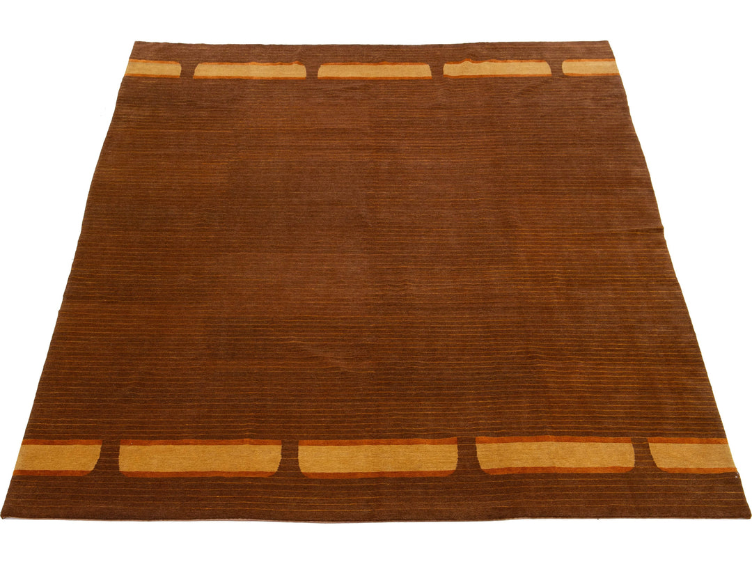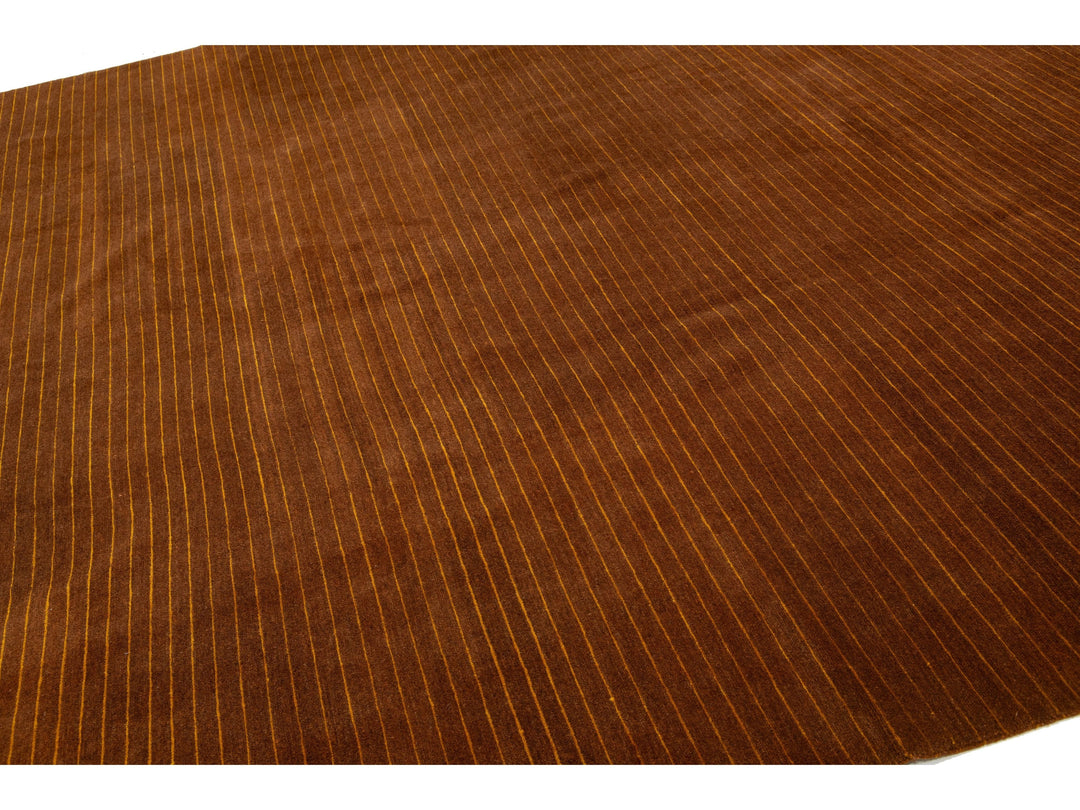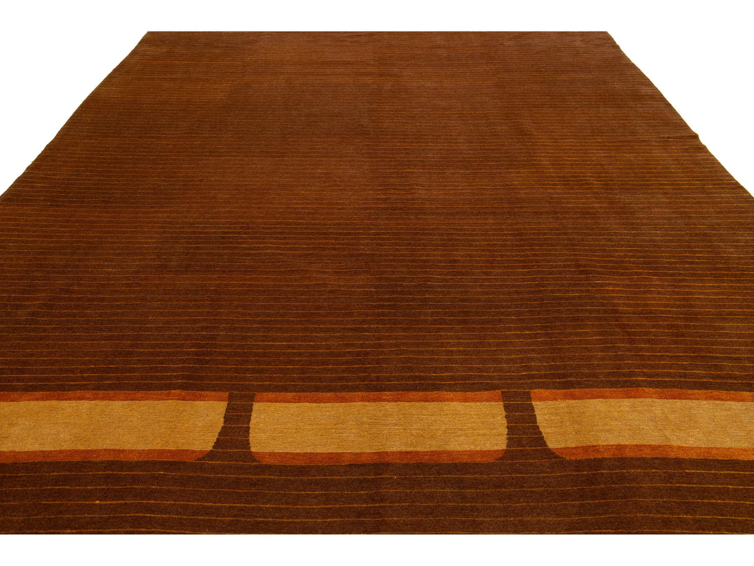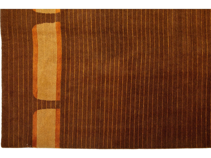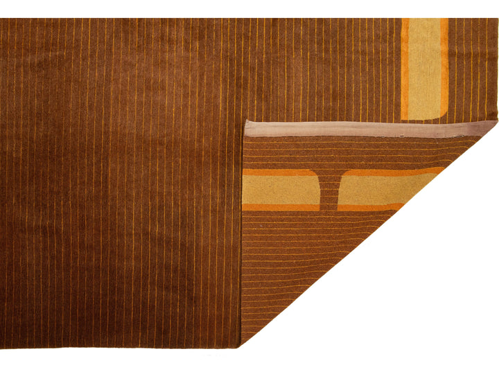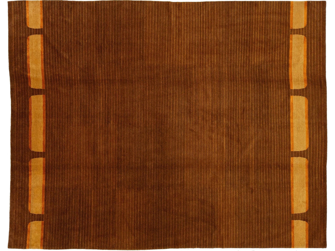 This contemporary Tibetan weave rug showcases a striking Art Deco design in vibrant golden and orange hues that effortlessly draws the eye. Made from premium Tibetan wool or silk, it features intricate detailing and a rich brown color palette, enhancing its overall elegance and sophistication. This rug measures 10' x 12'10".
