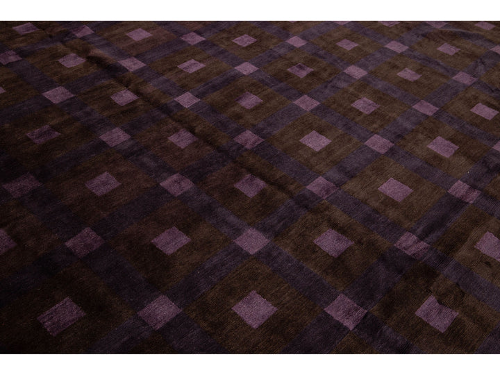 This contemporary Tibetan weave rug features a striking geometric pattern that catches the eye. Crafted from high-quality Tibetan wool or silk, it boasts intricate details and a vibrant color palette, including rich shades of dark purple and brown. This rug measures 12'10'' x 13'3".