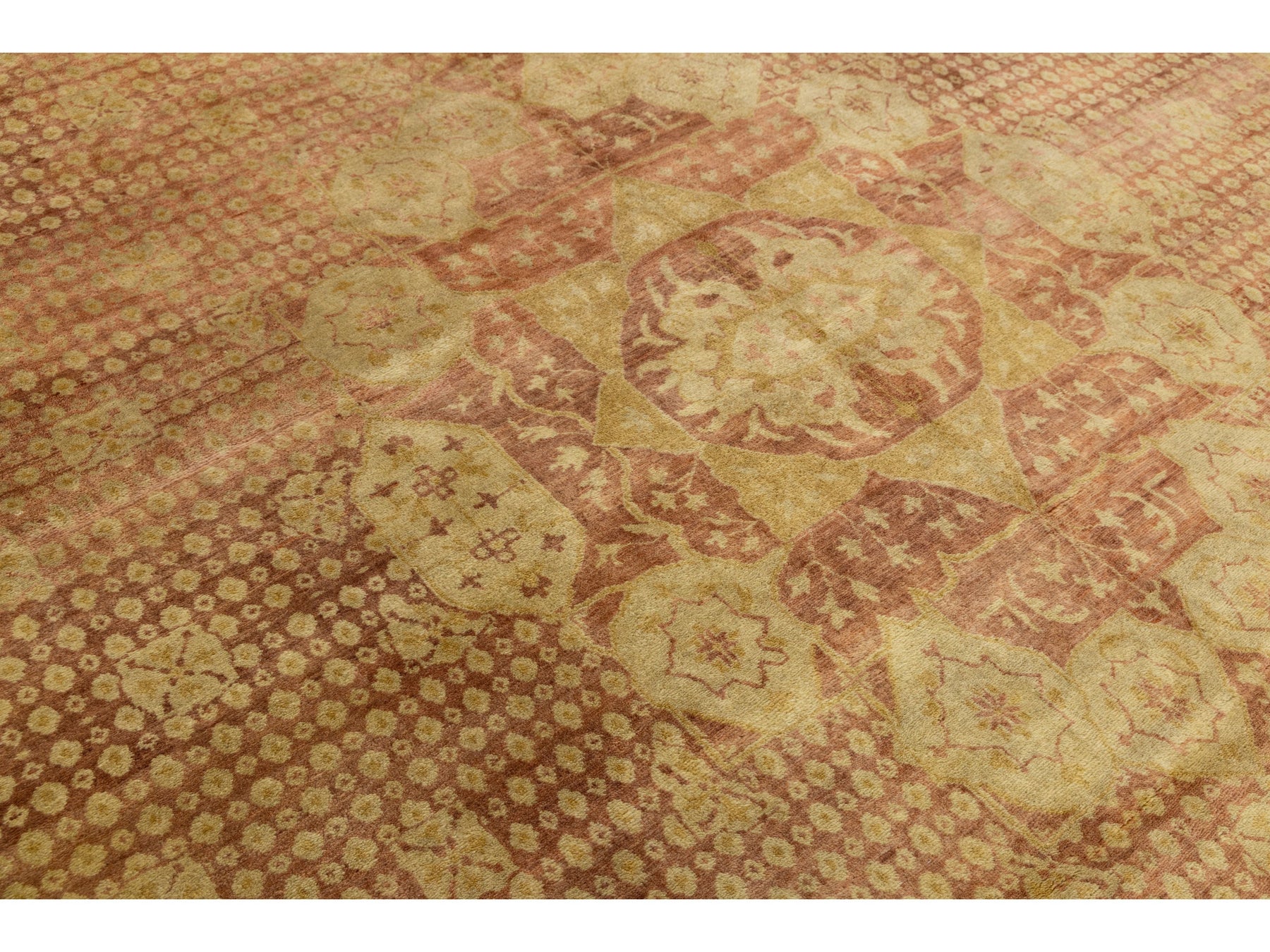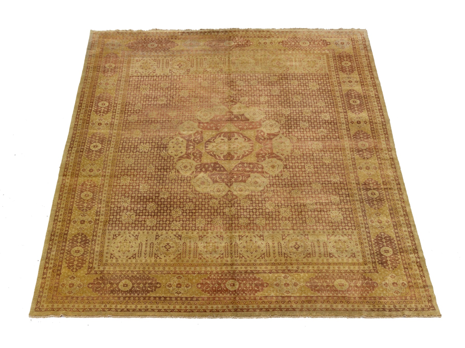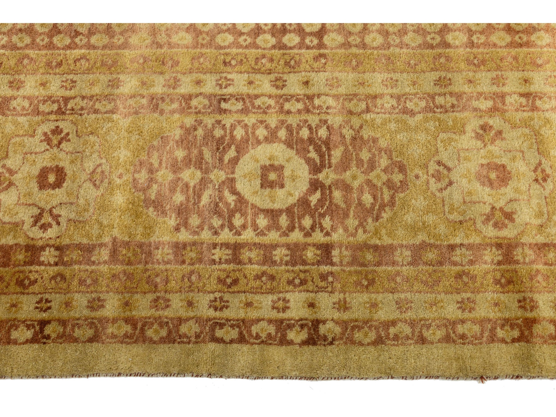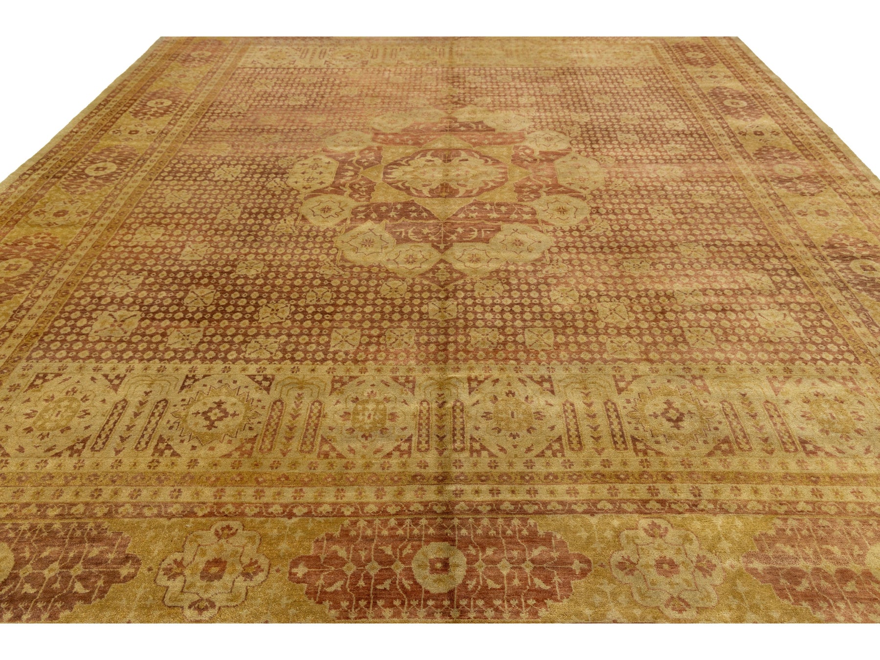 This hand-knotted Oushak-style wool rug beautifully blends modern aesthetics with the timeless charm of traditional Oushak craftsmanship. Featuring a rich terracotta background, it is adorned with vibrant floral patterns that create a stunning display of gold. This captivating design not only catches the eye but also enhances the elegance of any room. This rug measures 12' x 15'.