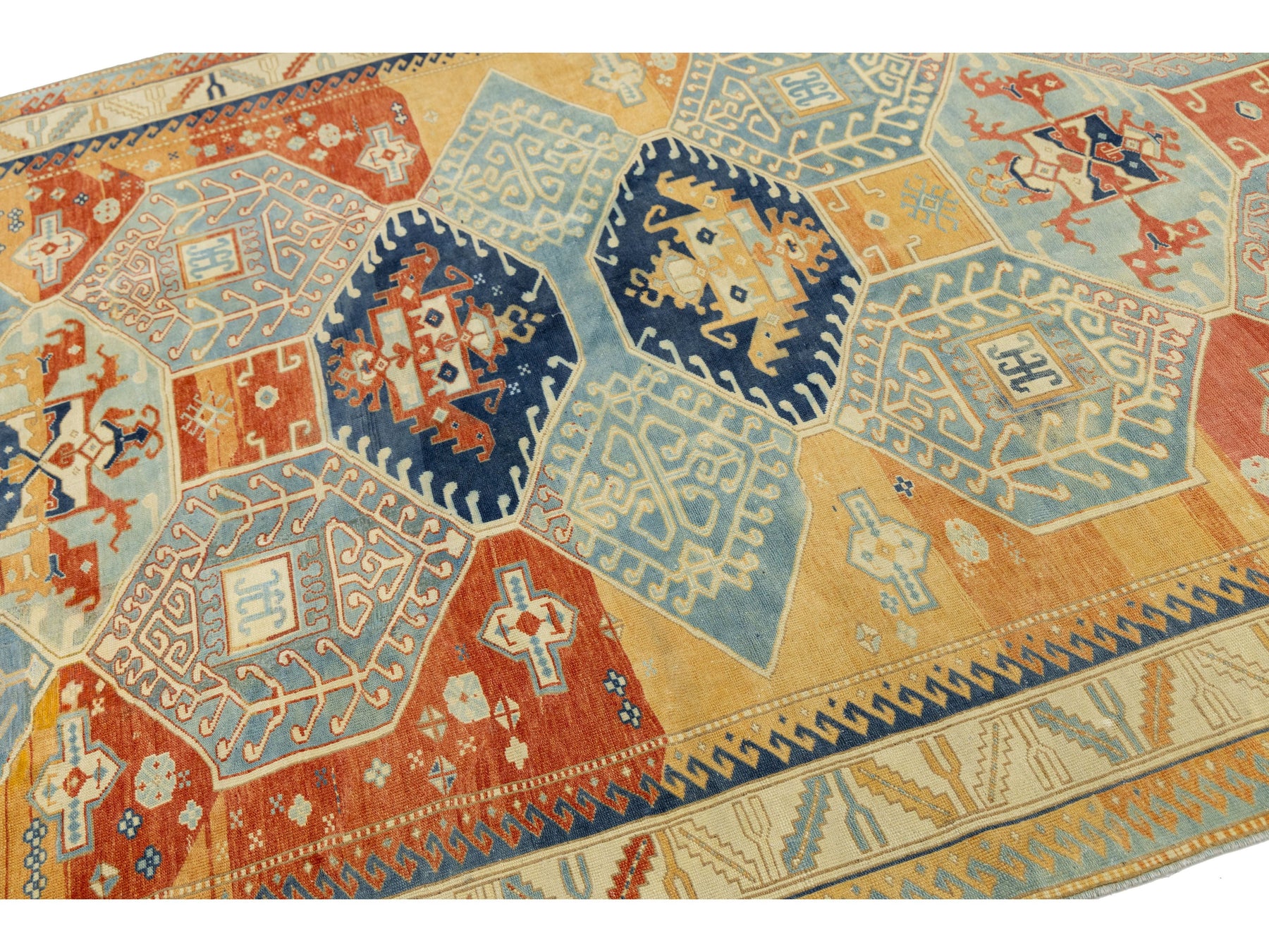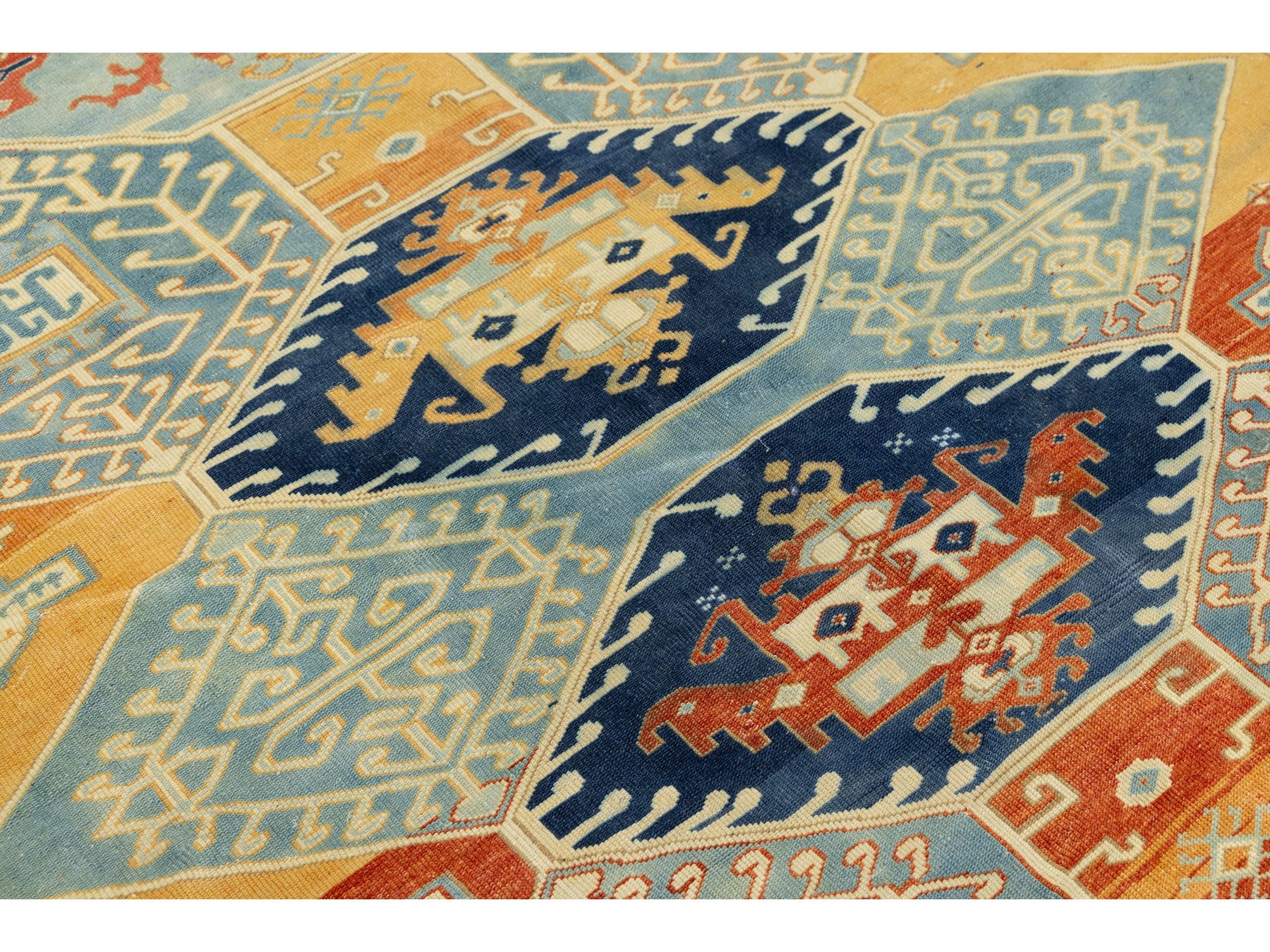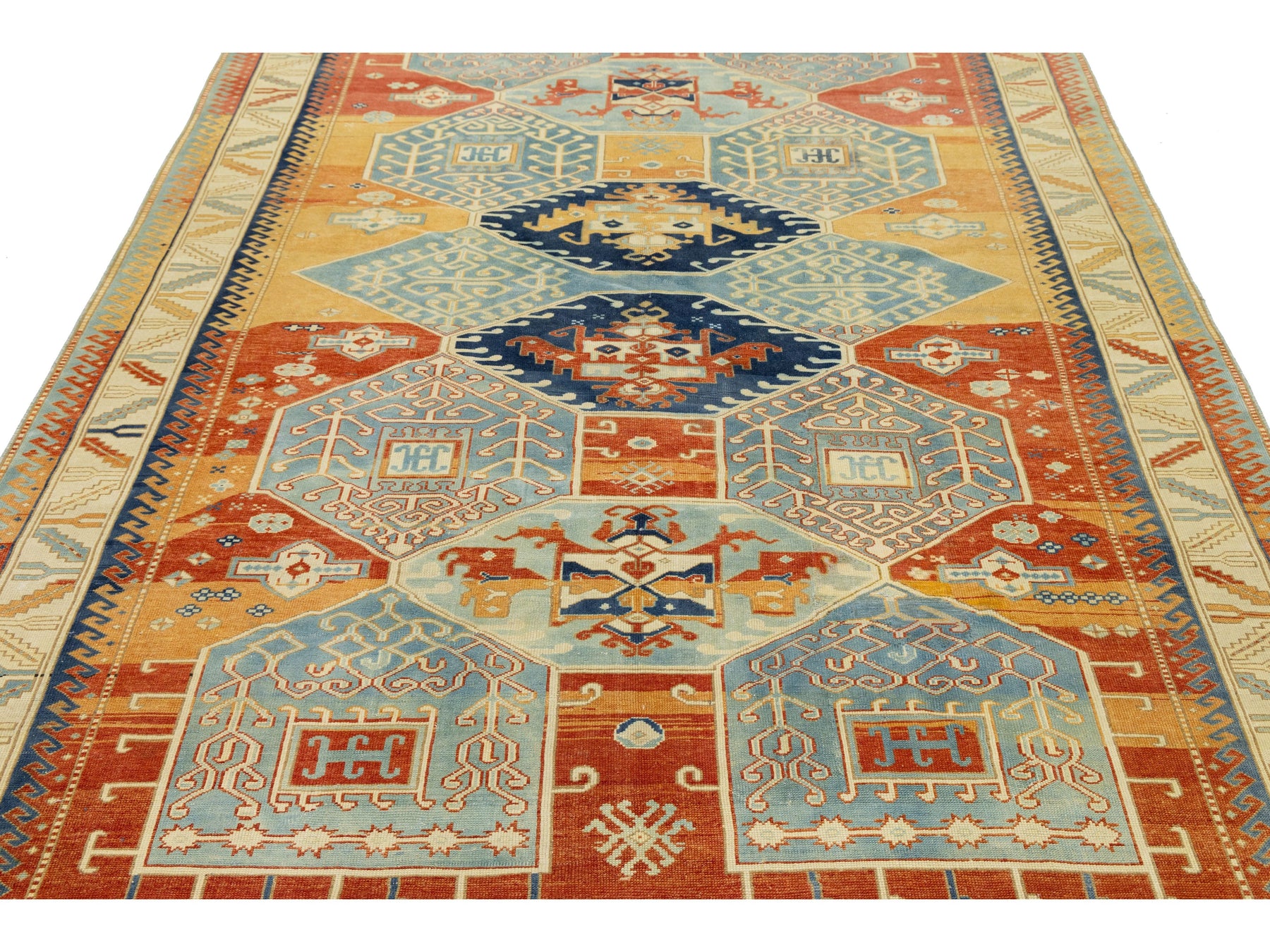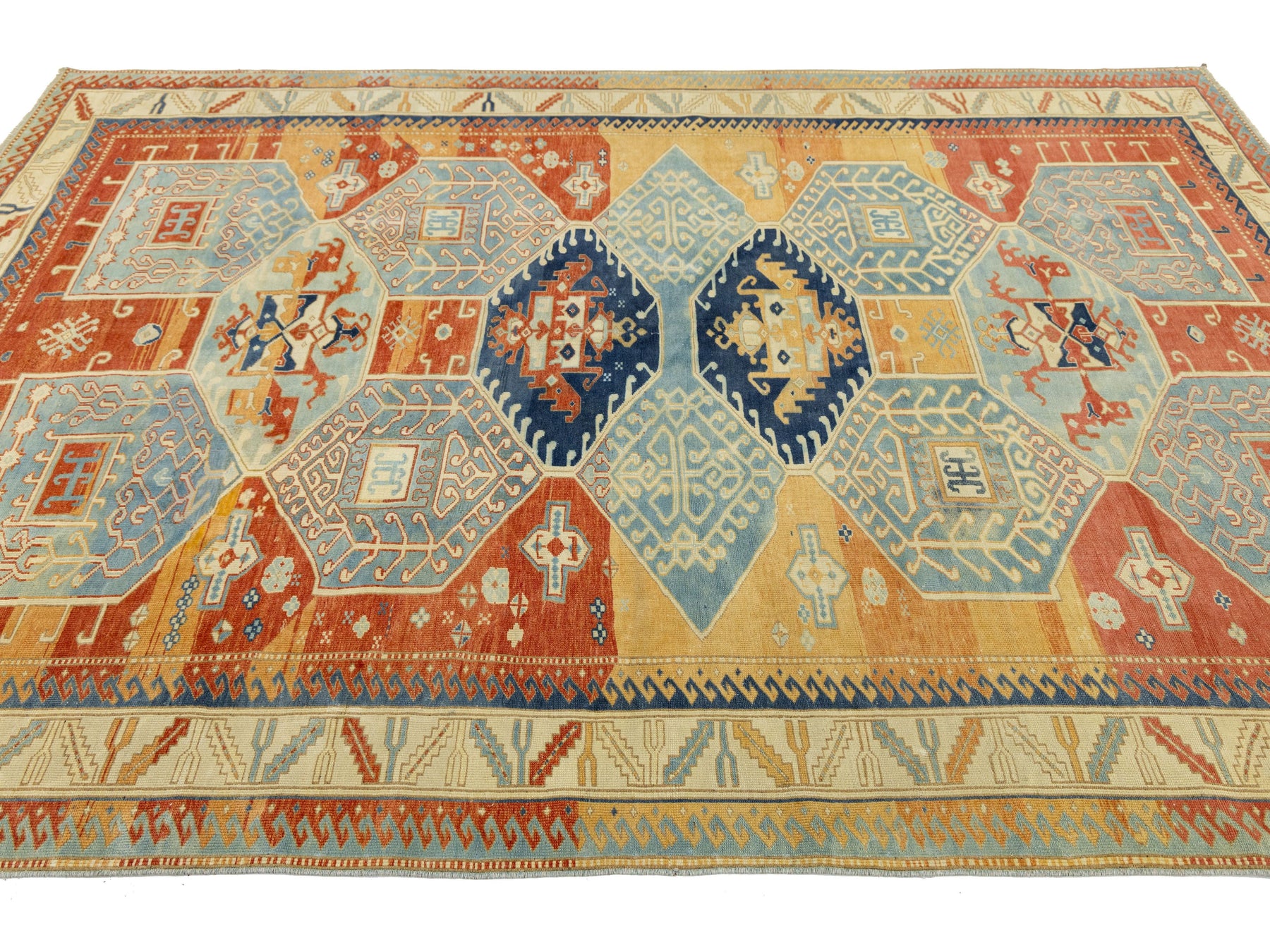 This authentic antique Kazak rug showcases the timeless artistry of Caucasian tribal weaving. Hand-knotted from wool, the rug features a series of three prominent central medallions set against a rich, multi-tonal field of terracotta orange, golden ochre, and deep indigo. The field is beautifully textured with natural abrash, giving the colors a painterly depth that only age and traditional dyeing can produce. The geometric motifs, including "running dog" borders and stylized floral elements, make it an ideal statement piece for Mid-Century Modern, Transitional, or Eclectic interiors. This rug measures 6'9" x 9'4".