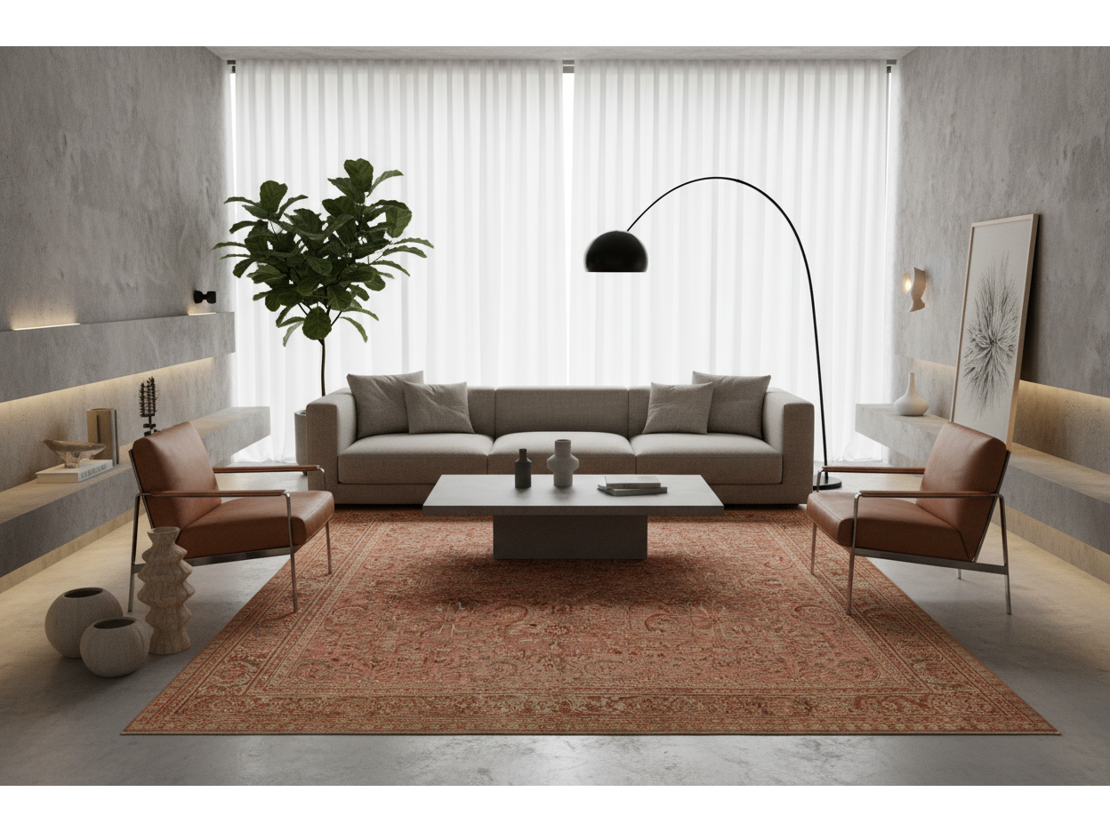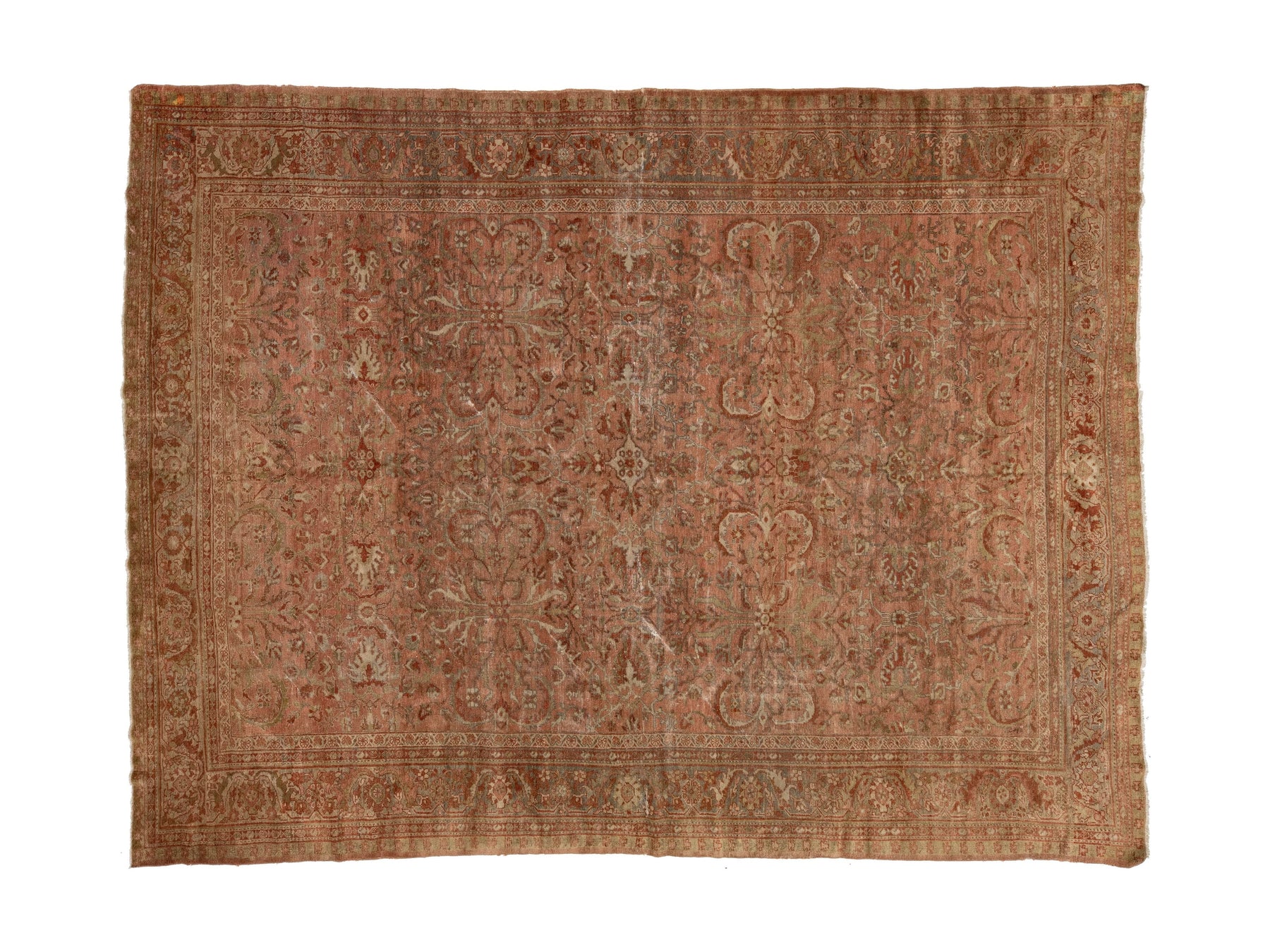 This rug is an Antique Persian Mahal (central Persia), likely dating from the late 19th or early 20th century (circa 1890–1920). It features a classic all-over palmette and floral vine lattice design. The "low pile" and distressed aesthetic—often called a "distressed" or "shabby chic" look—is currently very popular in high-end interior design for its muted, timeworn patina. The field is a soft, sun-faded terracotta/brick red, complemented by a border of muted ochre, ivory, and soft sage. The natural vegetable dyes have aged gracefully into a mellow, "abrash" patina that creates a sense of depth and history. This rug measures 8'10" x 11'9".