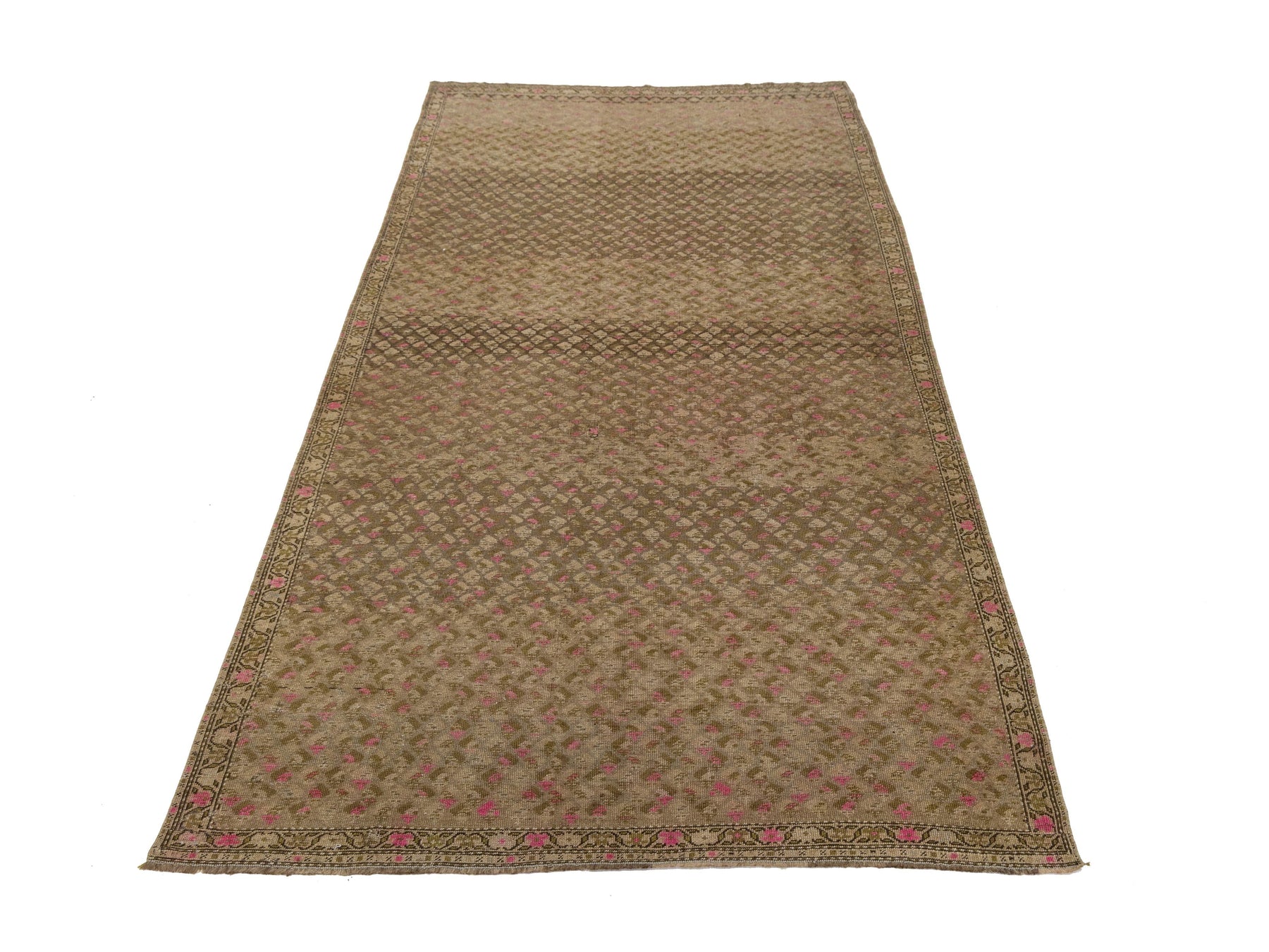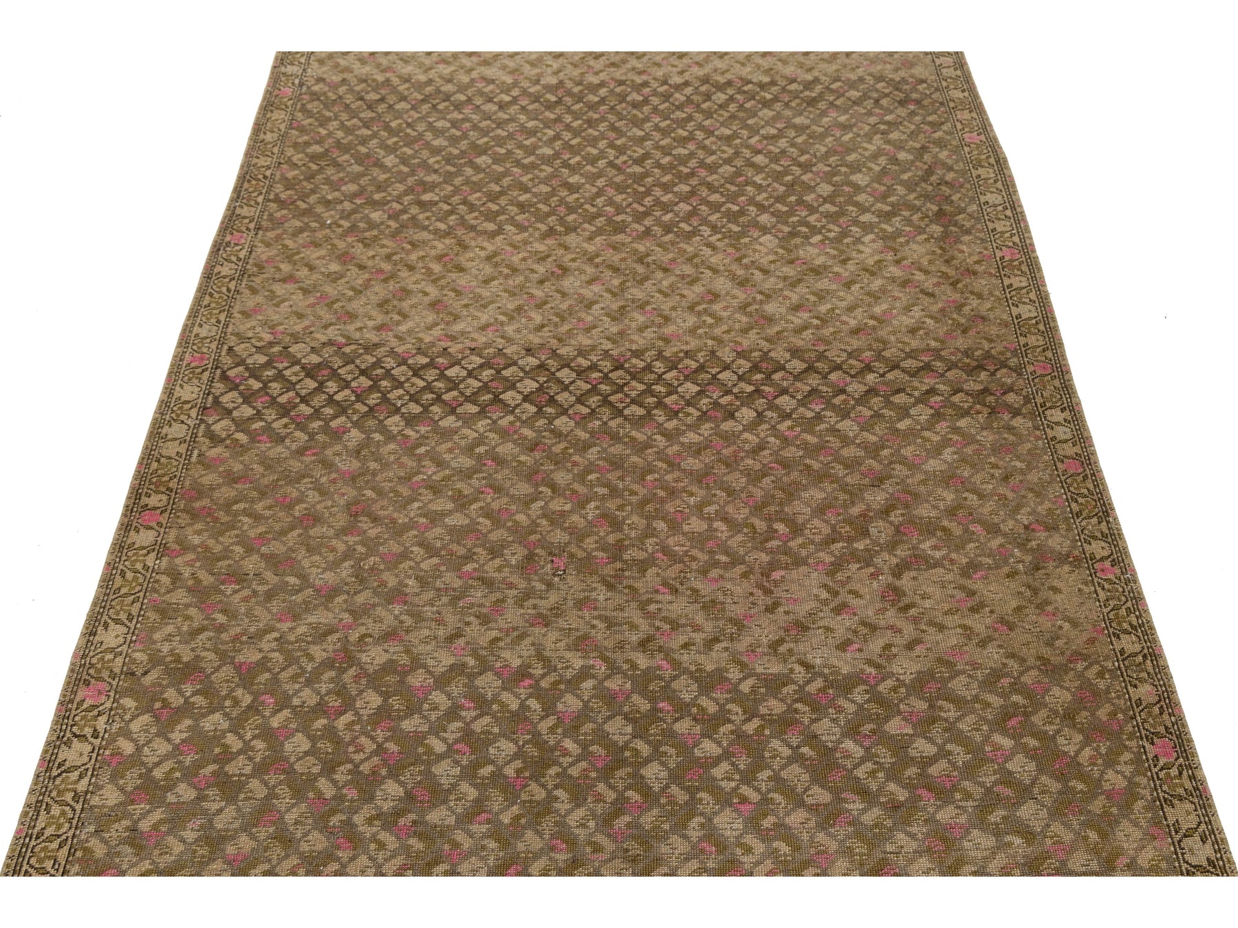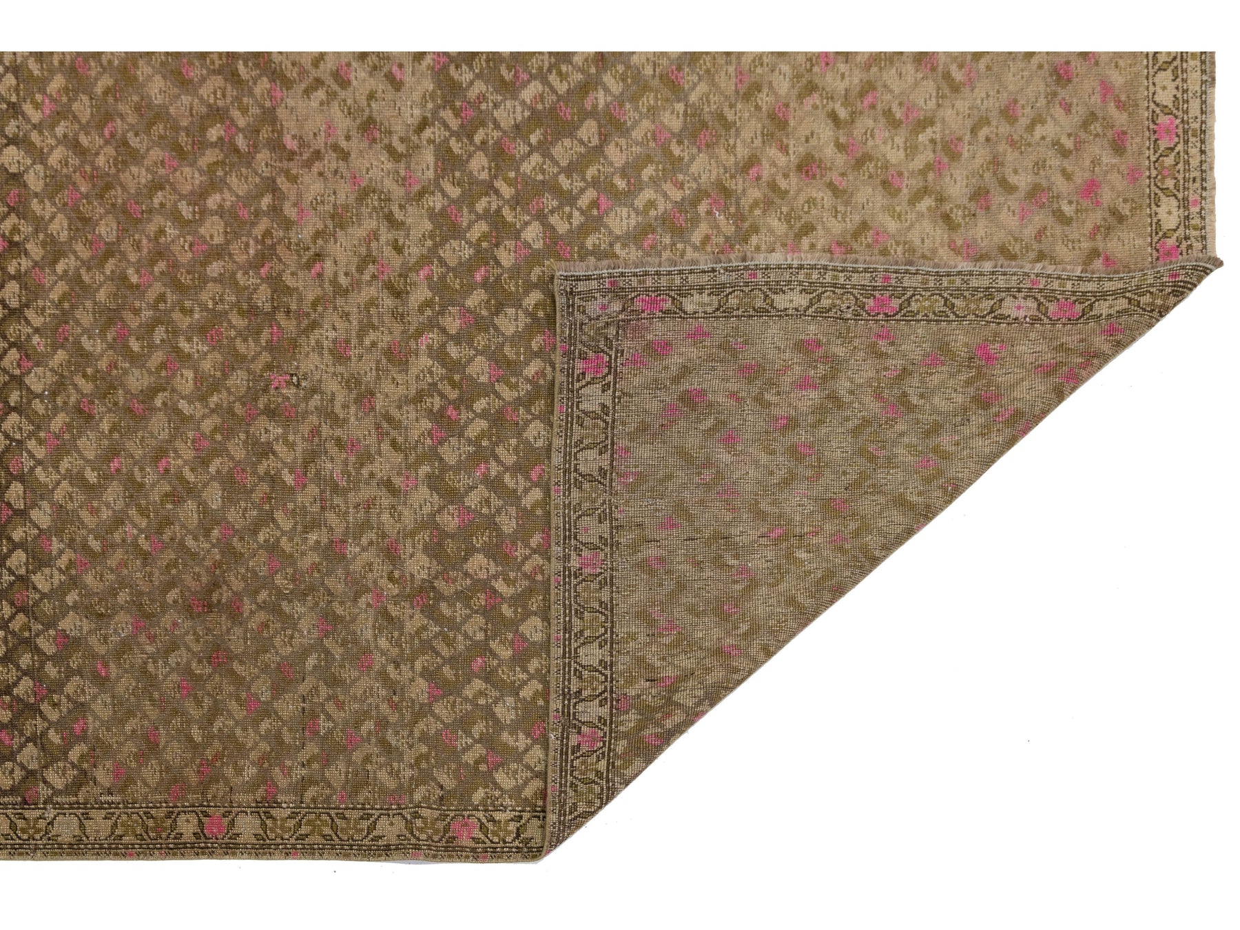 This antique Karadagh rug (often associated with the Barabagh region in the South Caucasus/Northwest Persia border) features a sophisticated, understated aesthetic. Characterized by a dense, all-over geometric repeat, the rug showcases a rhythmic "all-over" pattern of stylized motifs in muted earth tones, punctuated by charming pops of oxidized rose and madder pink. Its elongated proportions make it an ideal hallway runner or gallery rug for high-end rustic, transitional, or traditional interiors. This rug measures 5' x 10'4".