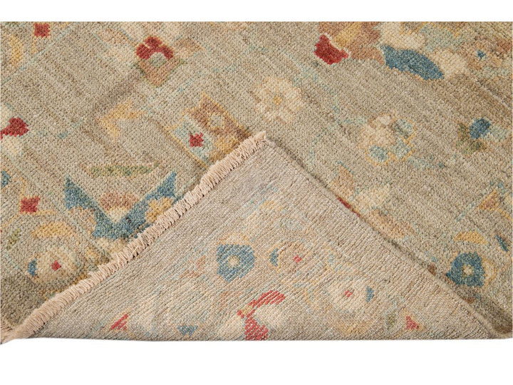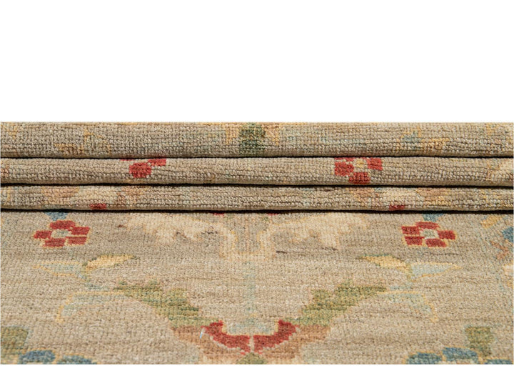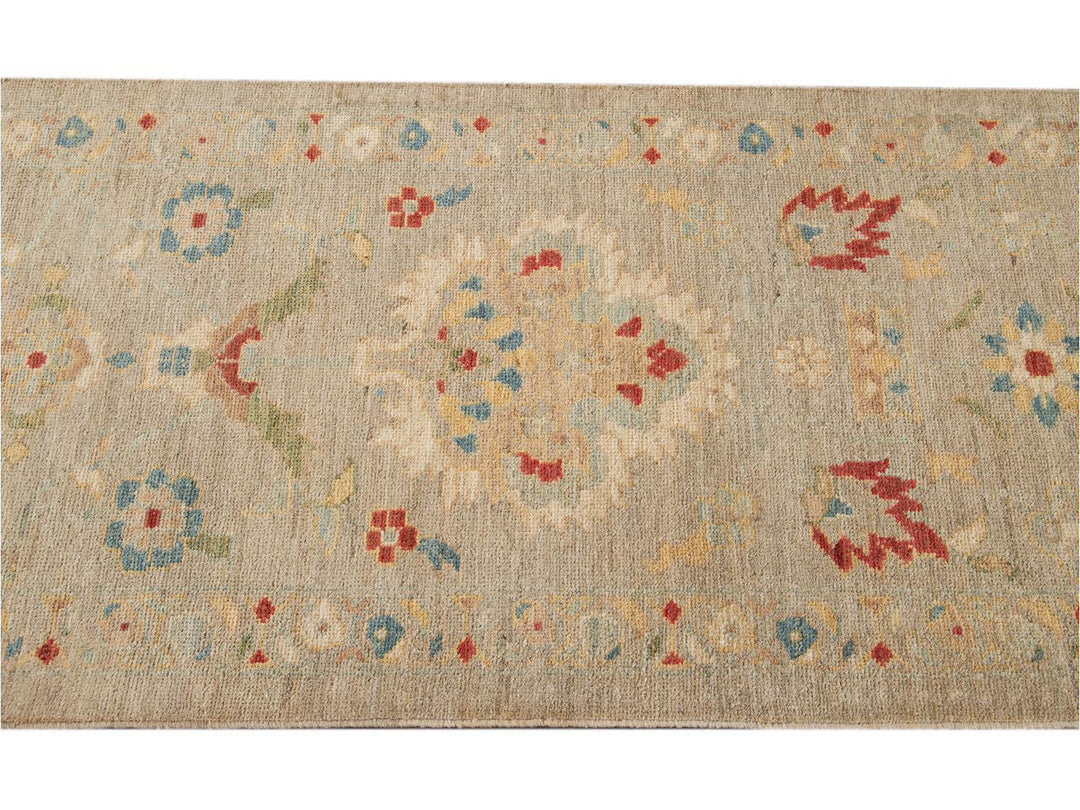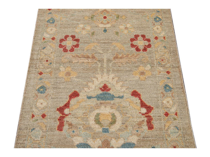 Beautiful contemporary Sultanabad runner rug, hand knotted wool with a tan field, ivory and red accents in an all-over design