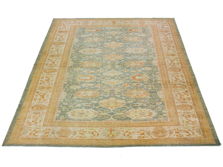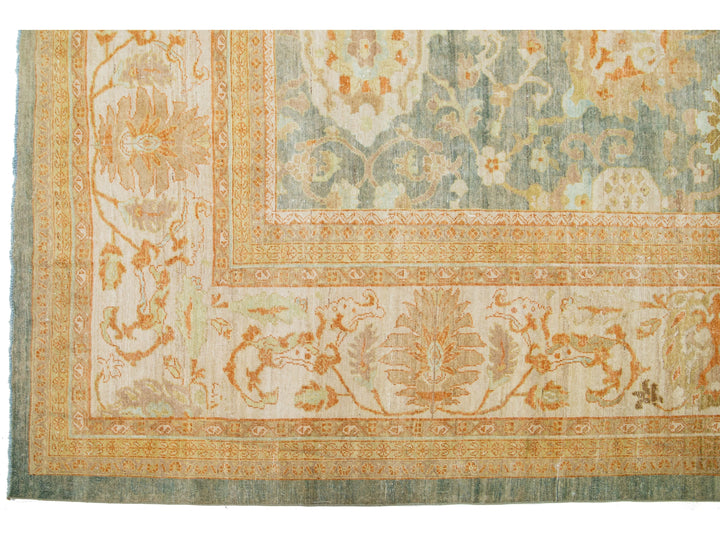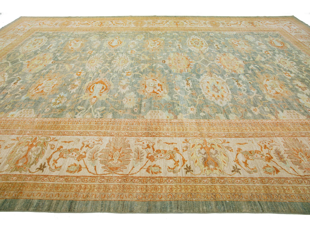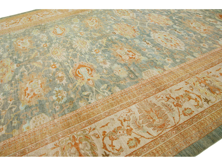 An exquisite antique Persian hand-knotted wool rug with a serene light blue color field radiates elegantly from its beige border enhanced by vibrant orange and green accents in a breathtaking all-over floral pattern. This exquisite work of art is 13'8" x 19'.