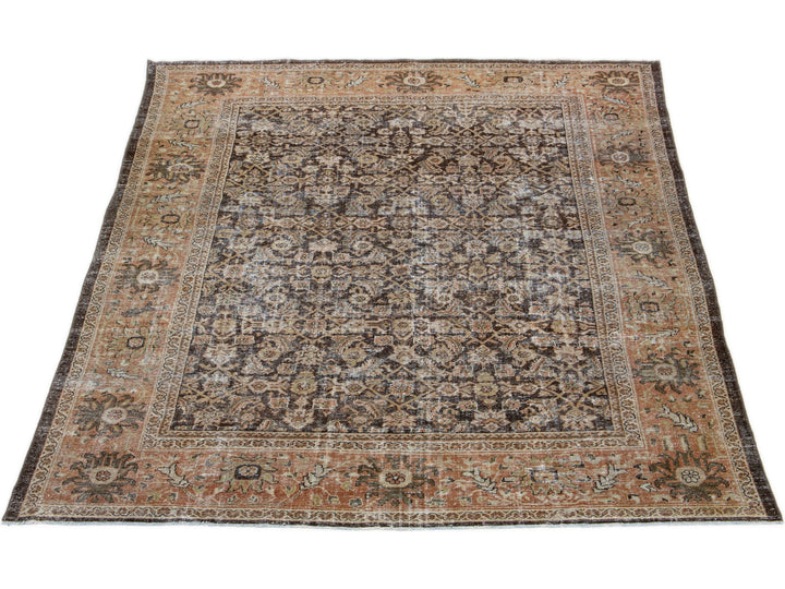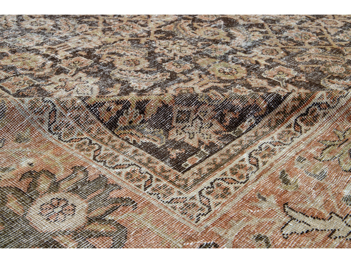 This exquisite antique Sultanabad wool rug from the 1900s is expertly hand-knotted. The brown field features captivating allover patterns in yellow, beige, and rust accents. Measures 10'1" x 13'8".