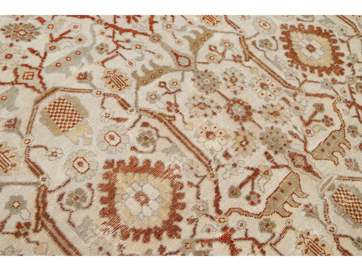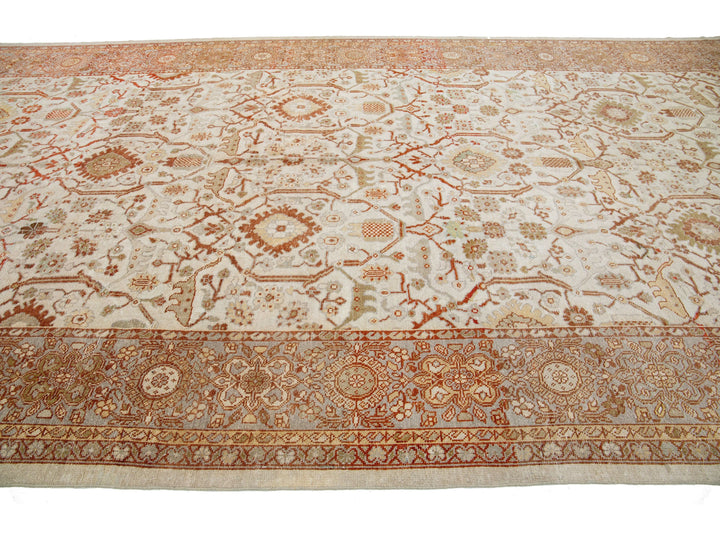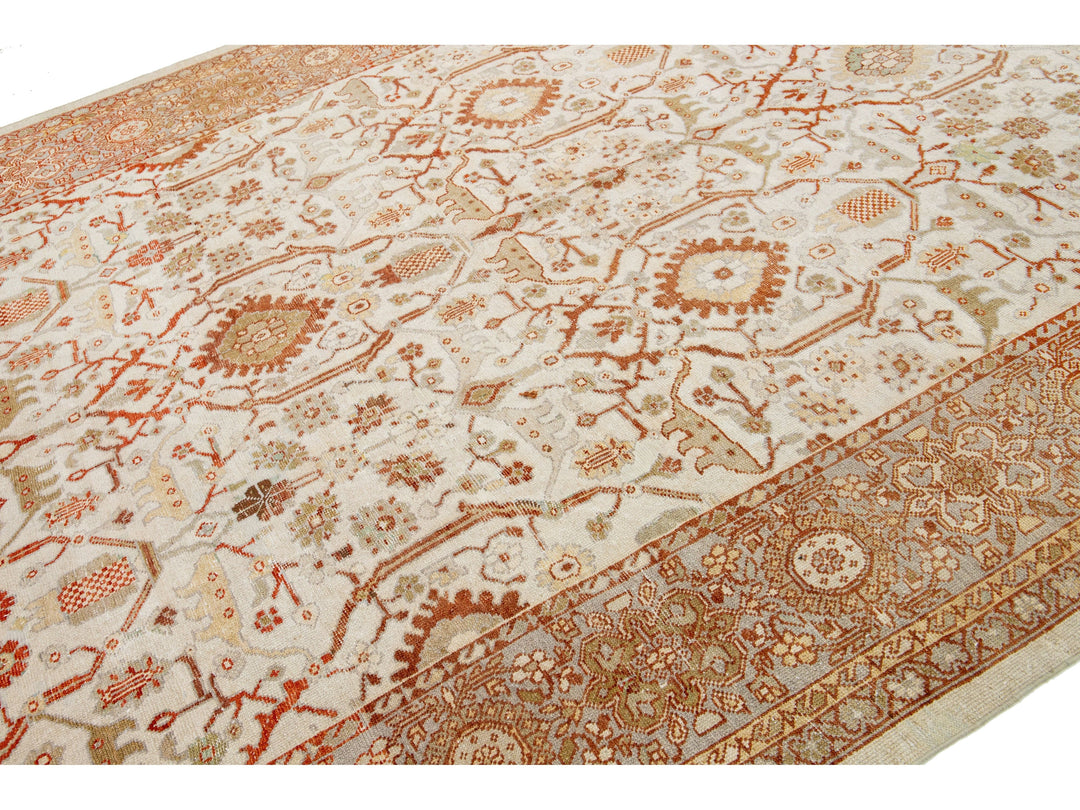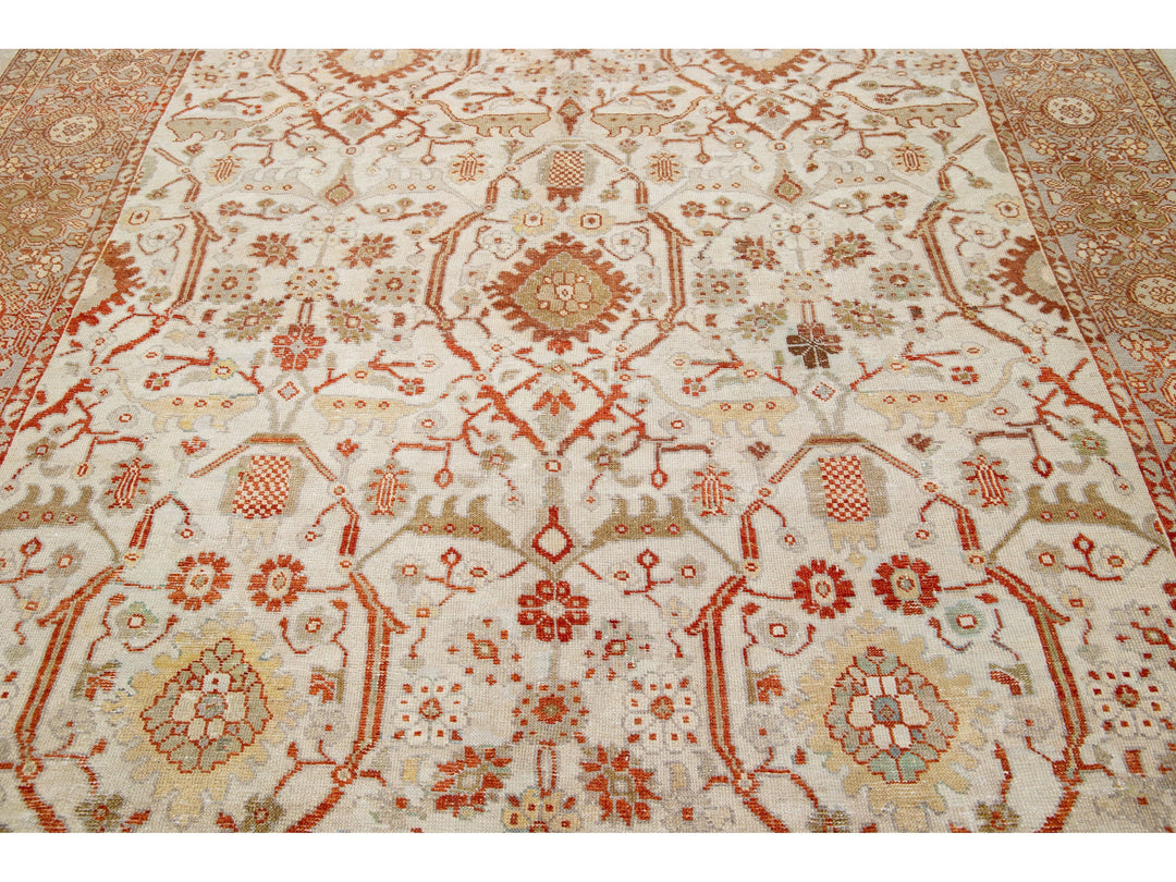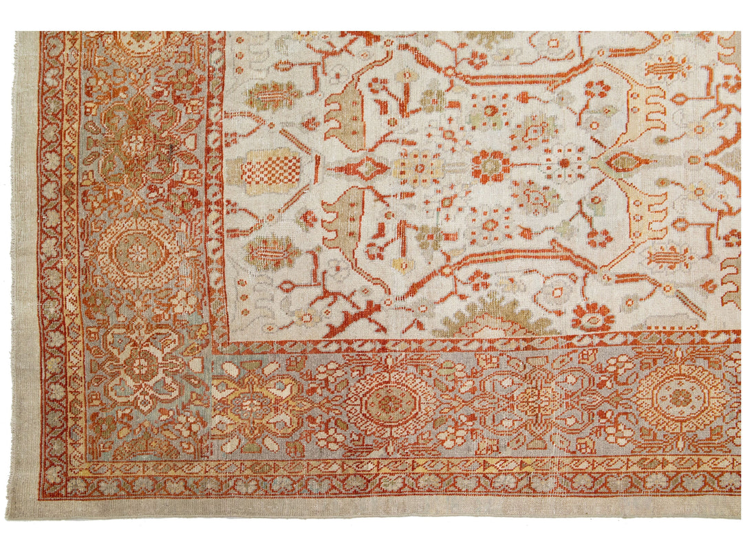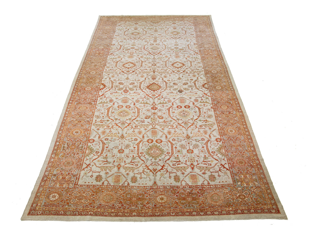 Luxuriously crafted with a timeless and alluring beige field, this exquisite antique Persian hand-knotted wool rug exhibits a captivating gray frame complete with orange and green accents, depicting an elegant all-over floral design. Boasting dimensions of 9'8" by 22'3", this luxurious piece brings a graceful sophistication to any abode.