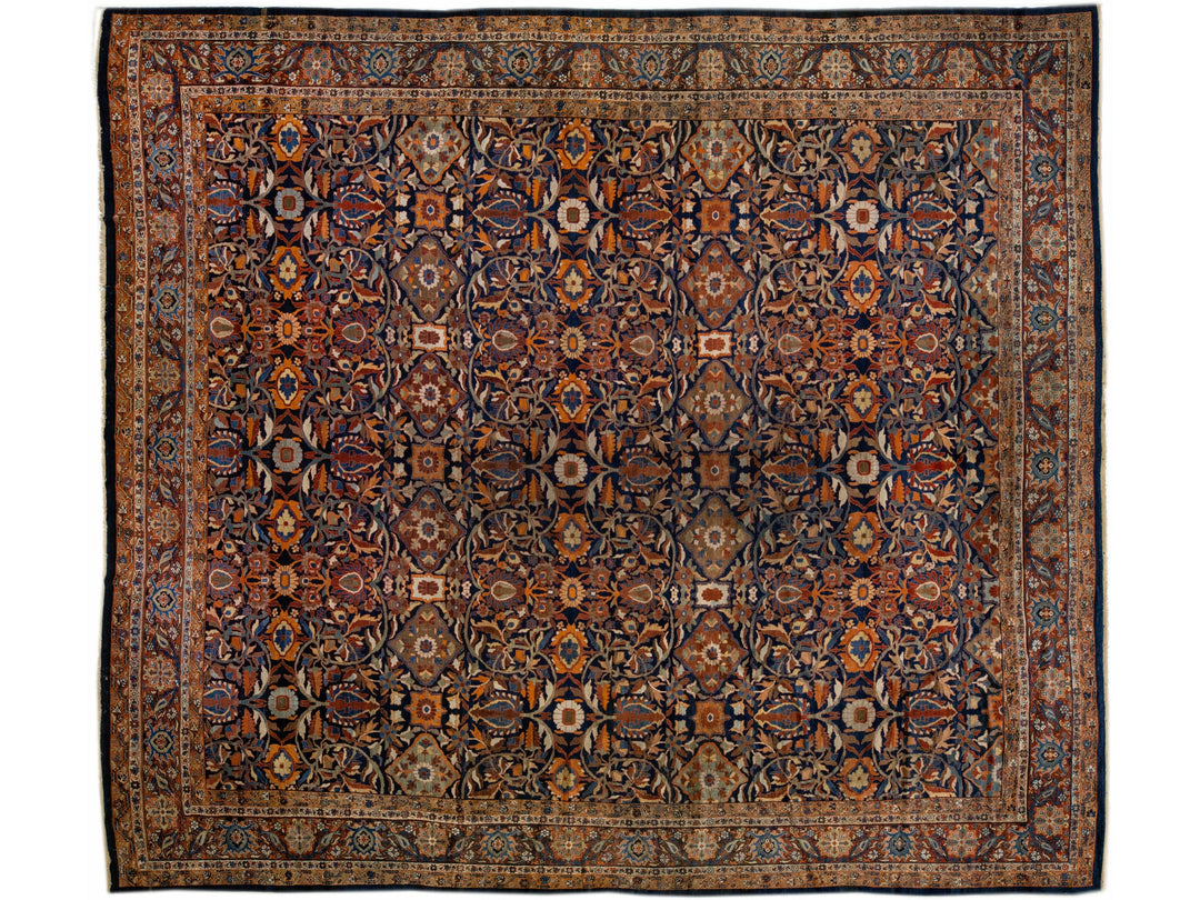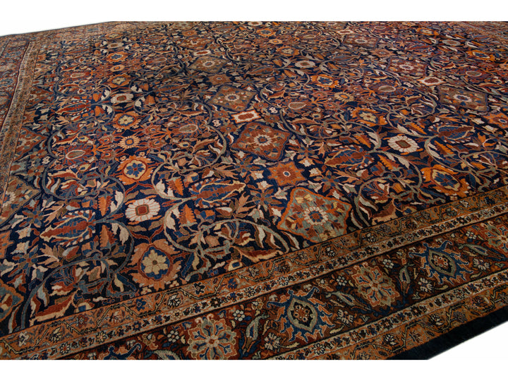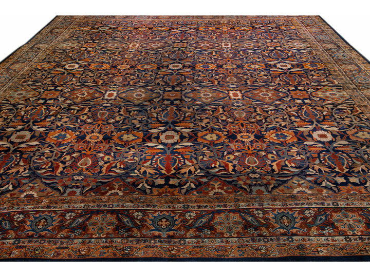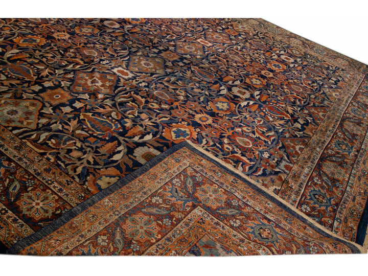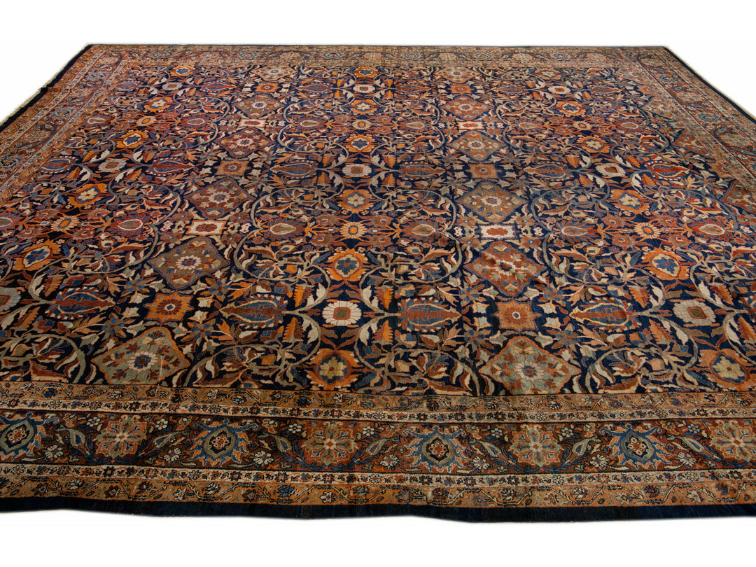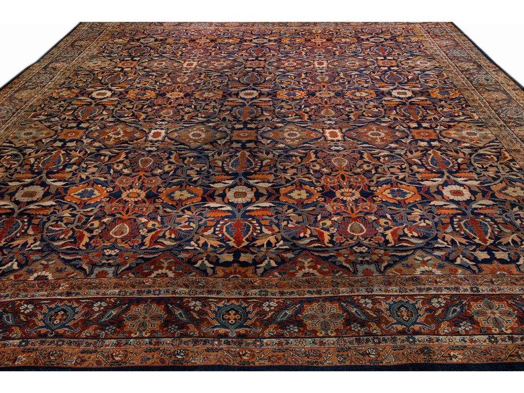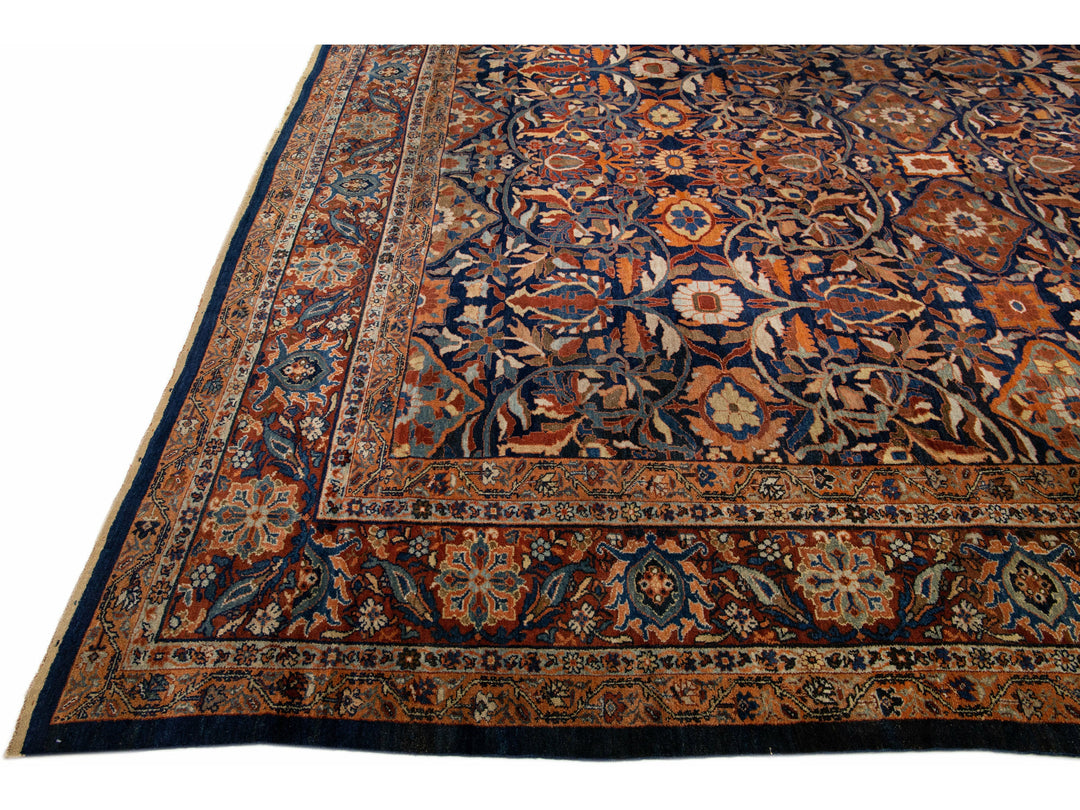 Beautiful antique Persian Sultanabad hand-knotted wool rug with a dark blue field. This piece has a red-orange color-designed frame with multicolor accents in a gorgeous all-over floral pattern design.