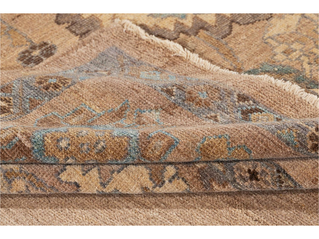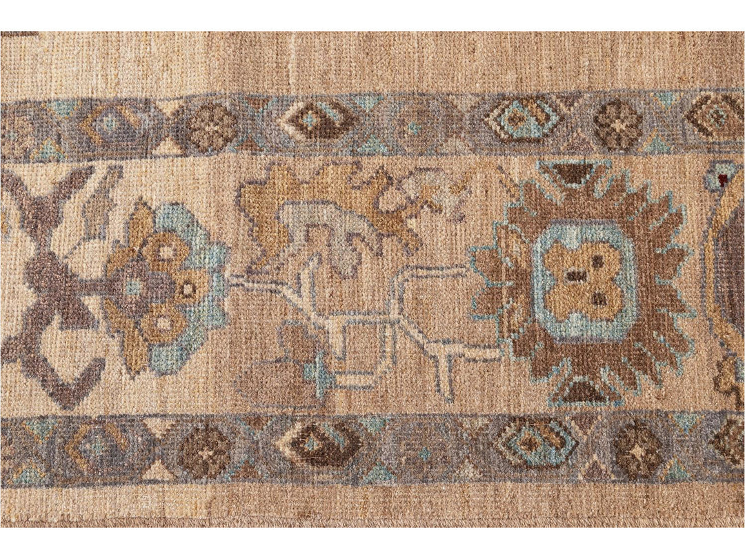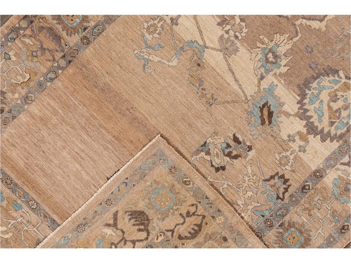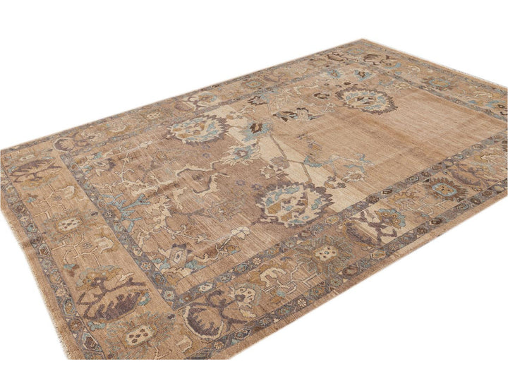 A hand-knotted Sultanabad rug with a floral design and border on a brown field. Accents of beige, blue and dark brown throughout.