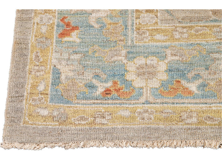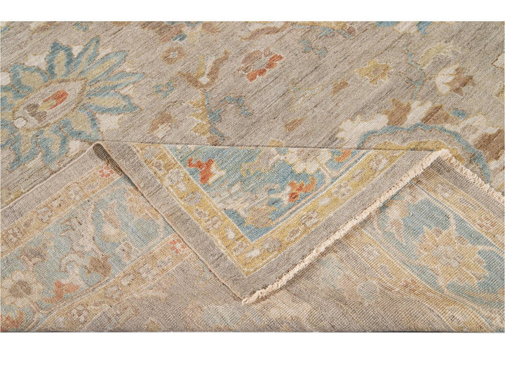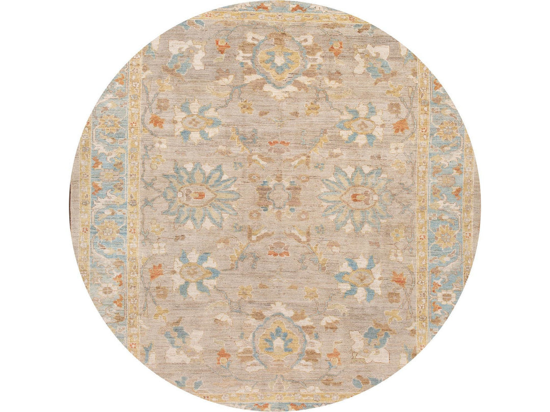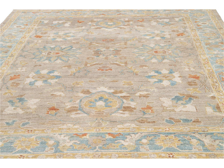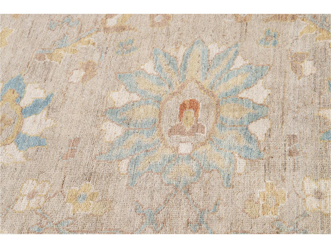 Beautiful contemporary Sultanabad rug, hand knotted wool with a tan field, blue and ivory accents in an all-over design.