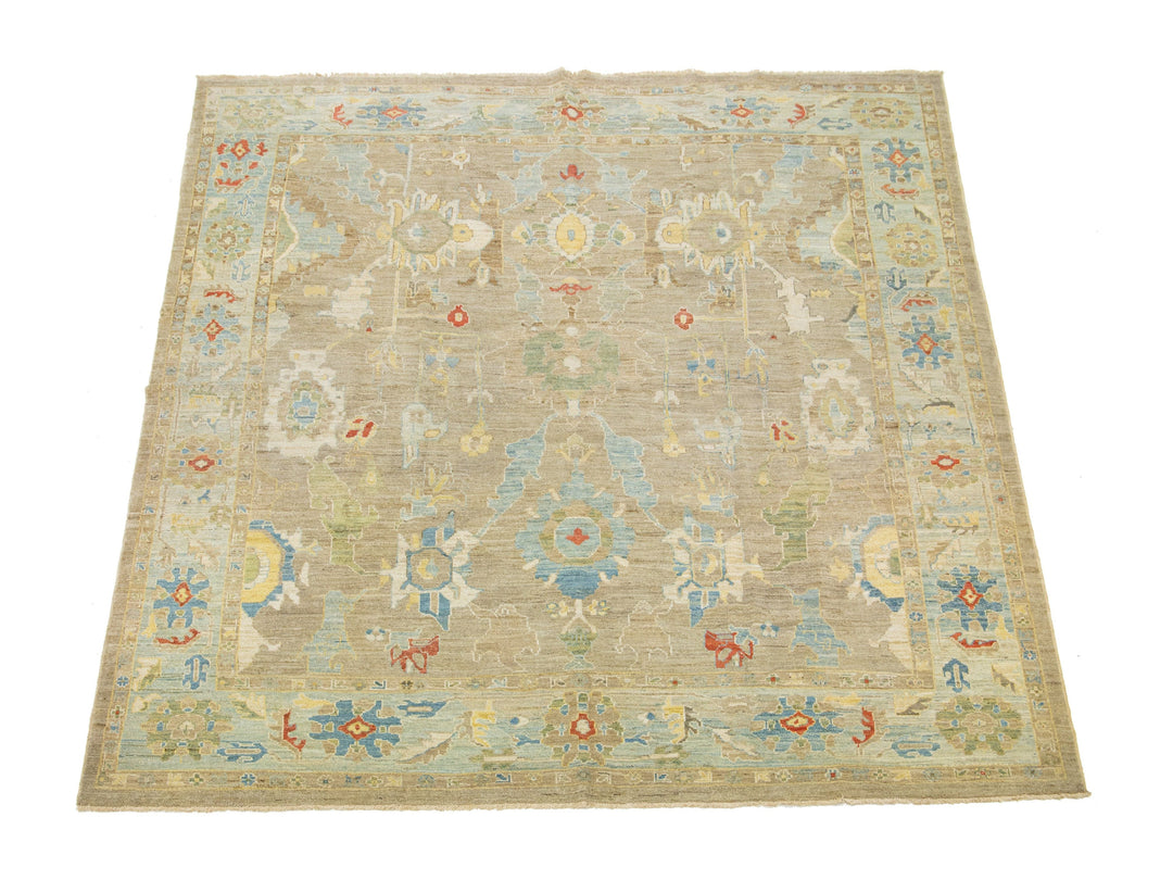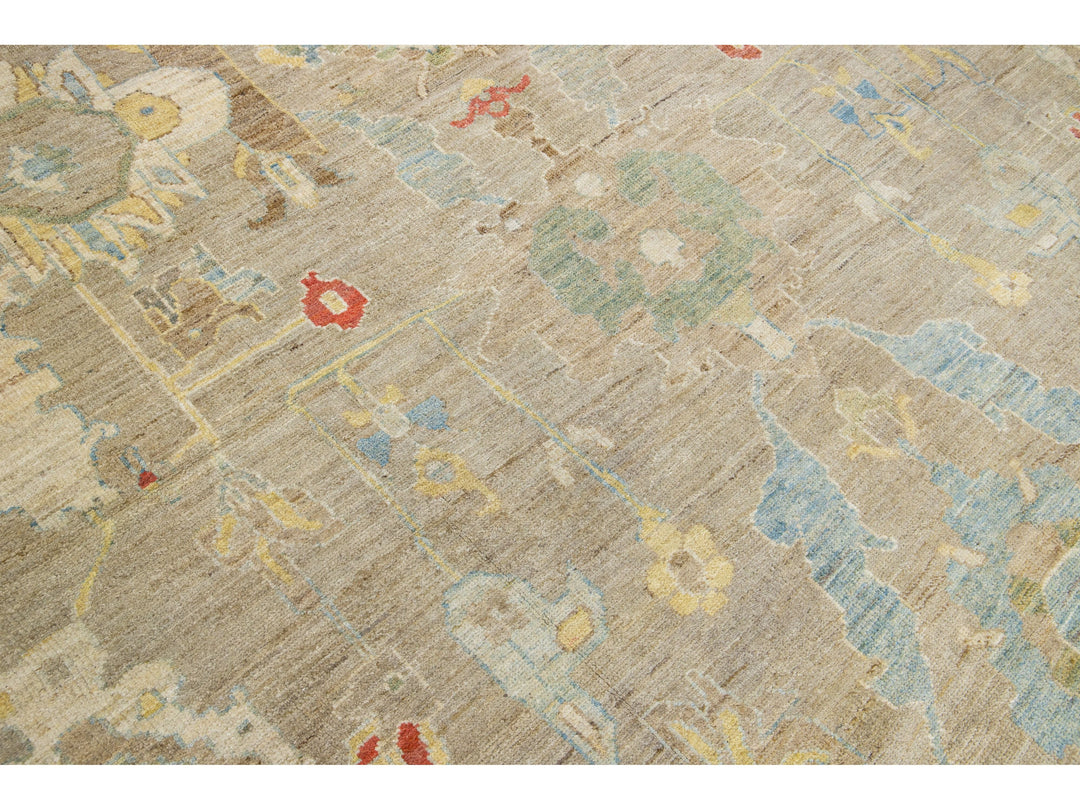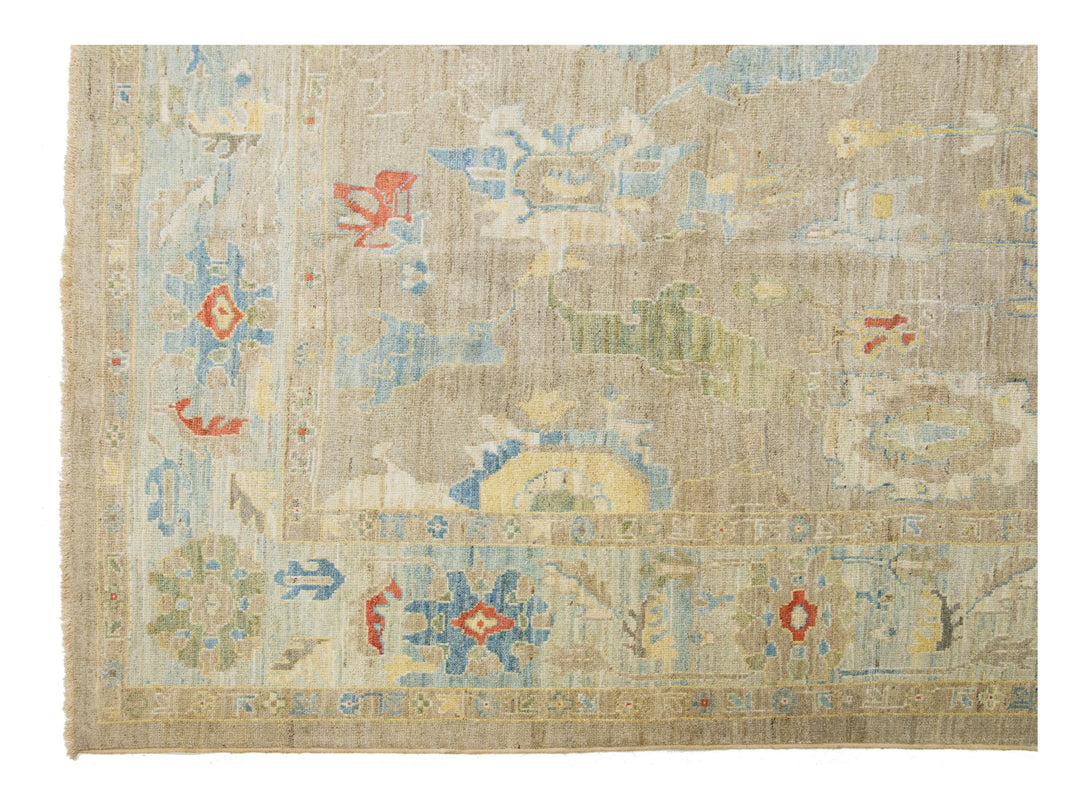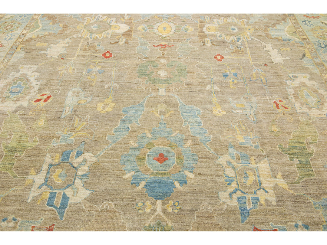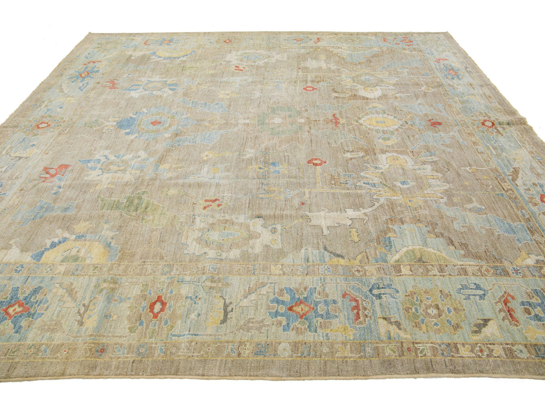 Beautiful modern Sultanabad hand-knotted wool rug with a beige field. This Sultanabad rug has a blue frame and multicolor accents in a gorgeous all-over classic floral pattern design.