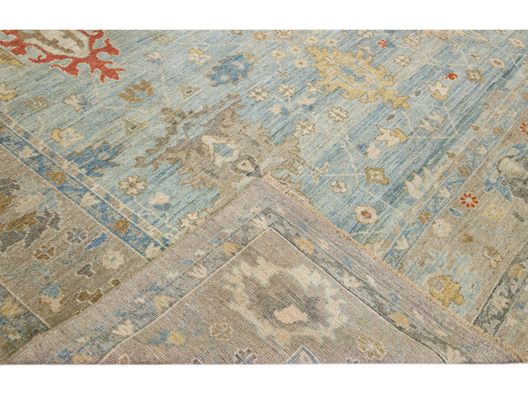 Beautiful modern Sultanabad hand-knotted wool rug with a light blue field. This Sultanabad rug has a brown frame and multicolor accents in a gorgeous all-over classic floral pattern design.