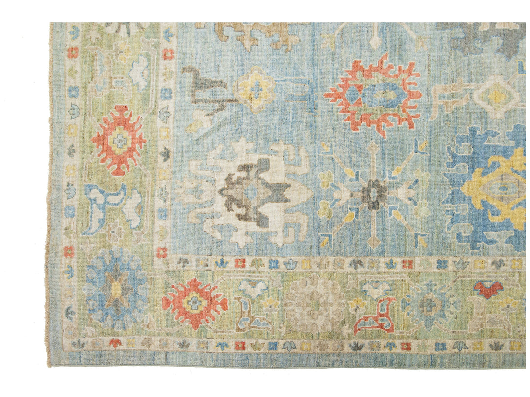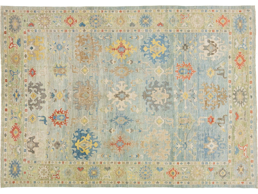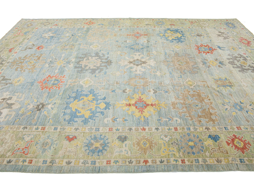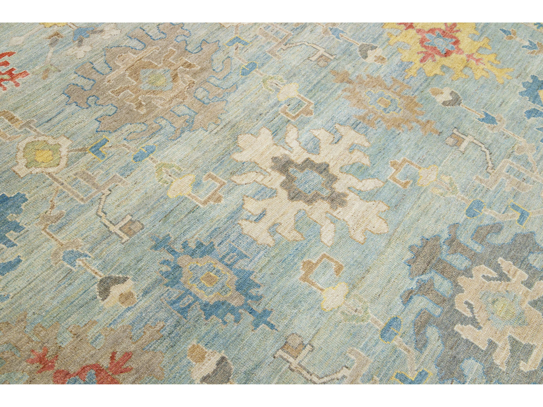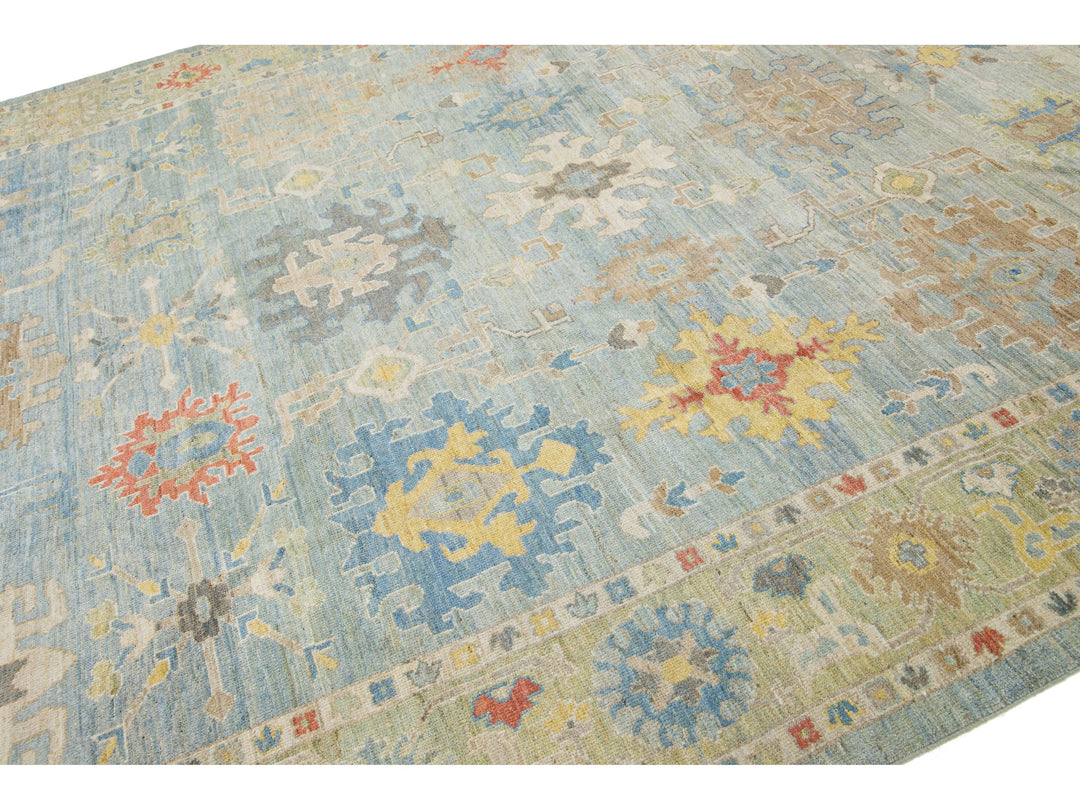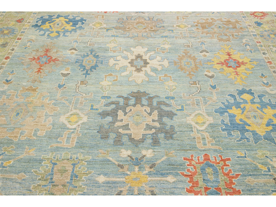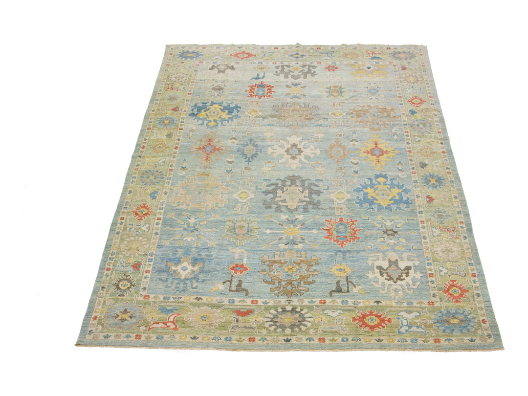 Beautiful modern Sultanabad hand-knotted wool rug with a light blue field. This Sultanabad rug has a beige frame and multicolor accents in a gorgeous all-over classic floral pattern design.