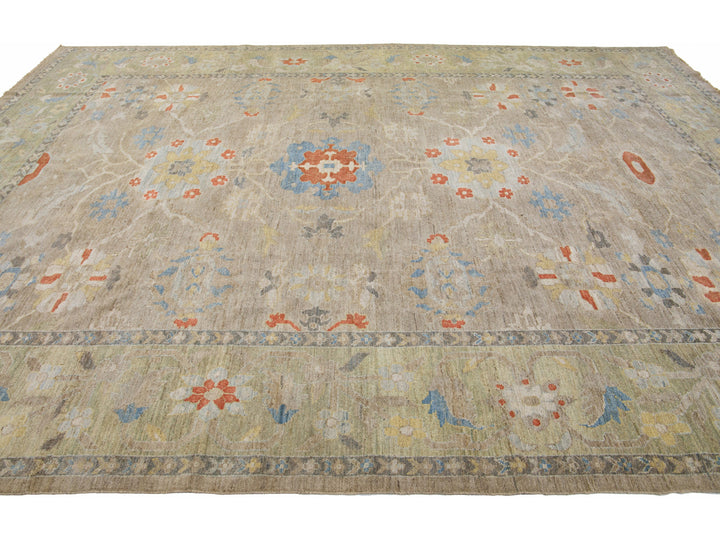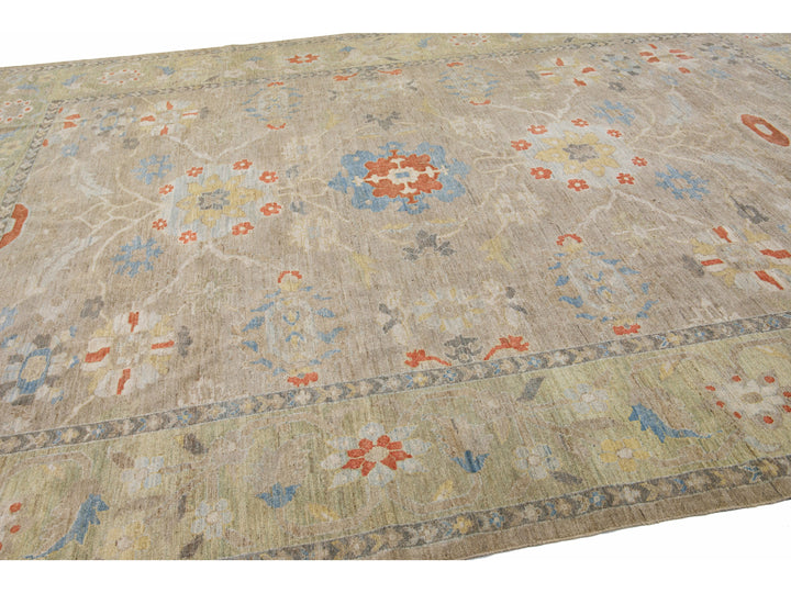 Beautiful modern Sultanabad hand-knotted wool rug with a beige field. This Sultanabad rug has a green frame and multicolor accents in a gorgeous all-over classic floral pattern design.