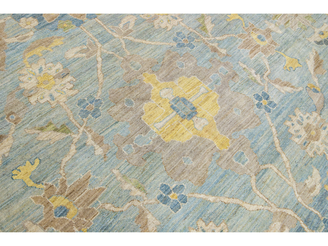 This Sultanabad classic style has been meticulously transformed into a contemporary masterpiece. Crafted with great care, this magnificent wool rug is a blue field. Its frame has a floral motif. To enhance its elegance, it incorporates a design of multicolored accents.
