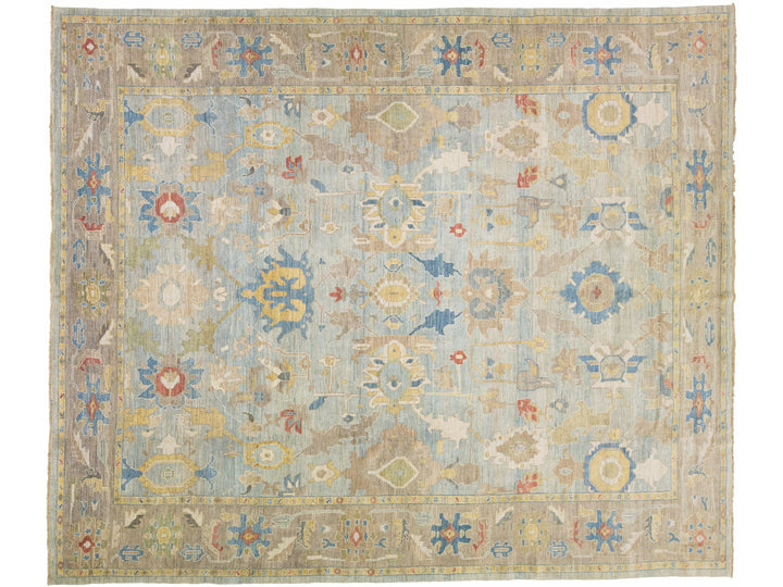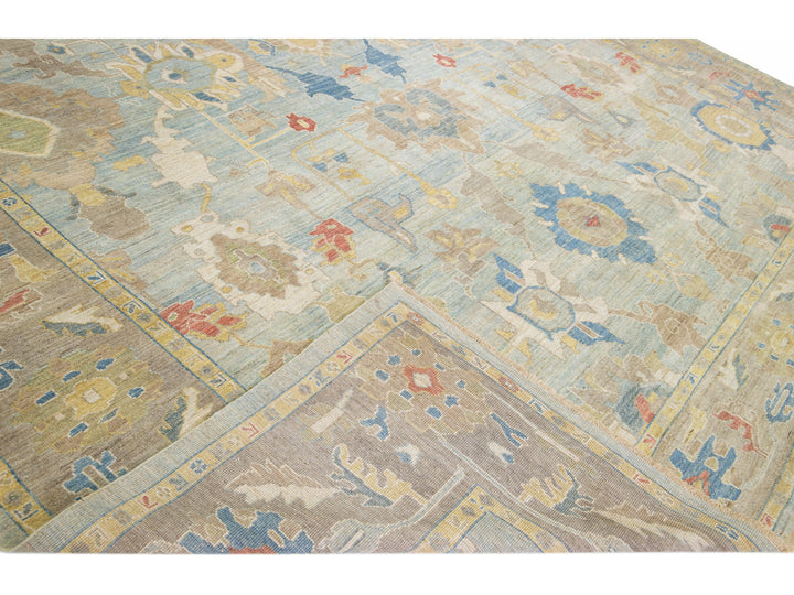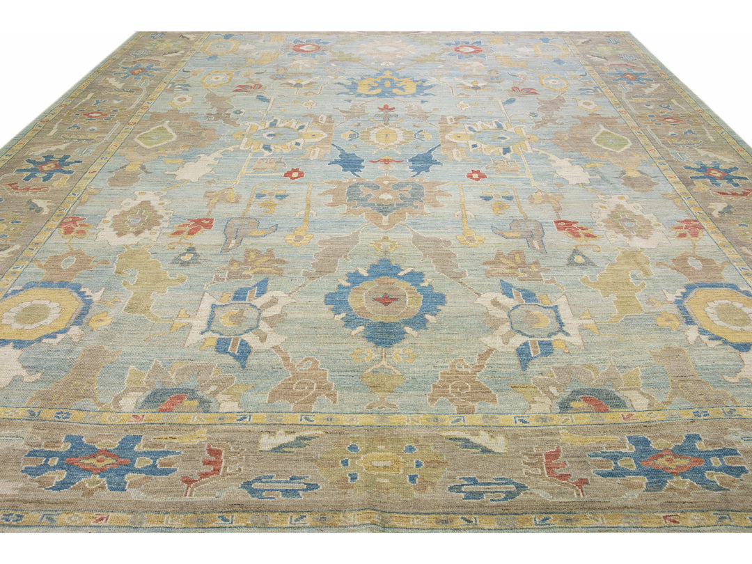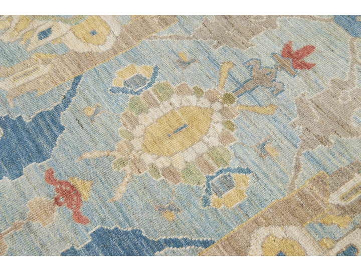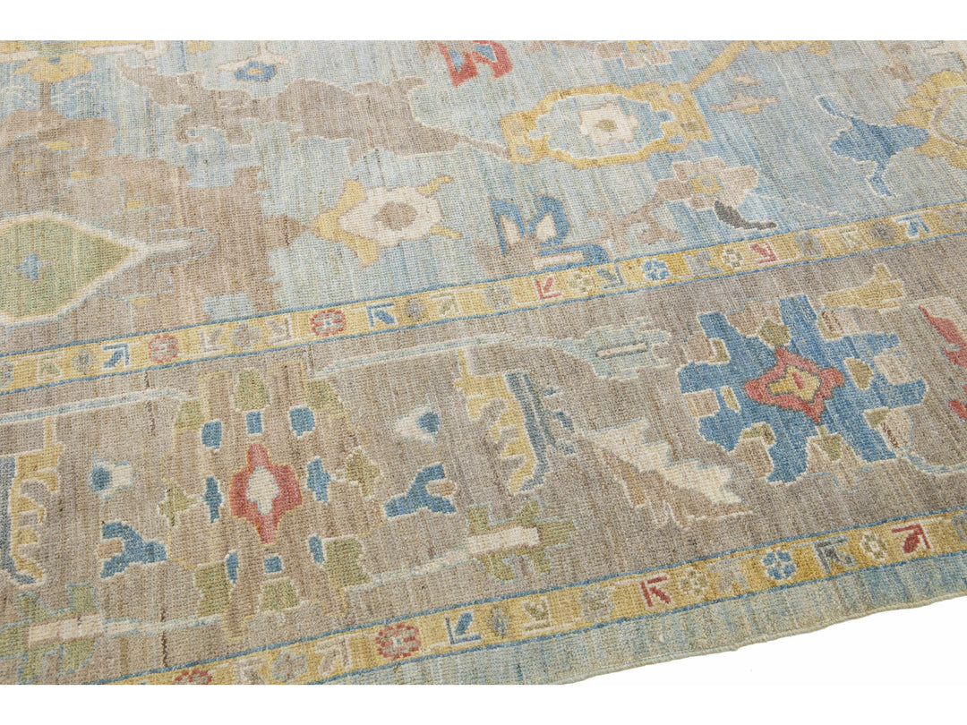 Beautiful modern Sultanabad hand-knotted wool rug with a blue field. This Sultanabad rug has a brown frame and multicolor accents in a gorgeous all-over classic floral pattern design.