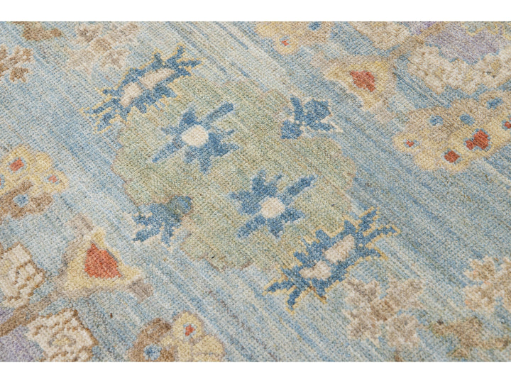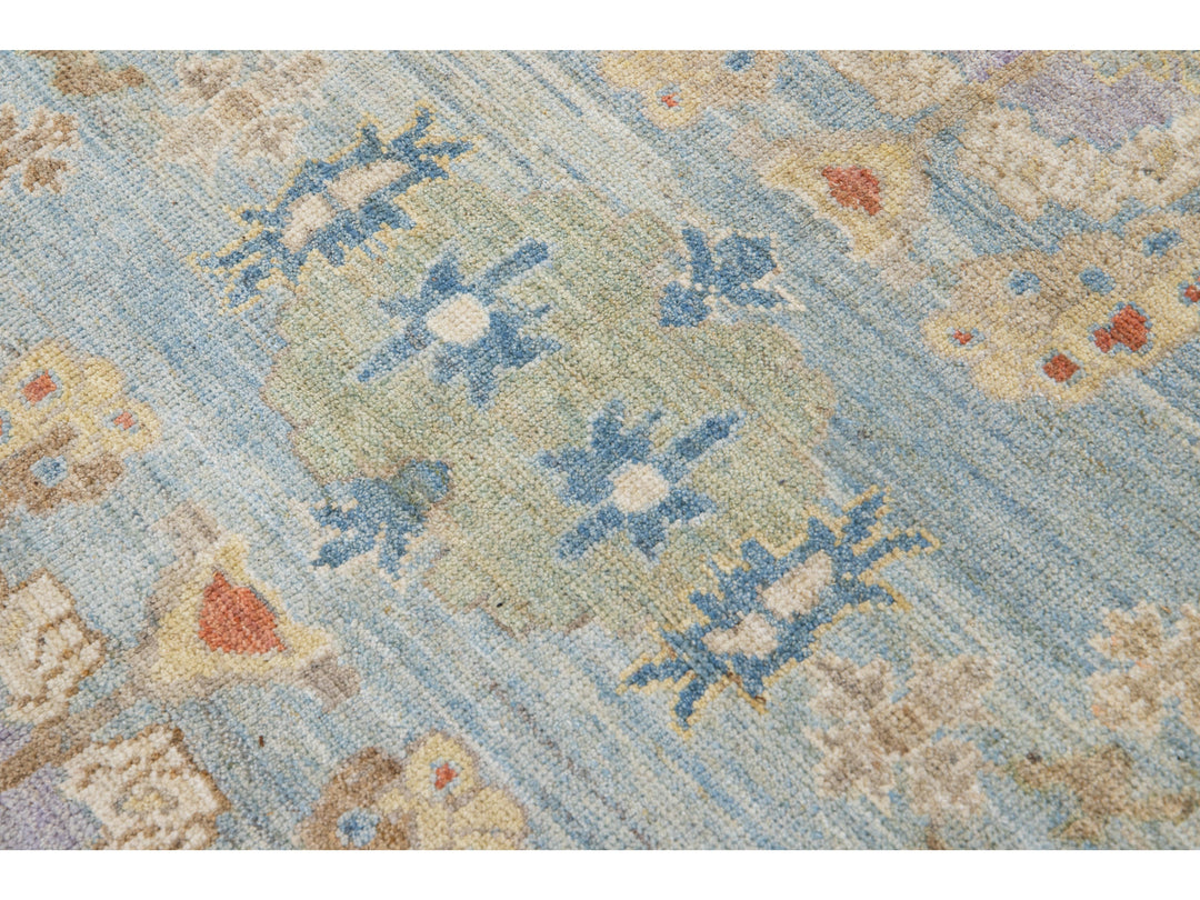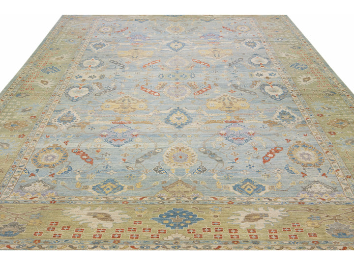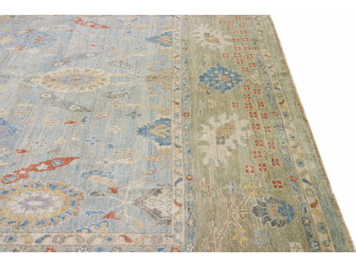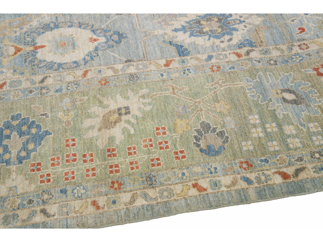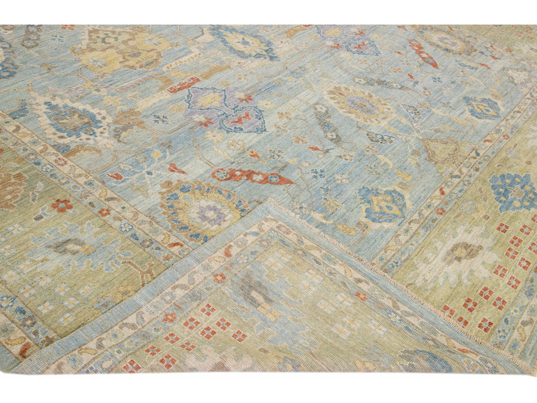 Beautiful modern Sultanabad hand-knotted wool rug with a blue field. This Sultanabad rug has a green frame and multicolor accents in a gorgeous all-over classic floral pattern design.