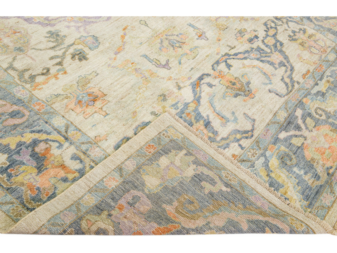 Beautiful modern Sultanabad hand-knotted wool rug with a beige field. This Sultanabad rug has a blue frame and multicolor accents in a gorgeous all-over classic floral pattern design.