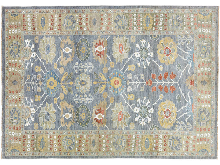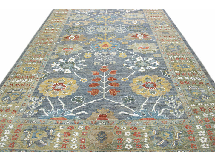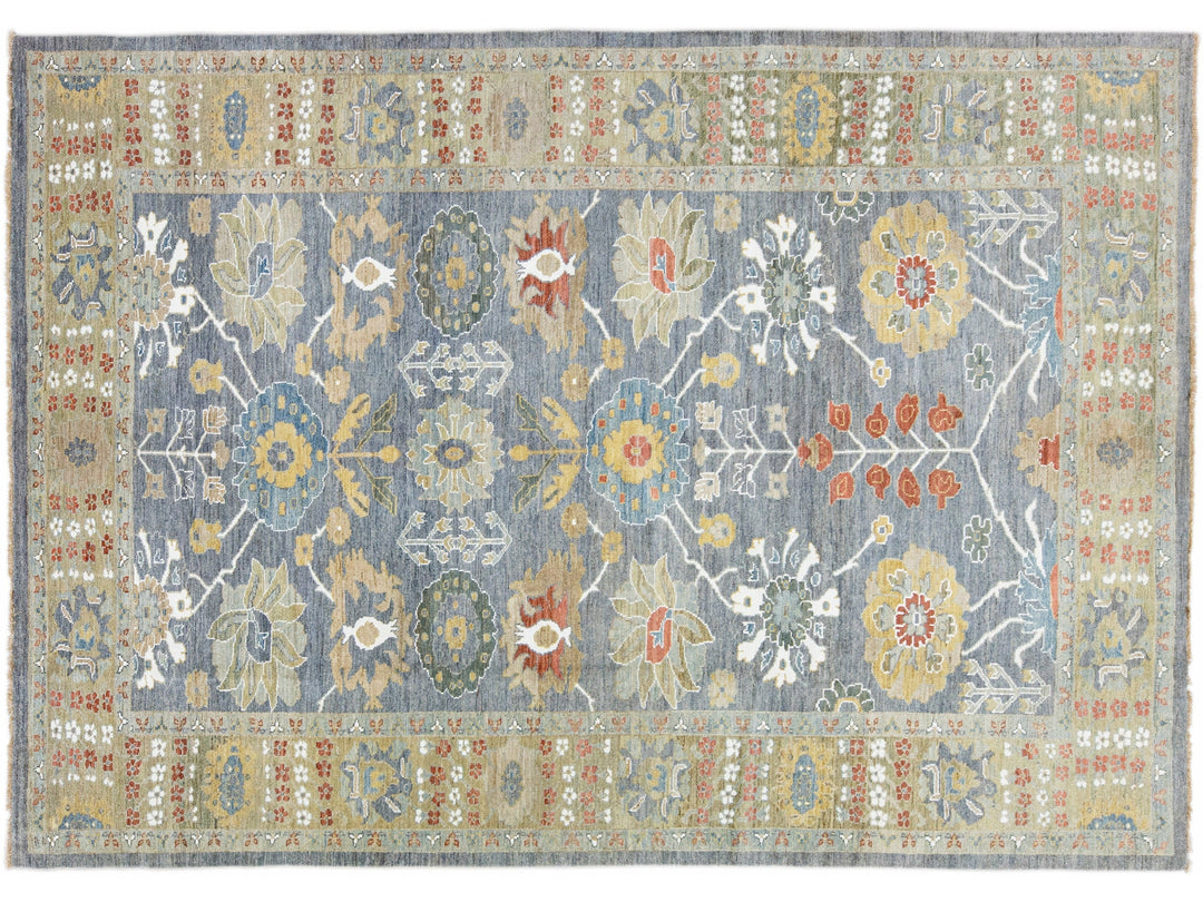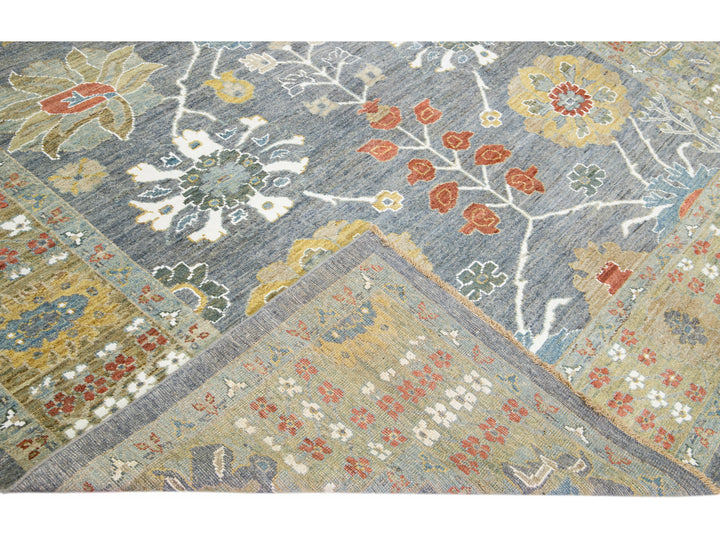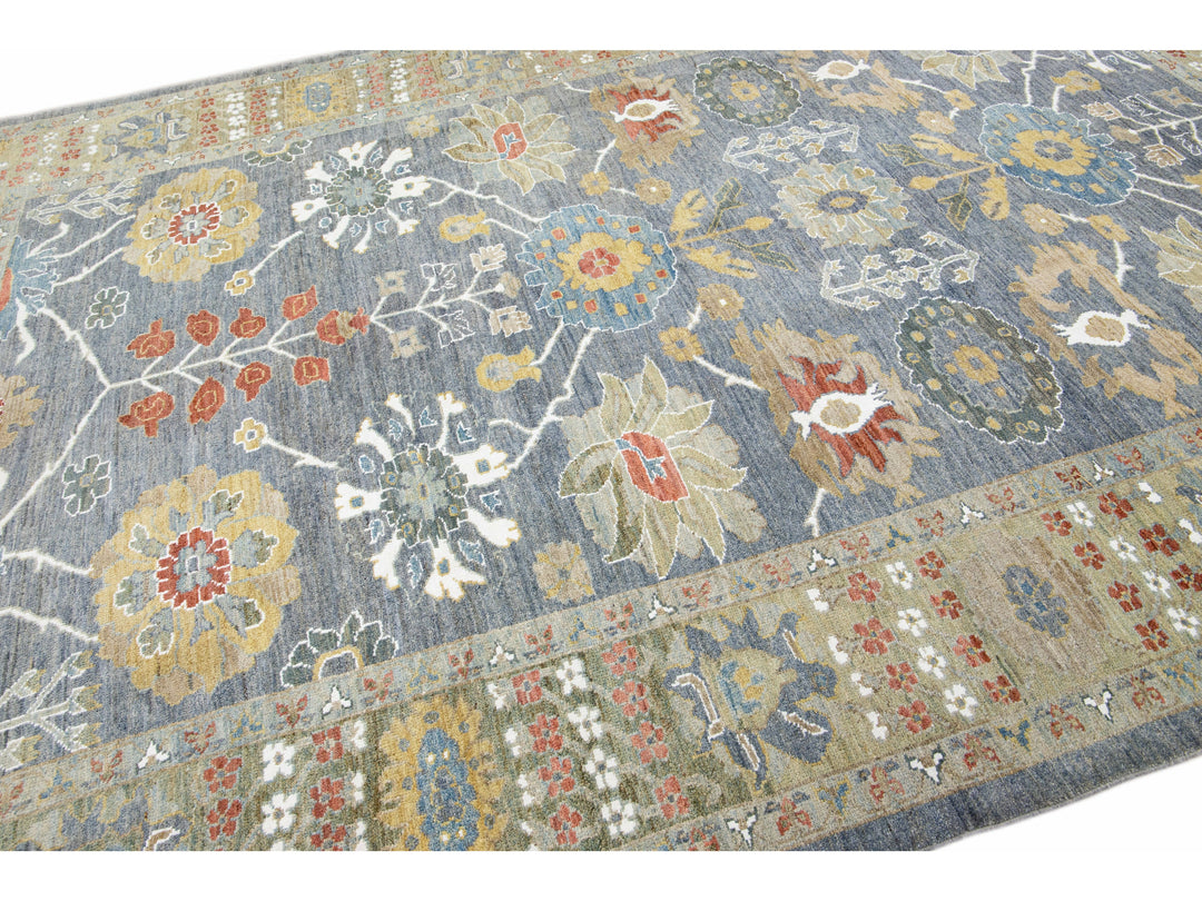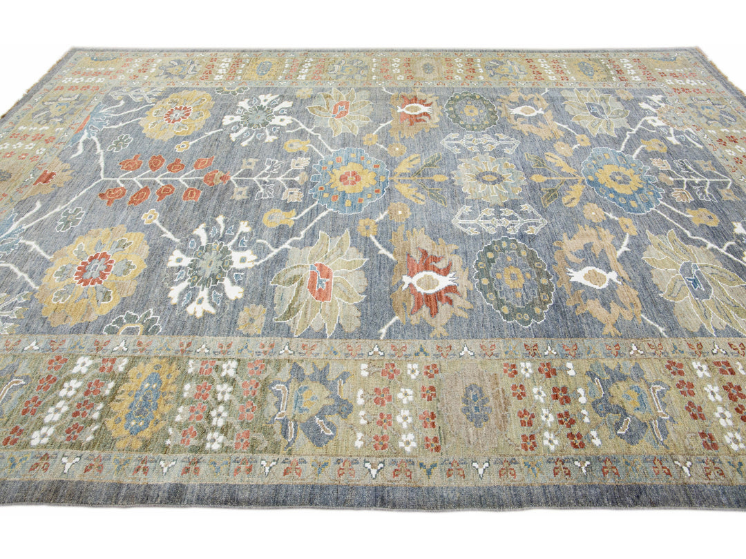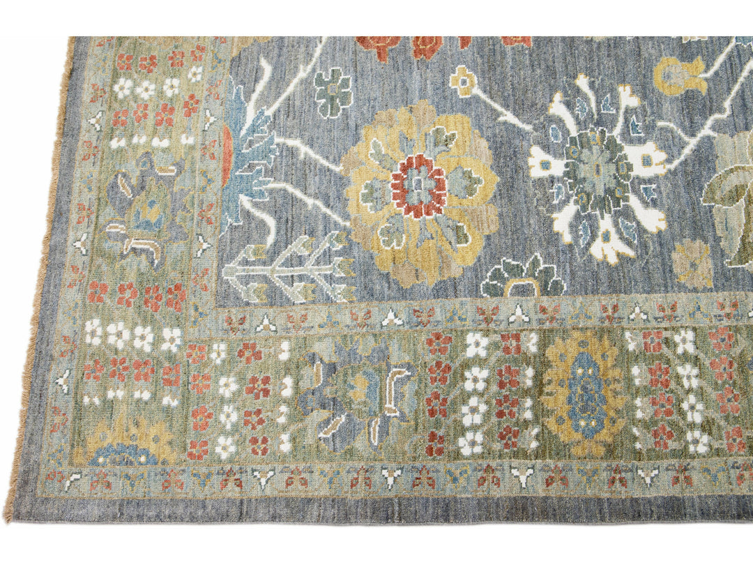 Beautiful modern Sultanabad hand-knotted wool rug with a blue field. This Sultanabad rug has a green frame and multicolor accents in a gorgeous all-over classic floral pattern design.