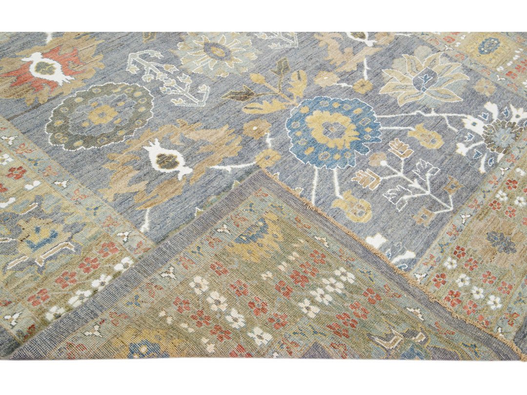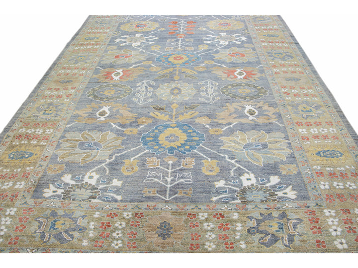 Beautiful modern Sultanabad hand-knotted wool rug with a blue field. This Sultanabad rug has a green frame and multicolor accents in a gorgeous all-over classic floral pattern design.