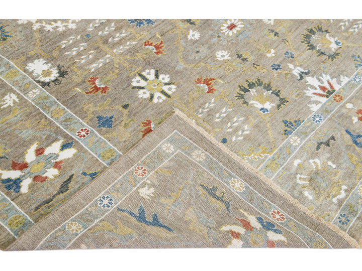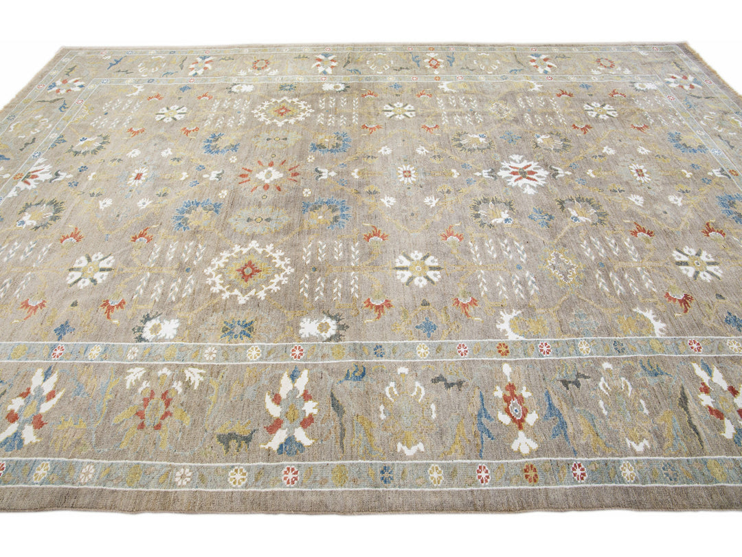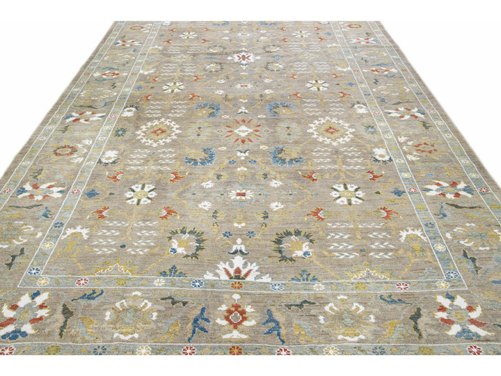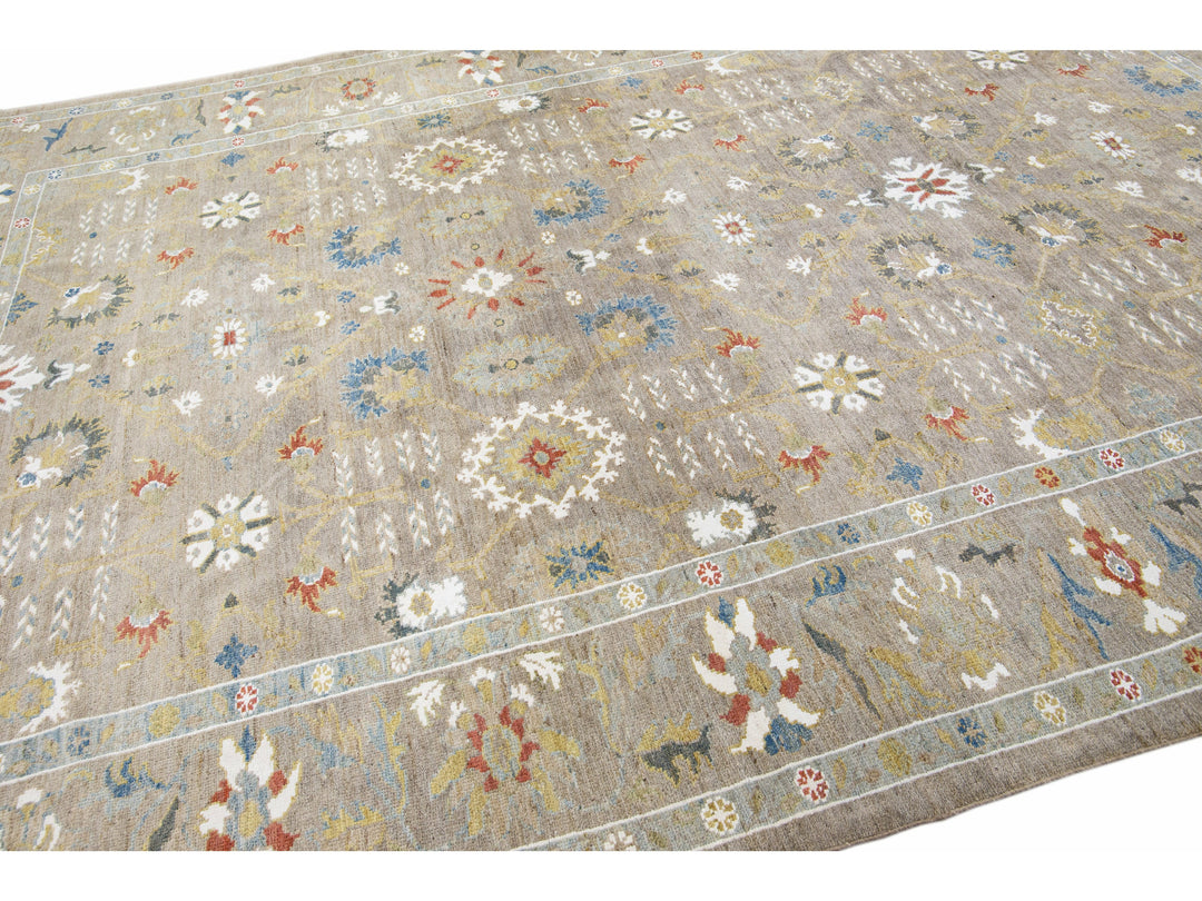 Beautiful modern Sultanabad hand-knotted wool rug with a light brown field. This Sultanabad rug has multicolor accents in a gorgeous all-over classic floral pattern design.