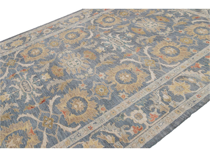 A beautiful 21st century modern Persian Sultanabad, a hand-knotted rug with a light blue and tan motif and border. This collection is of wool and made in Iran.
