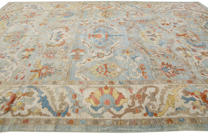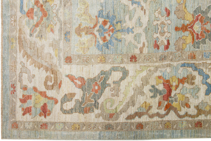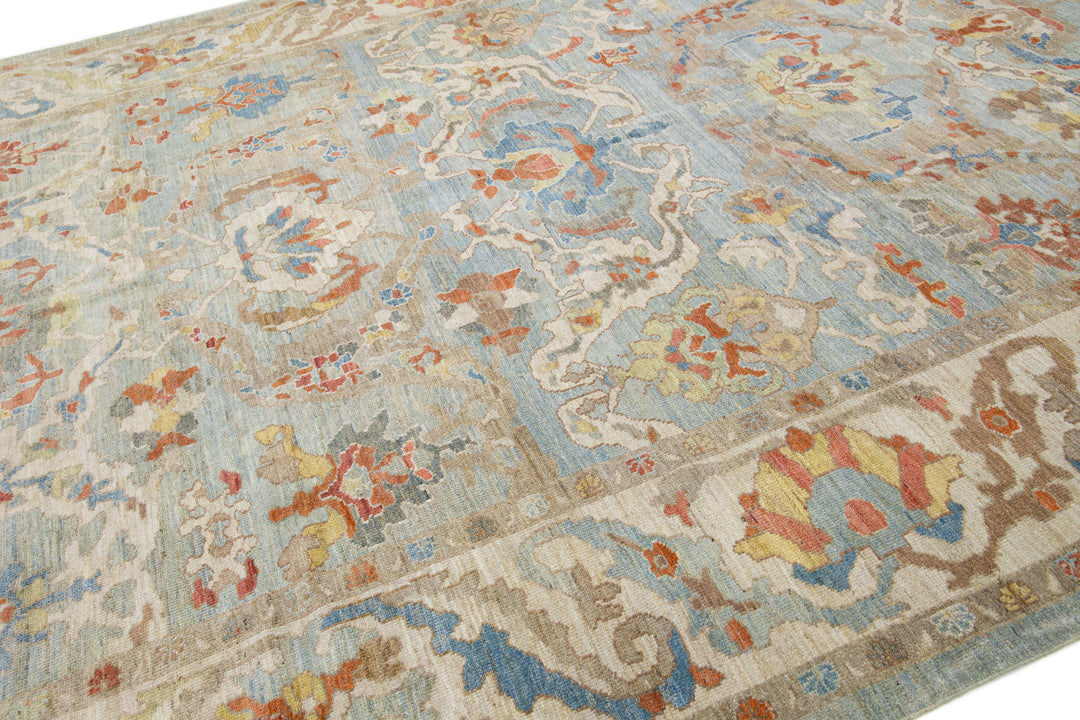 This exquisite hand-knotted wool rug, boasting a captivating blue color field, is a contemporary rendition of the classic Sultanabad style. Its intricately designed beige frame is complemented by an all-over floral motif featuring multicolored accents that add to its resplendent charm.