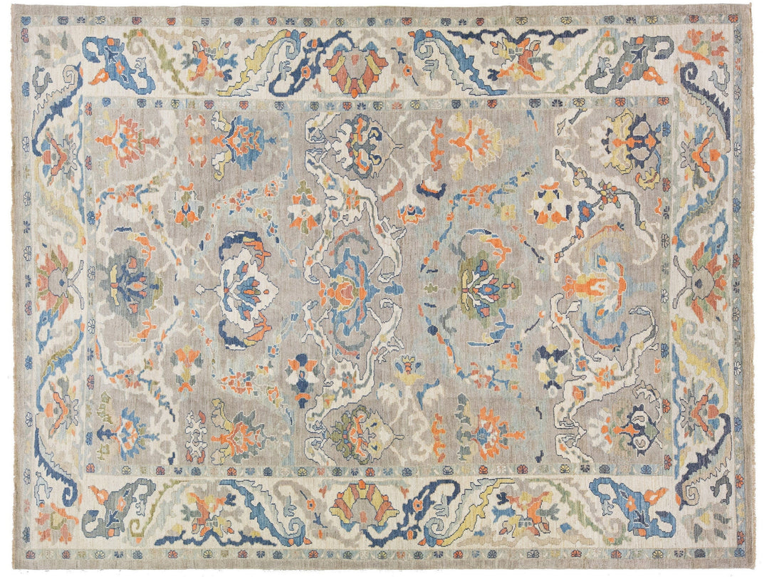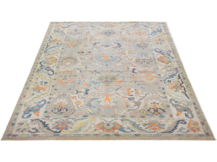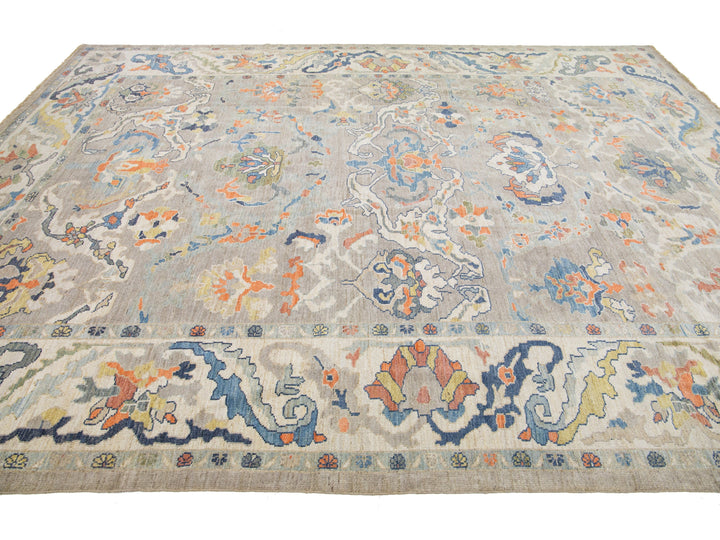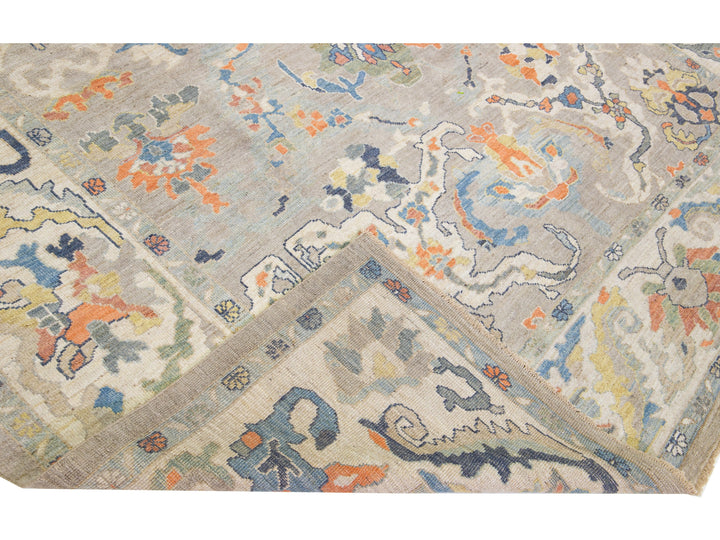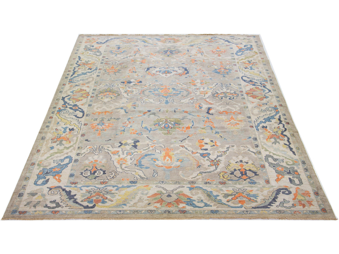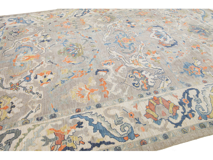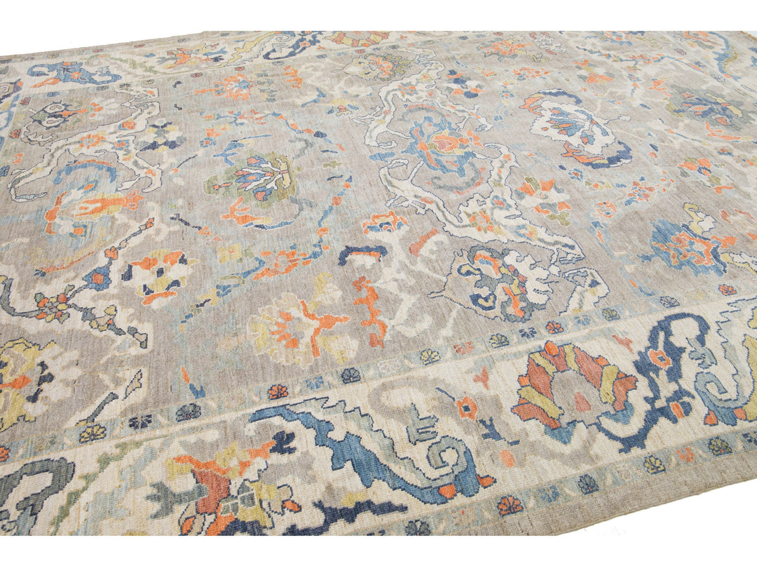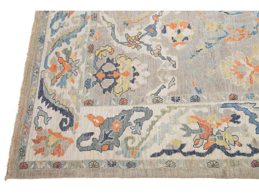 Beautiful modern Sultanabad hand-knotted wool rug with a gray color field. This rug has a beige frame with orange, yellow, and blue accents in a gorgeous all-over floral design.