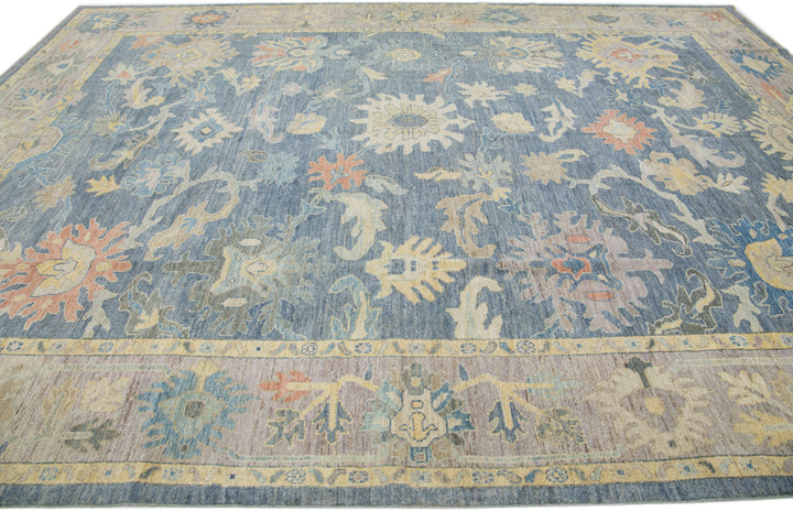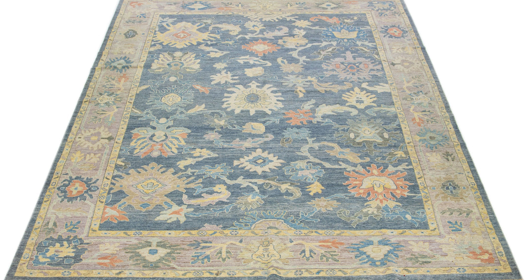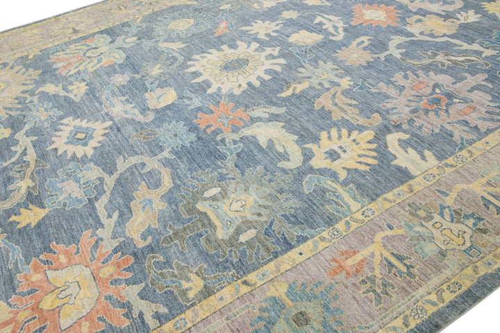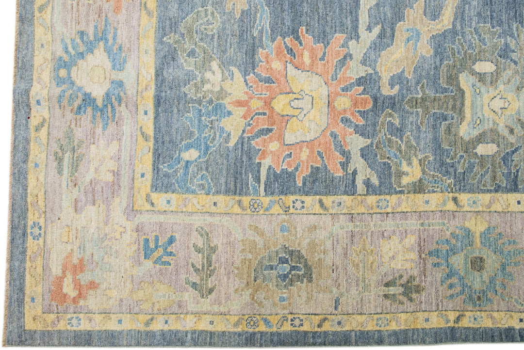 This contemporary take on the traditional Sultanabad style is showcased in an exquisite hand-knotted wool rug with a striking navy blue color. An intricately designed frame accentuates its all-over floral motif, adorned with multicolored accents that enhance its charm.