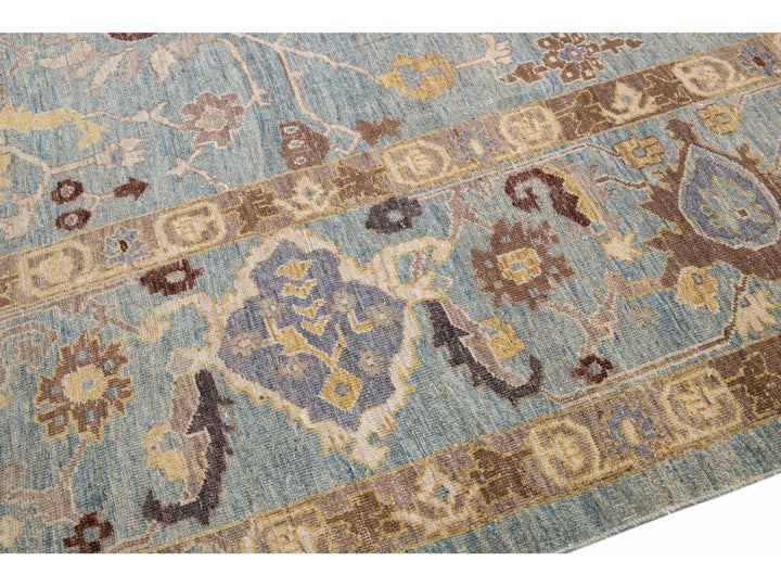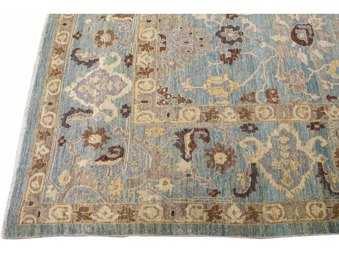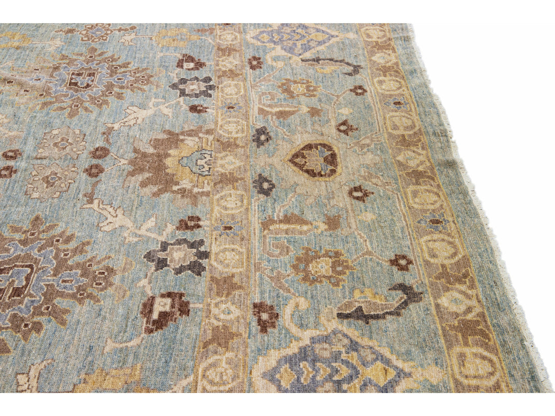 Beautiful modern Sultanabad hand-knotted wool rug with a blue field. This Sultanabad rug has brown, yellow, and beige accents in a gorgeous all-over Classic floral pattern design.
