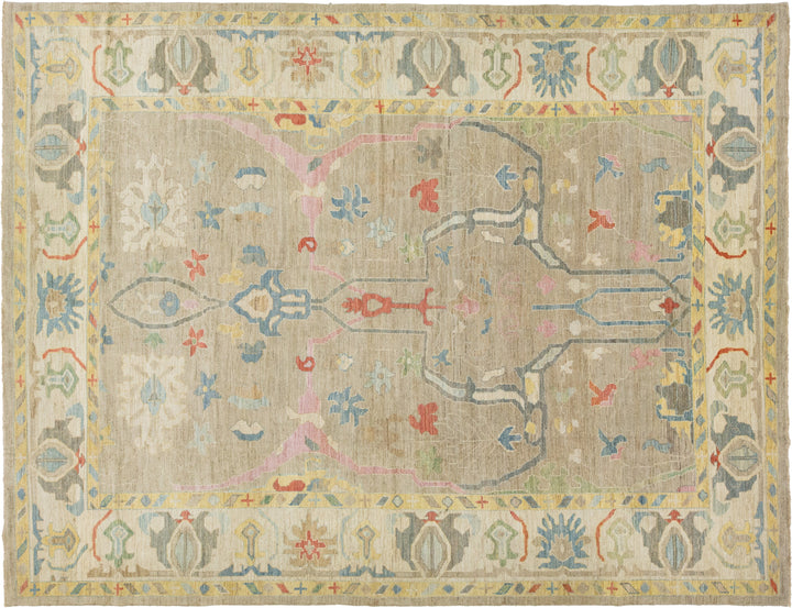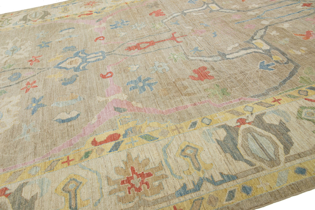This hand-knotted wool rug has a light brown background adorned with a blue, pink, and orange floral design. This rug measures 11'11'' x 15'6''.