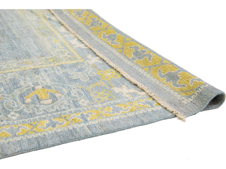 This hand-knotted wool rug features a light blue background with yellow and beige accents in a framed design. This rug measures 11'11'' x 18'7''.