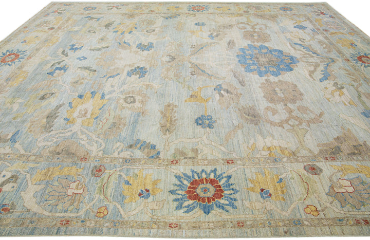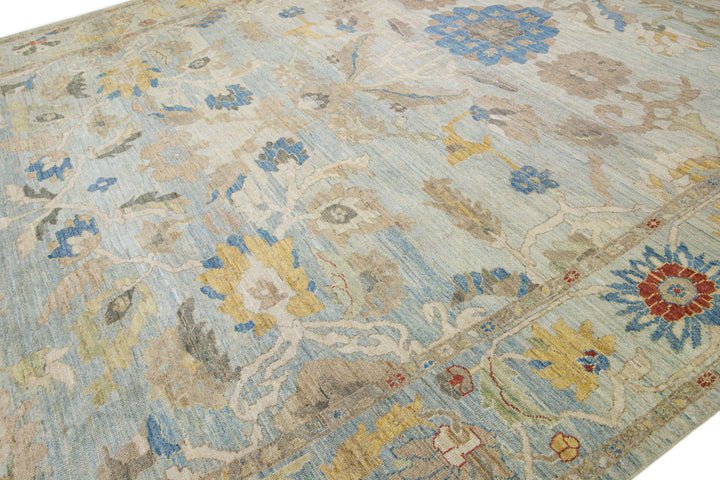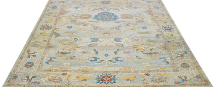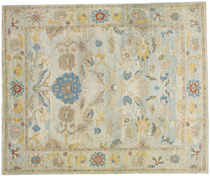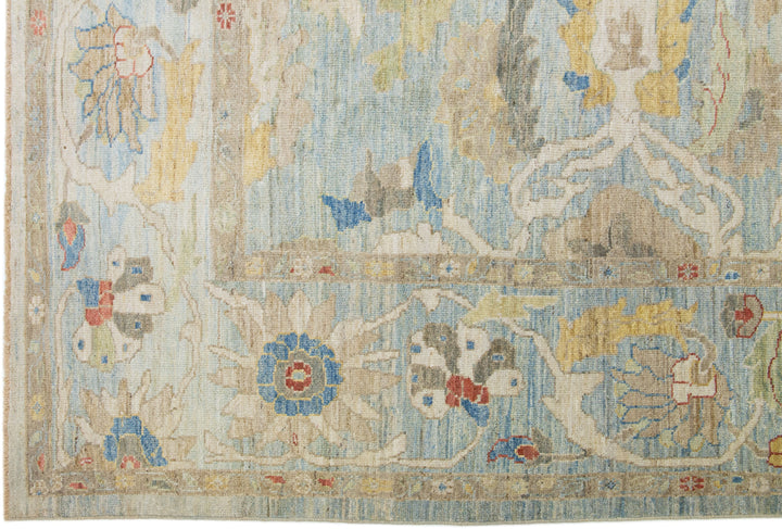 This contemporary take on the traditional Sultanabad style is showcased in an exquisite hand-knotted wool rug with a striking light blue color. An intricately designed frame accentuates its all-over floral motif, adorned with multicolored accents that enhance its charm.