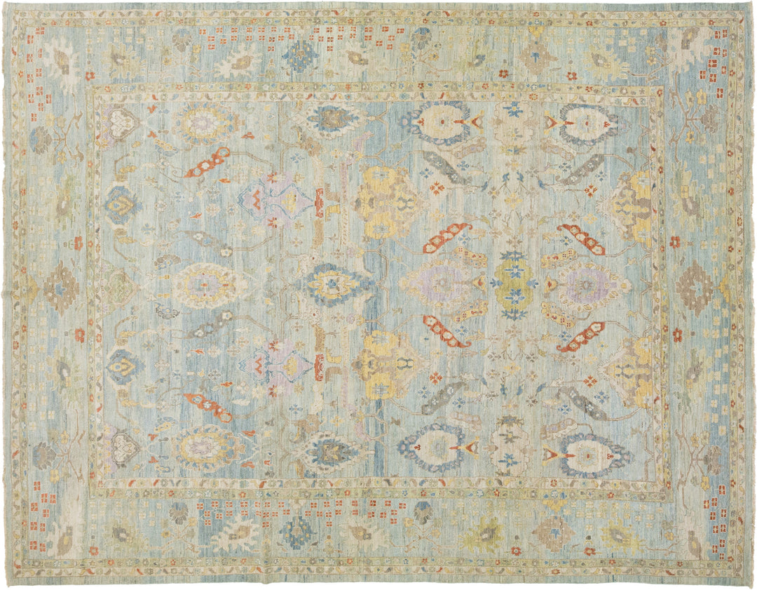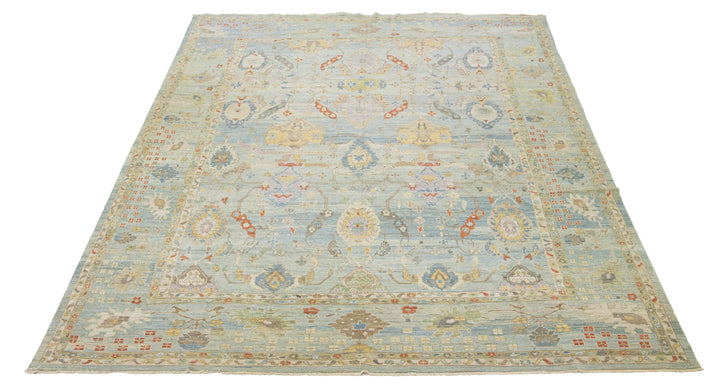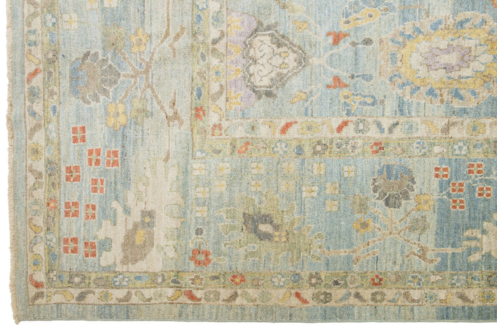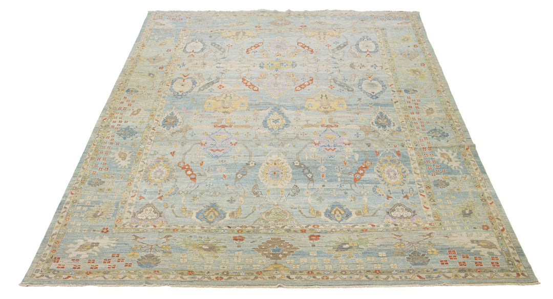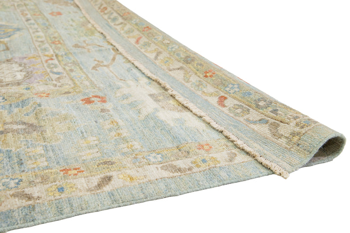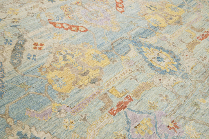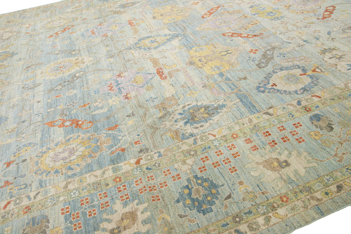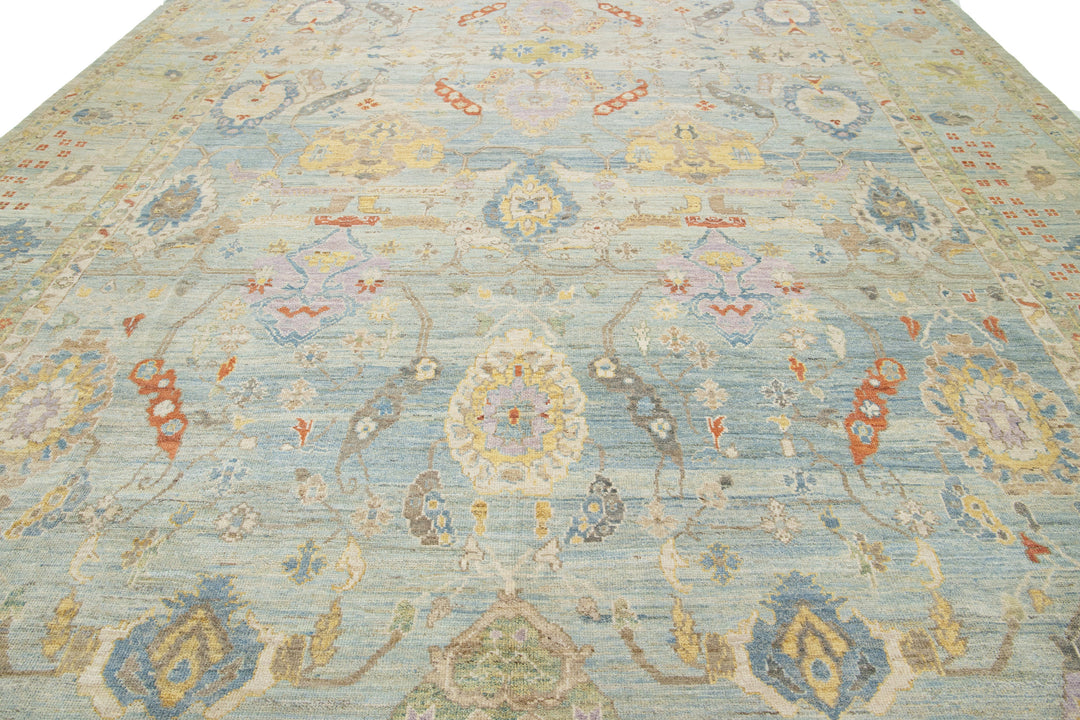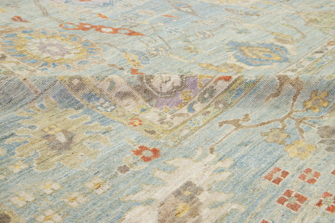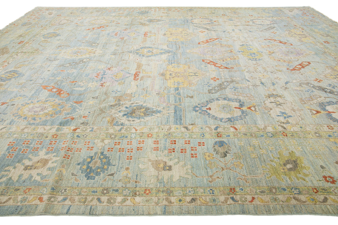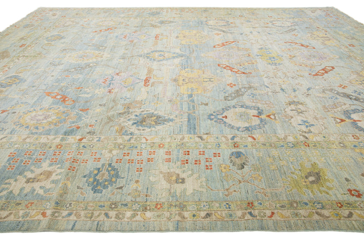 This hand-knotted wool rug has a light blue background adorned with multicolor accents in an all-over design. This rug measures 13'2'' x 16'11''.