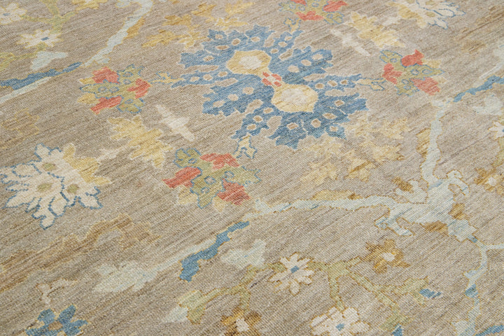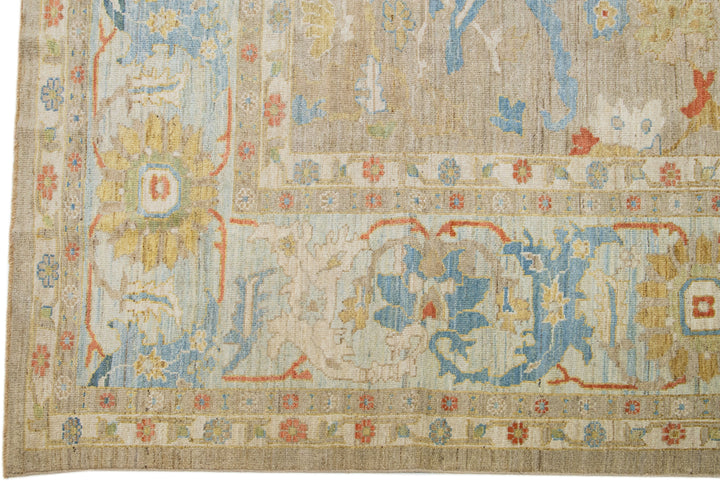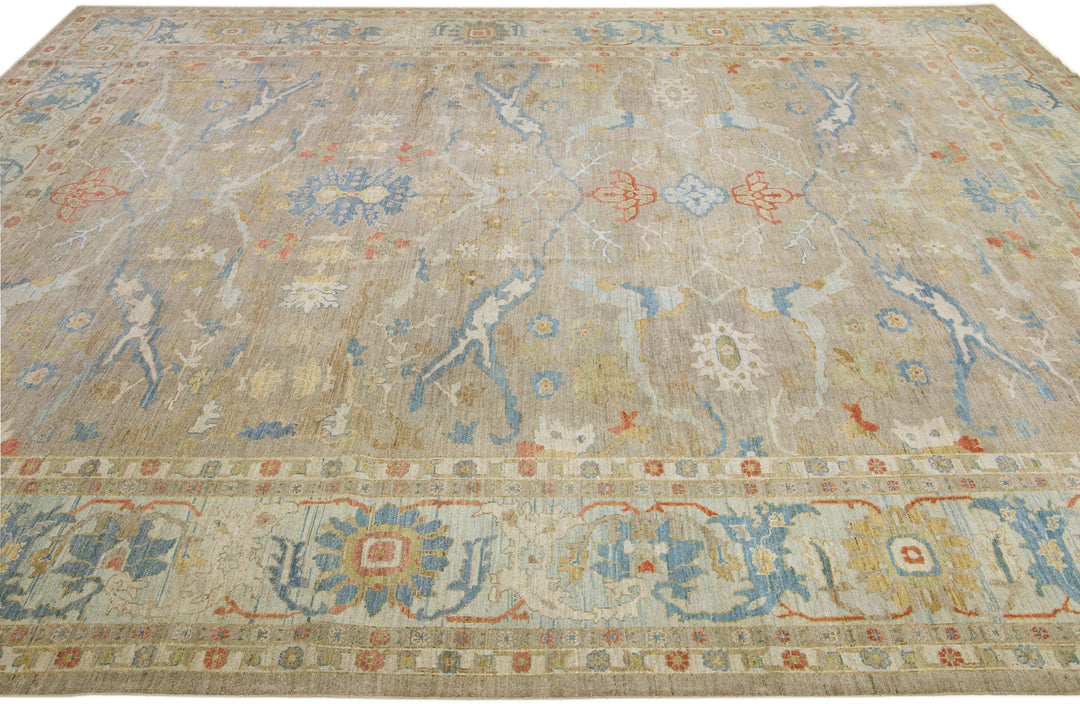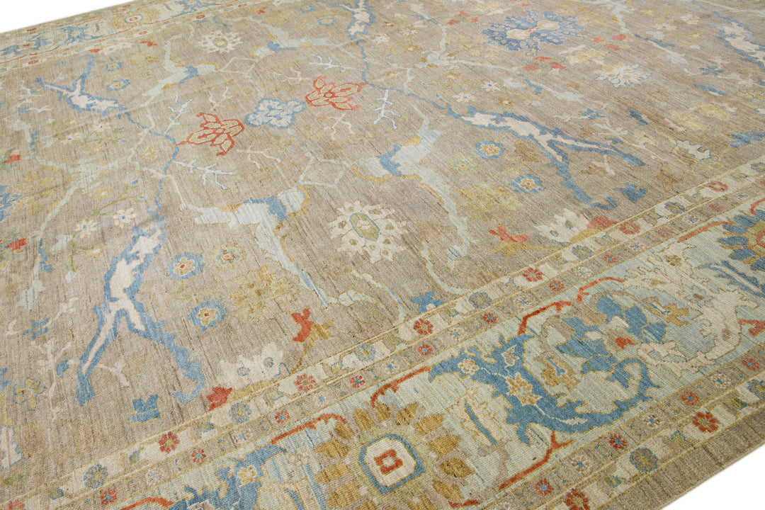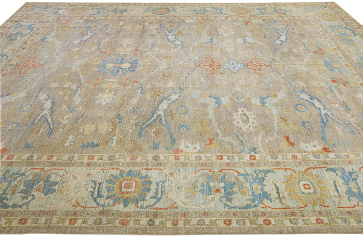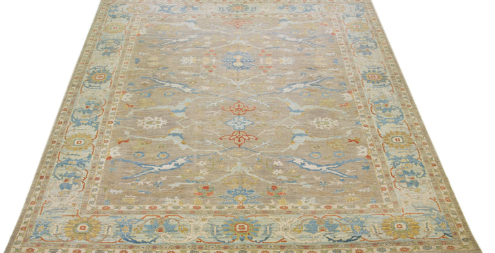 This contemporary take on the traditional Sultanabad style is showcased in an exquisite hand-knotted wool rug with a striking beige color. An intricately designed frame accentuates its all-over floral motif, adorned with multicolored accents that enhance its charm.