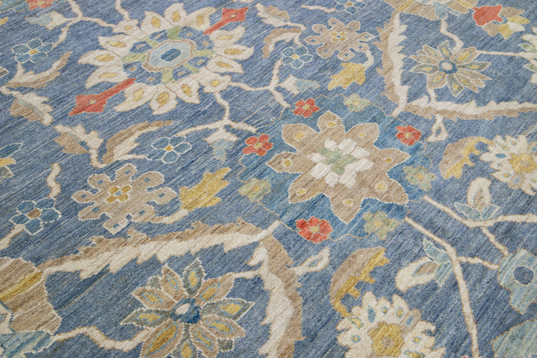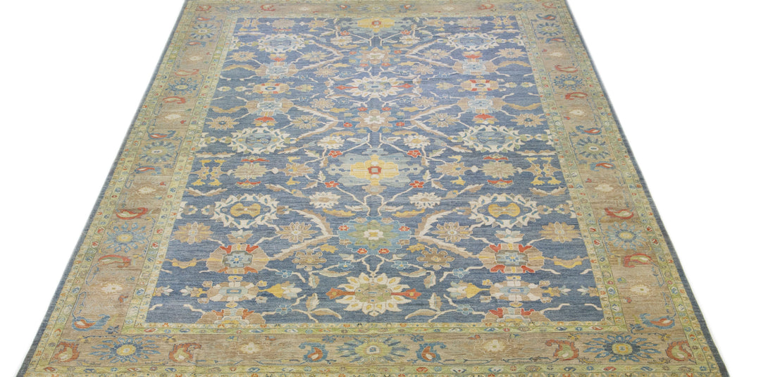 This contemporary take on the traditional Sultanabad style is showcased in an exquisite hand-knotted wool rug with a striking navy blue color. An intricately designed frame accentuates its all-over floral motif, adorned with multicolored accents that enhance its charm.