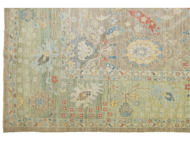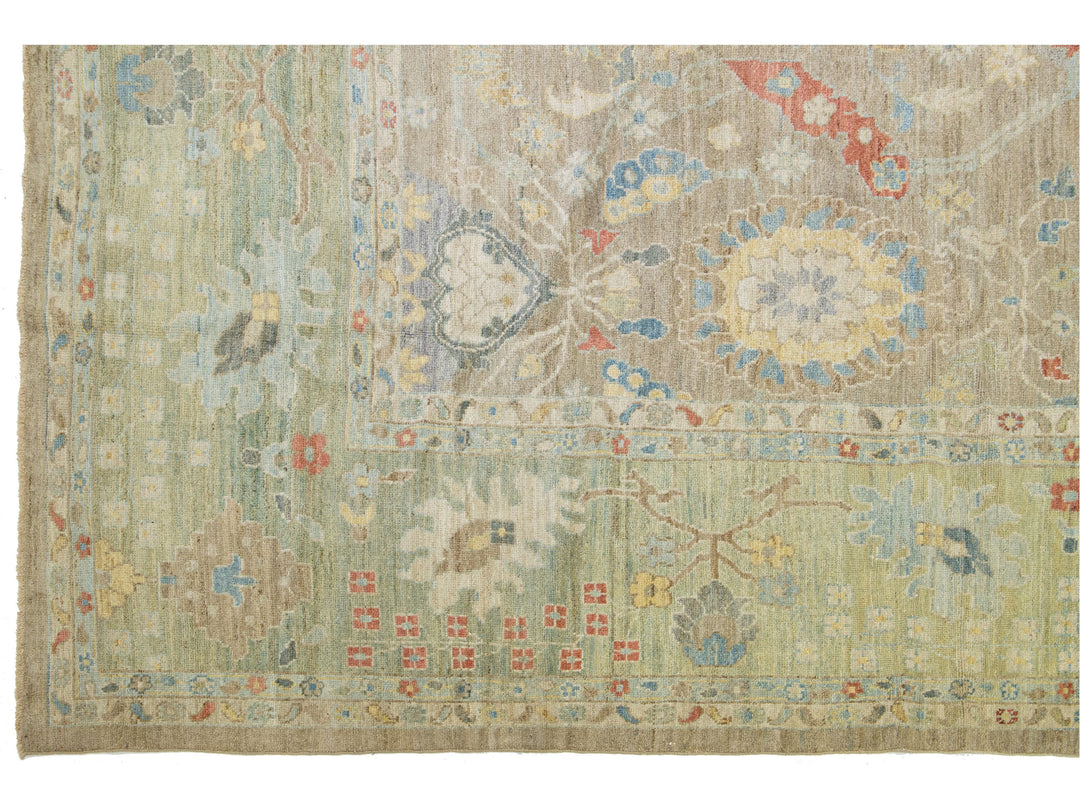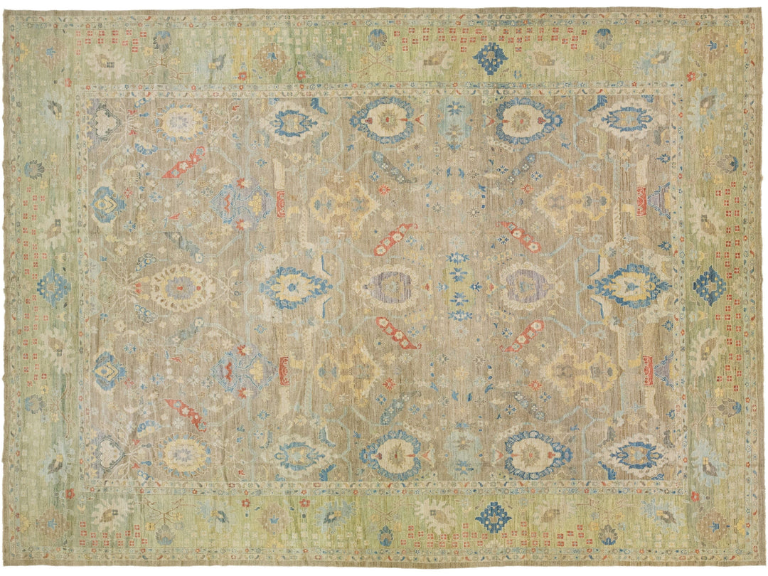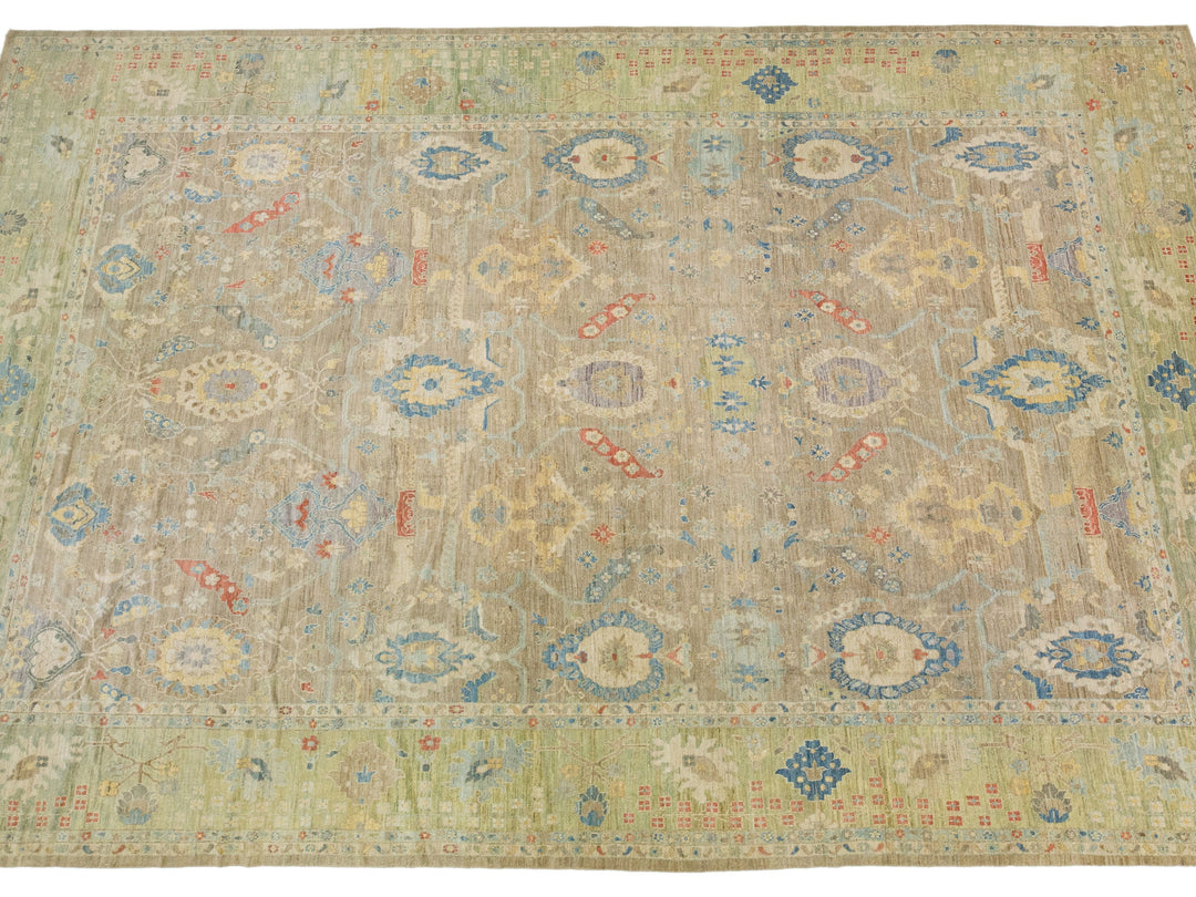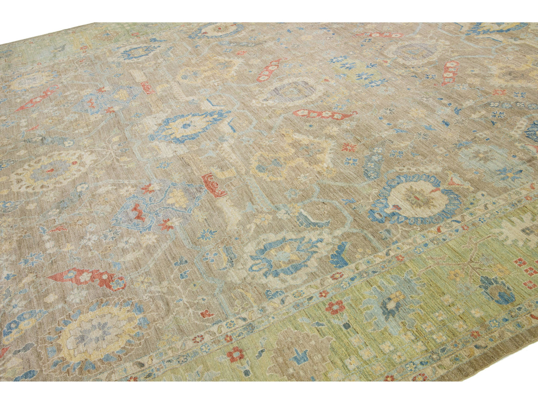 This oversized Sultanabad classic style has been meticulously transformed into a contemporary masterpiece. Crafted with great care, this magnificent wool rug has a light brown field with a green frame. Its all-over floral motif. To enhance its elegance, it incorporates a design of multicolored accents.