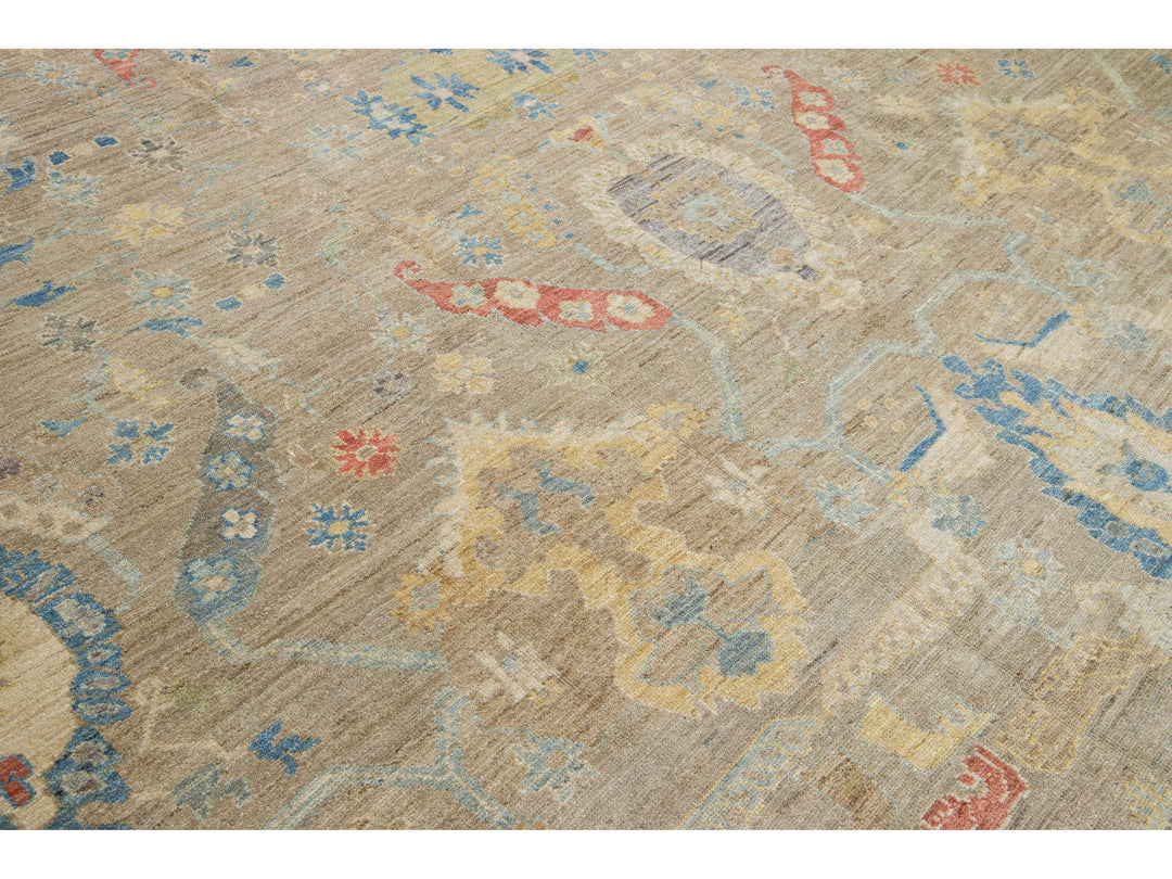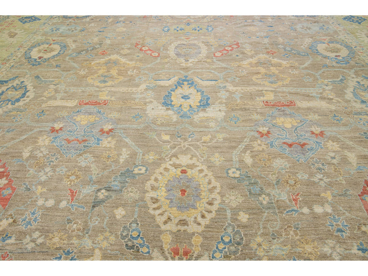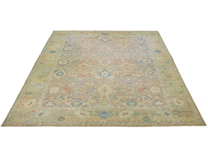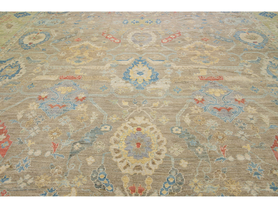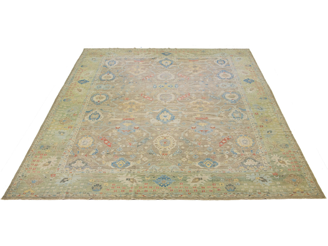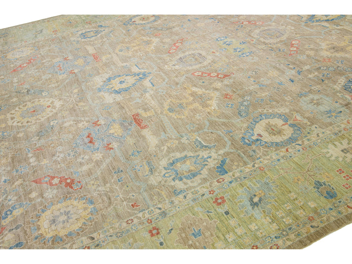 This oversized Sultanabad classic style has been meticulously transformed into a contemporary masterpiece. Crafted with great care, this magnificent wool rug has a light brown field with a green frame. Its all-over floral motif. To enhance its elegance, it incorporates a design of multicolored accents.