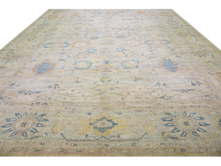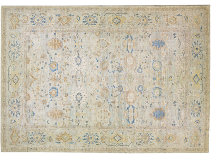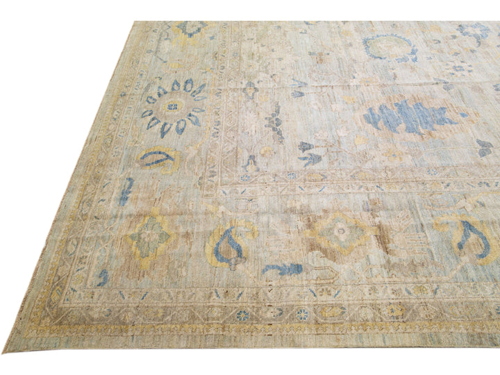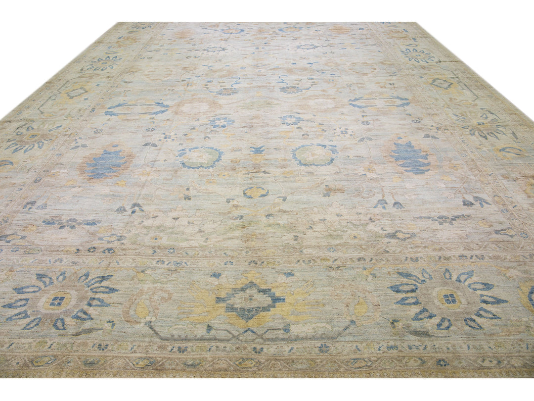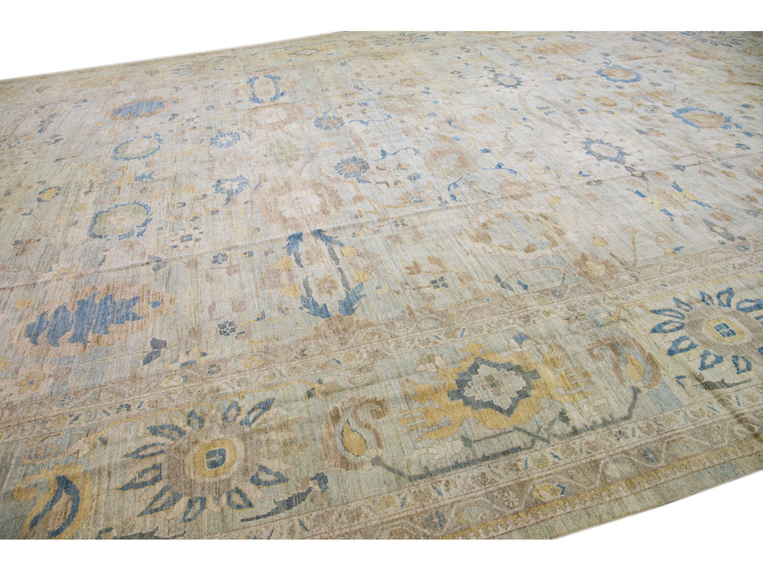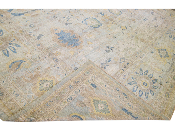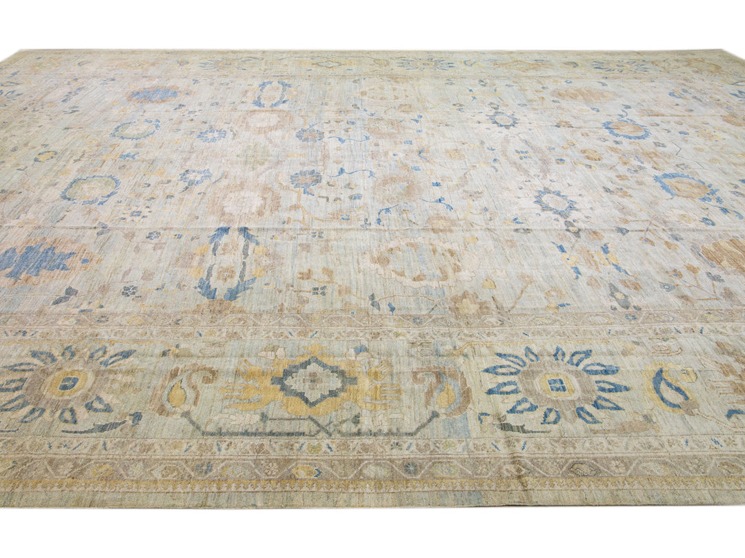 Beautiful modern Sultanabad hand-knotted oversize wool rug with a light blue color field. This rug has brown and beige accents in a gorgeous all-over floral design.
