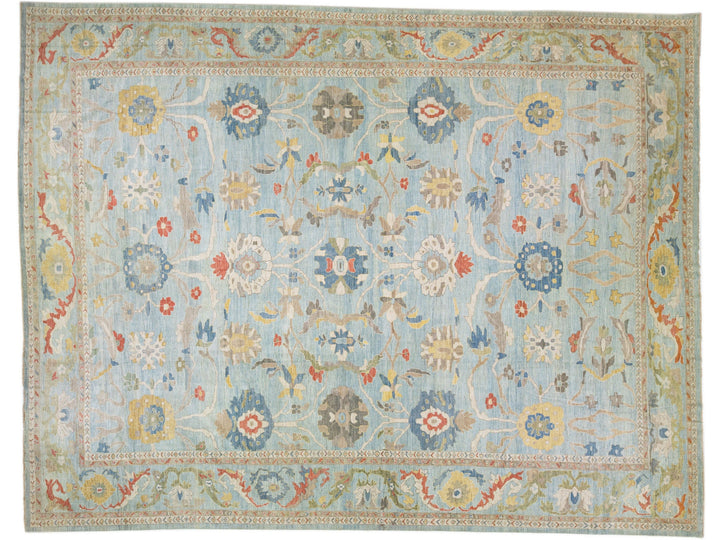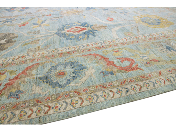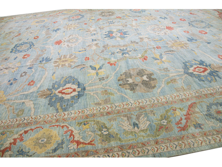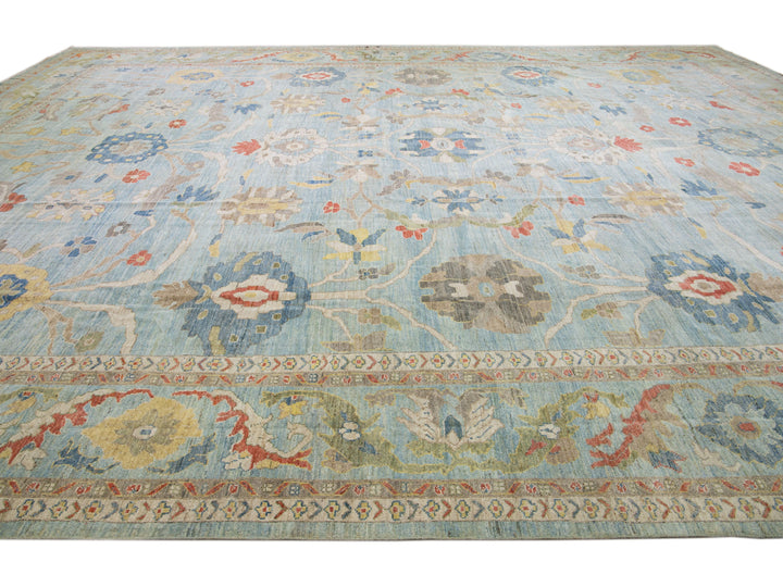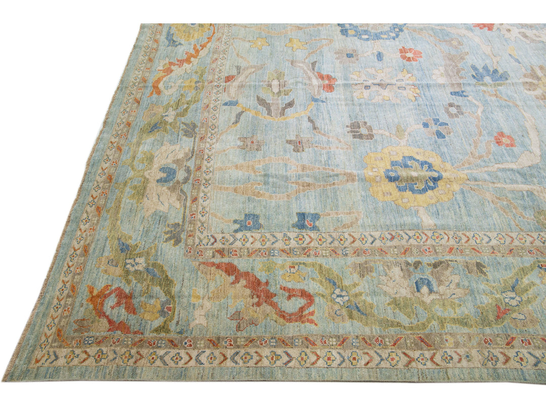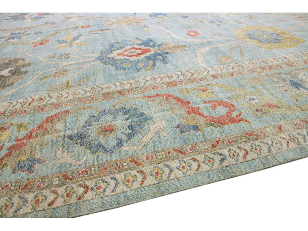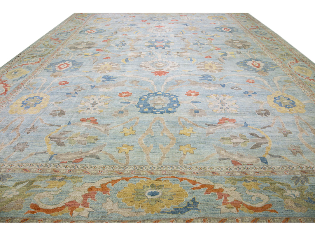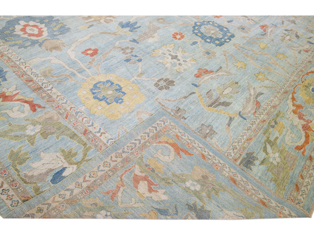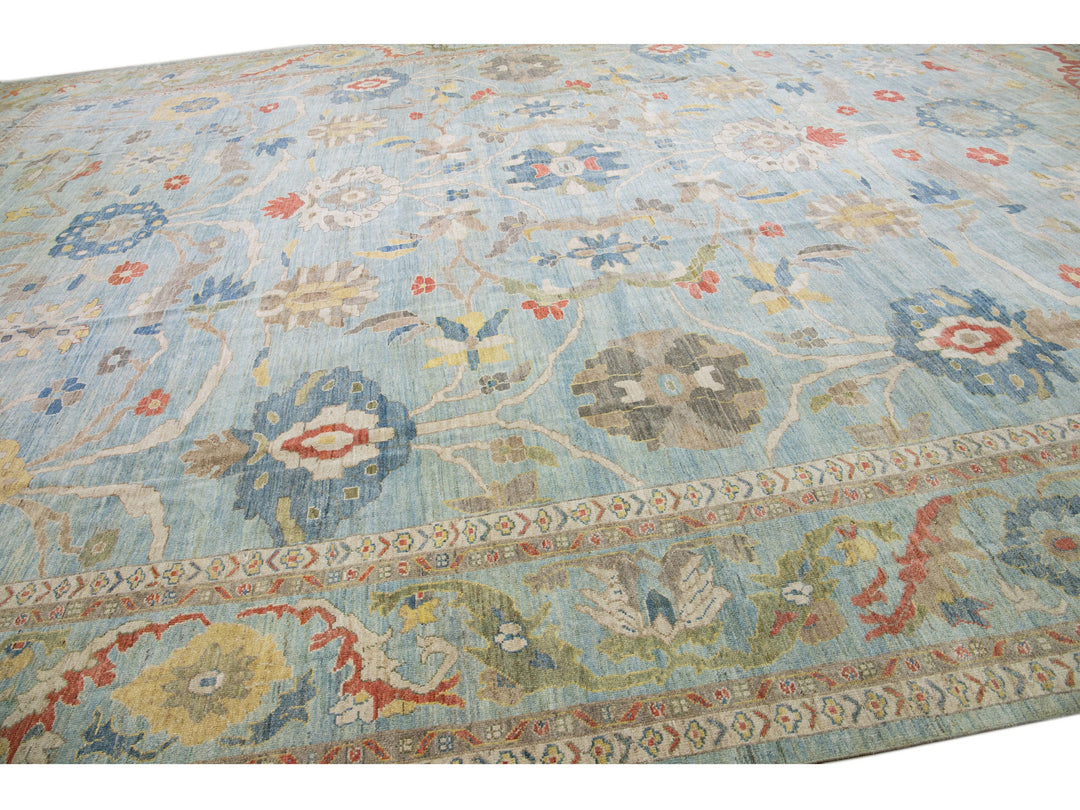 Beautiful modern Sultanabad hand-knotted oversize wool rug with a blue color field. This rug has multicolor accents in a gorgeous all-over floral design.