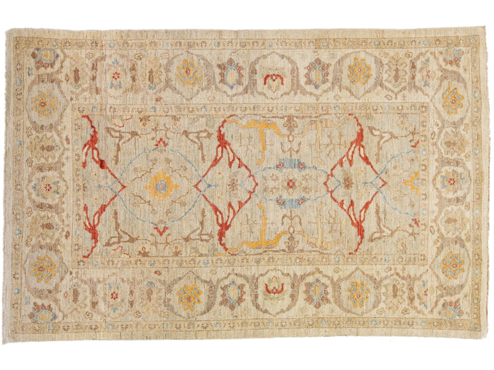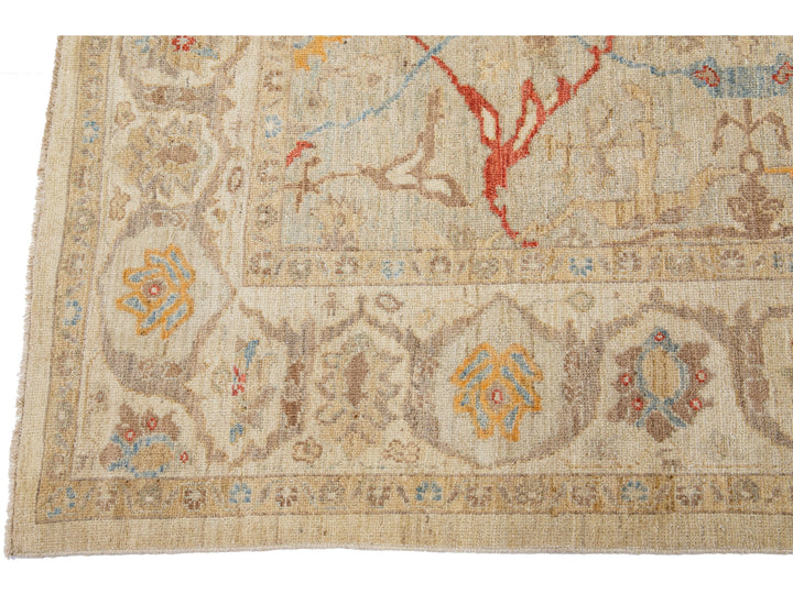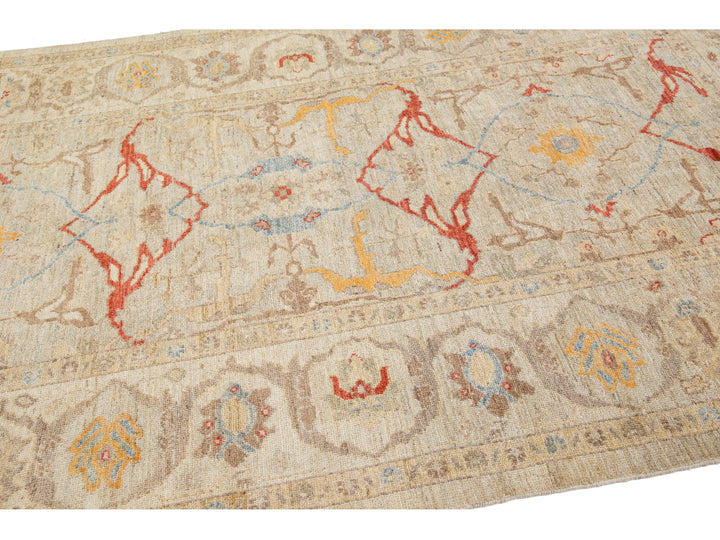 Beautiful modern Sultanabad hand-knotted wool rug with a beige color field. This rug has a designed frame with red, orange, and blue accents in a gorgeous all-over floral design.