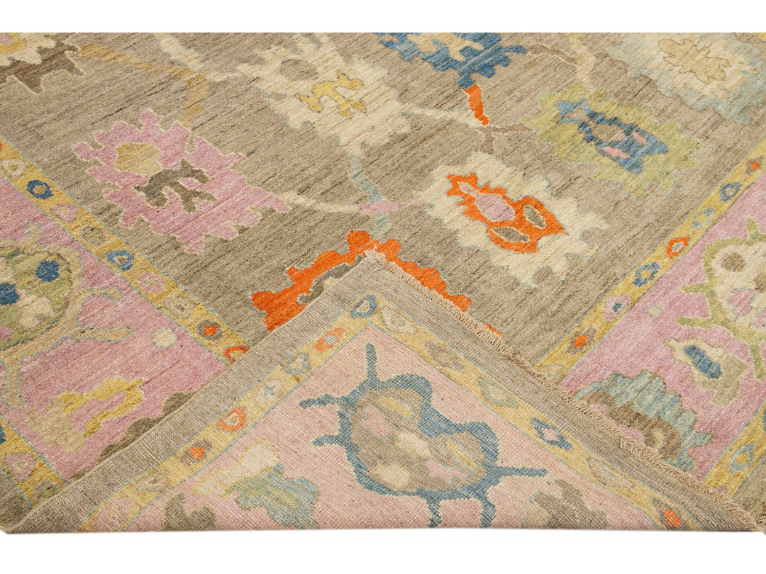 Beautiful modern Sultanabad hand-knotted wool rug with a brown field. This Sultanabad rug has a pink frame multicolor accent in a gorgeous all-over Classic floral pattern design.