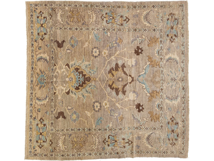 Elevate your decor with our hand-knotted Persian wool rug. The intricate design in blue, beige, and brown on a light brown background adds a touch of sophistication to any space. Size: 8'1" x 8'3".