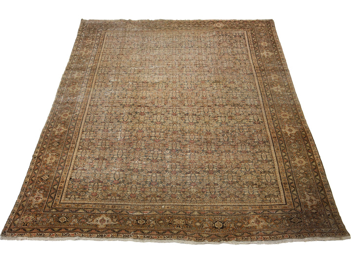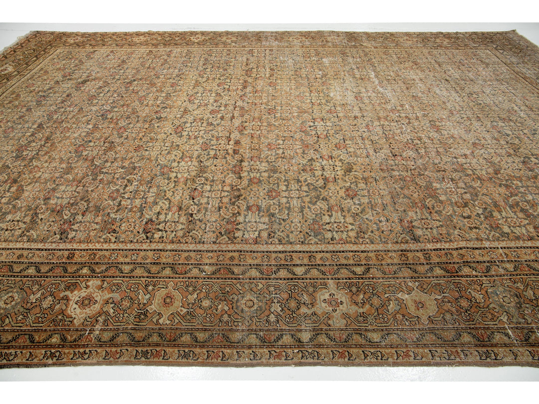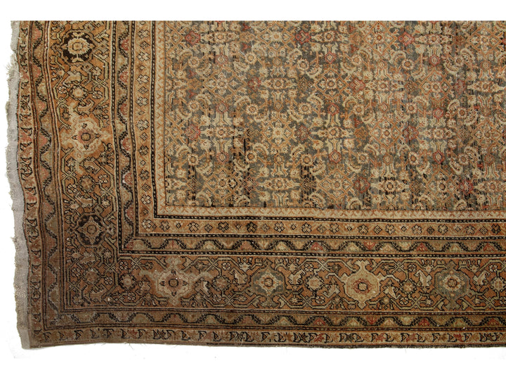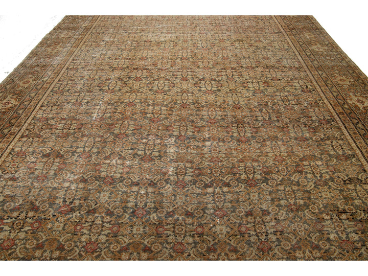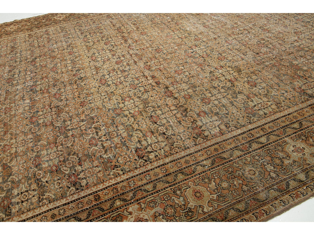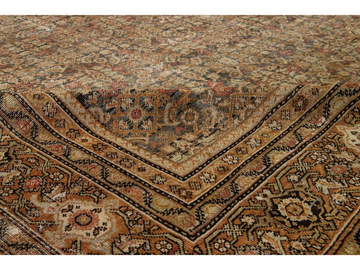 An antique Persian Tabriz rug featuring a blue-gray field with orange, beige, and rust accents adorned with an all-over pattern. This rug measures 11'6" x 16'10".
