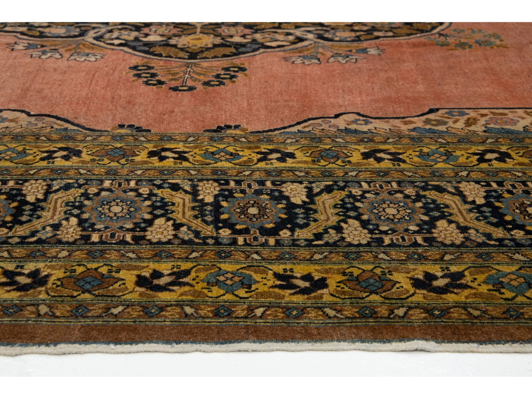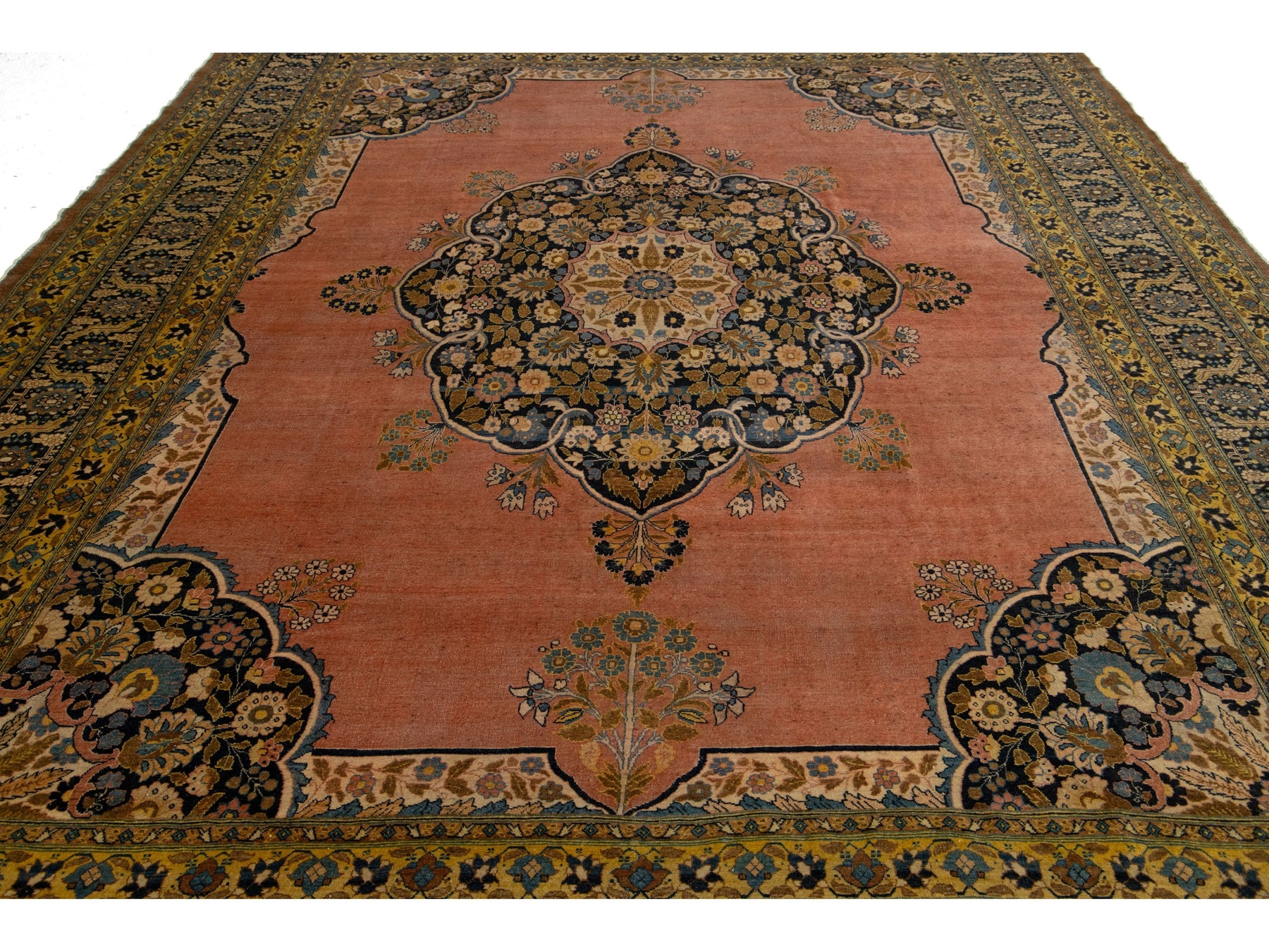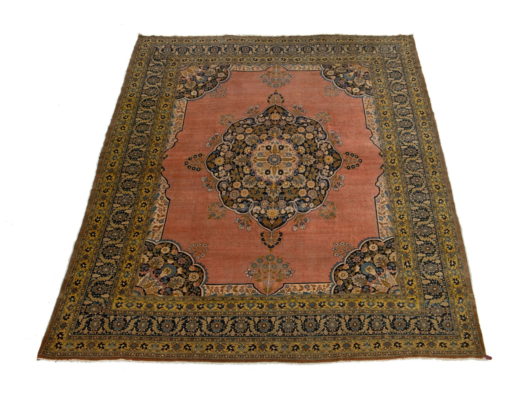 An antique Persian Tabriz rug featuring a terracotta field with a beautifully detailed center medallion and multicolored frame design. This rug measures 9'5'' x 12'11".