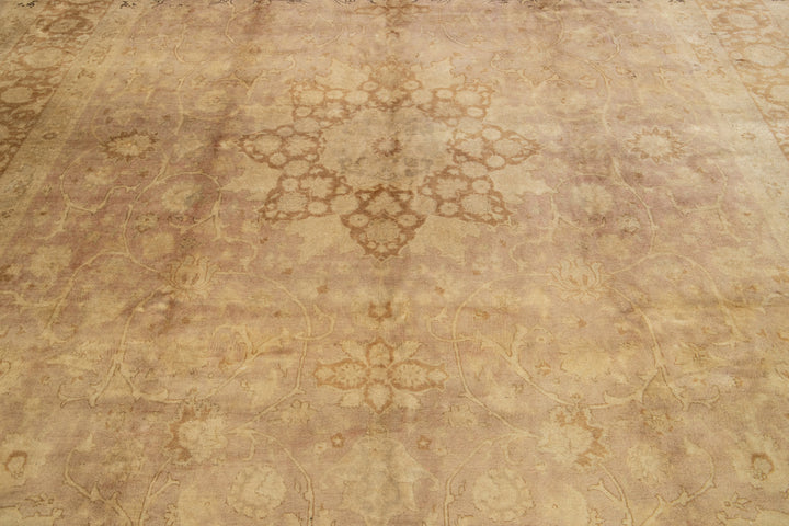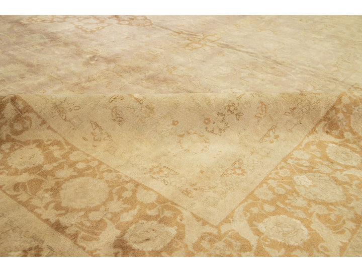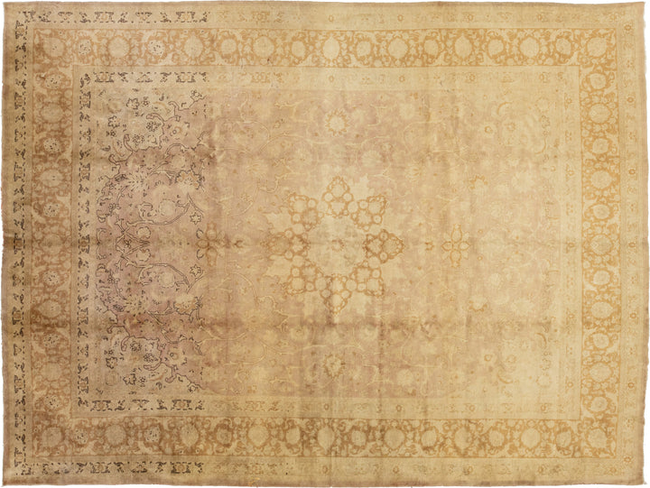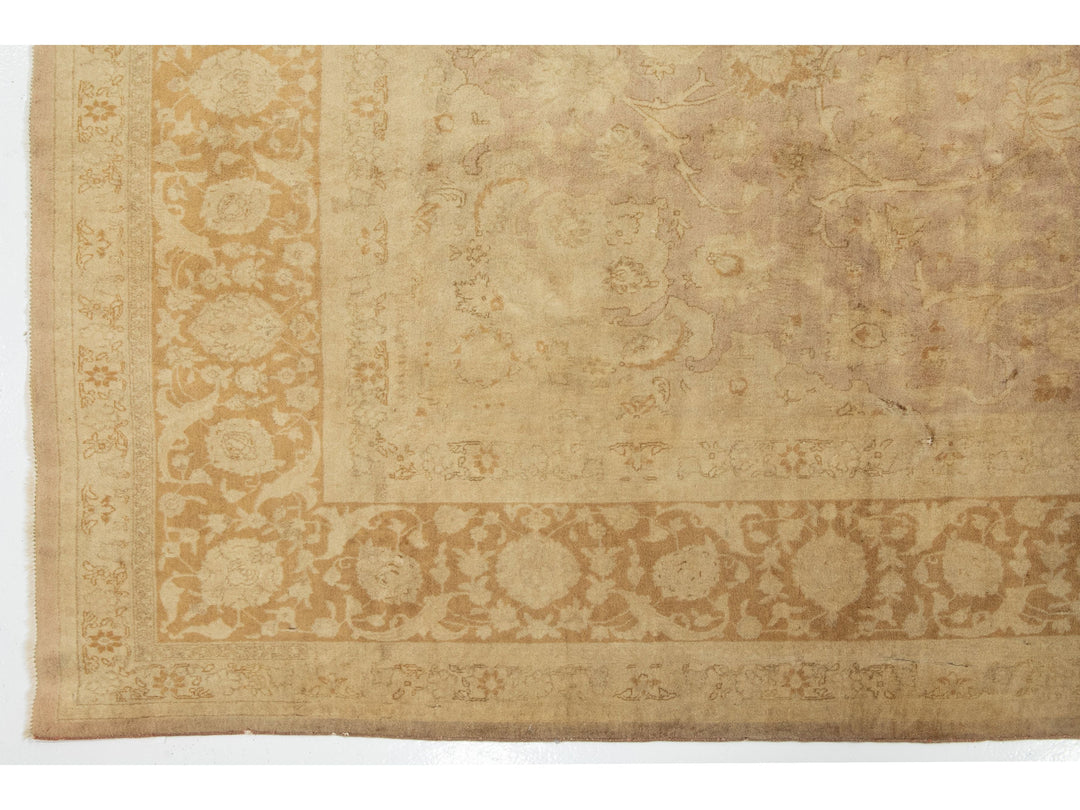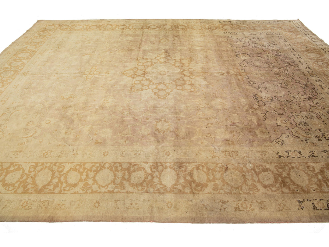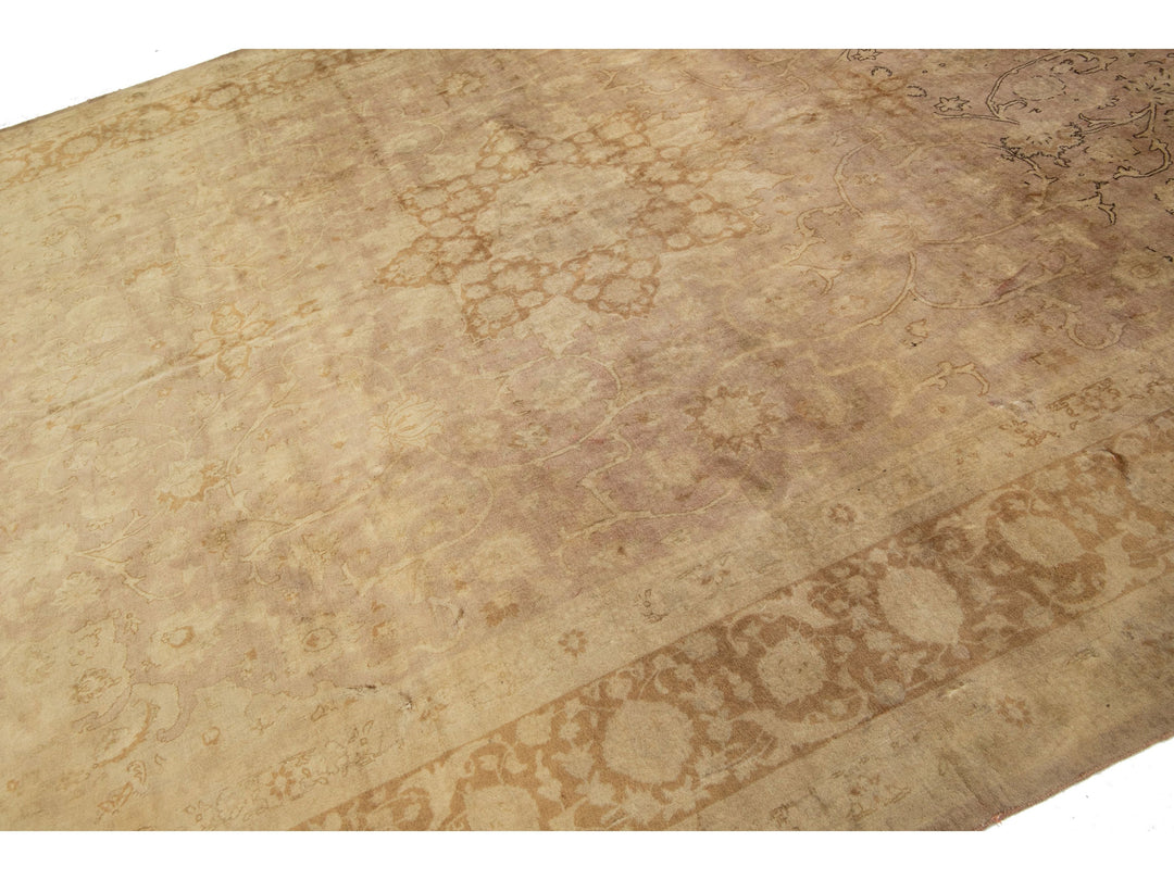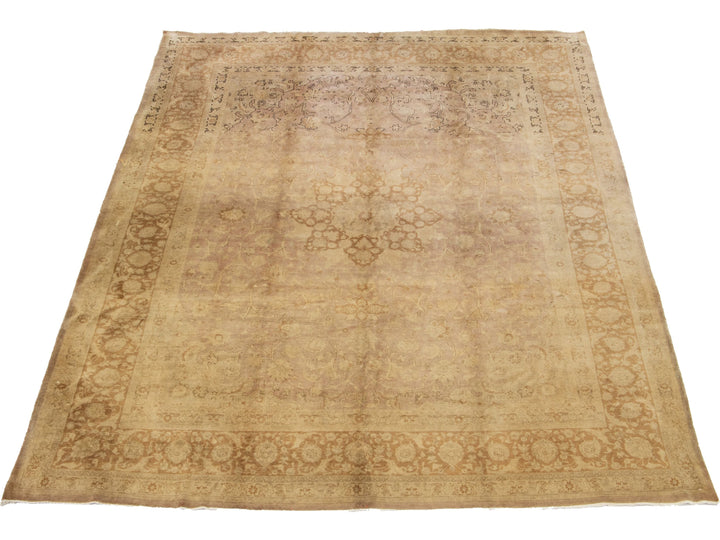 This Persian Tabriz wool rug is handcrafted with a classic all-over floral pattern. The tan background contrasts the design, which features shades of purple and brown. This rug measures 9'8" x 13'2''.