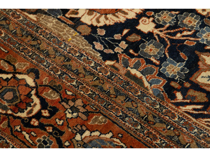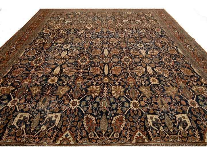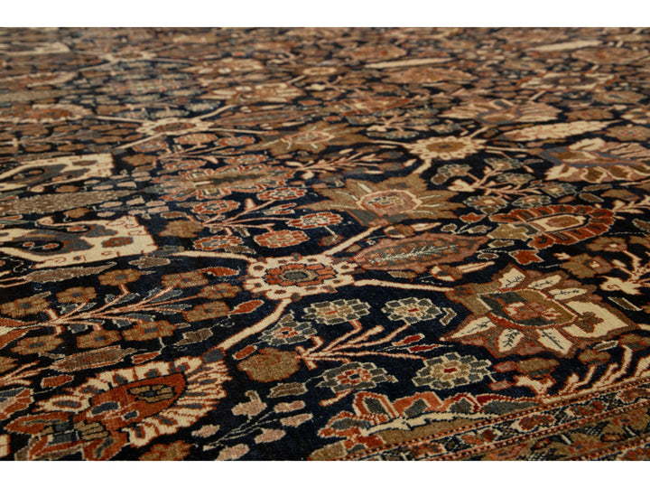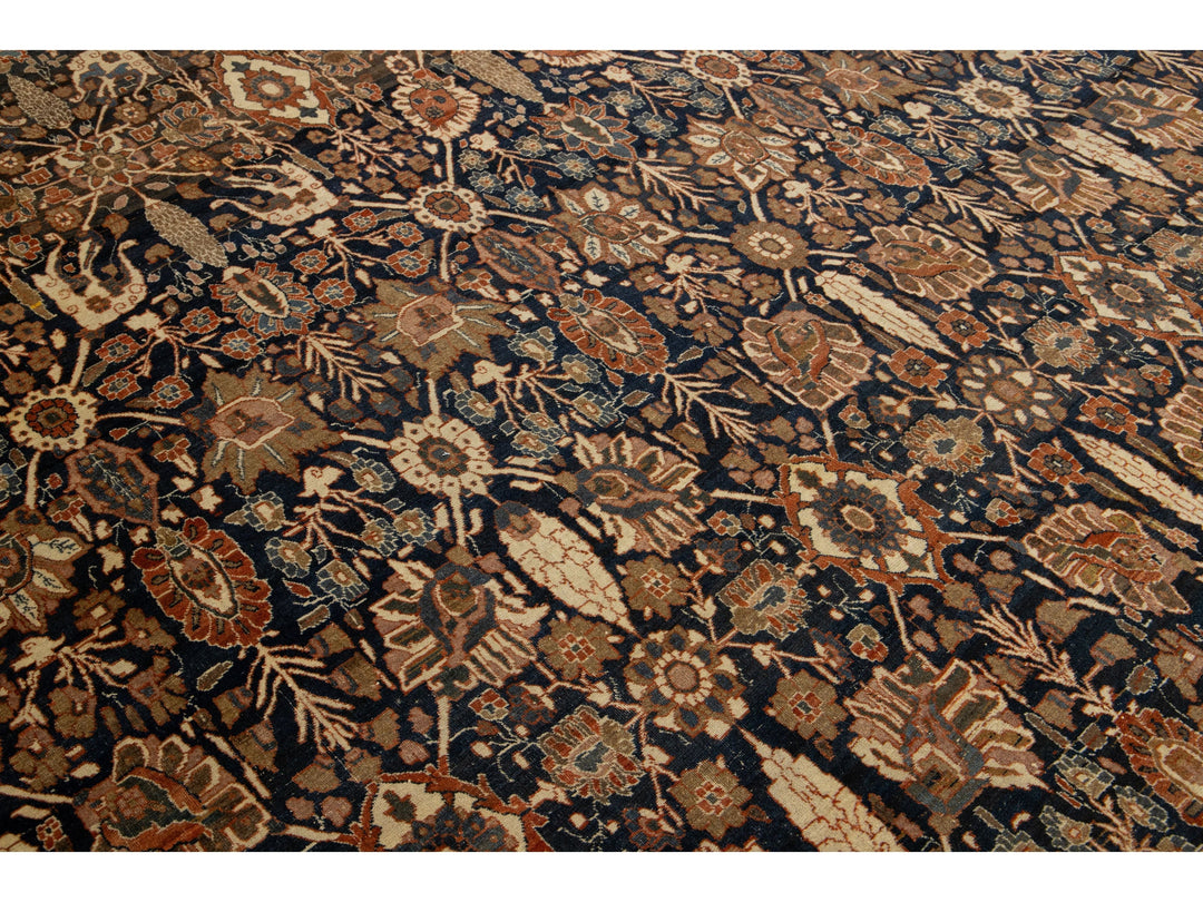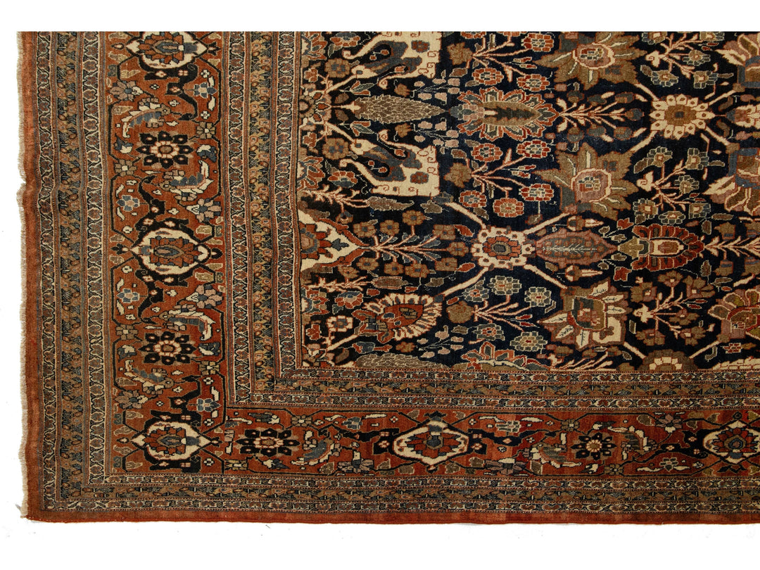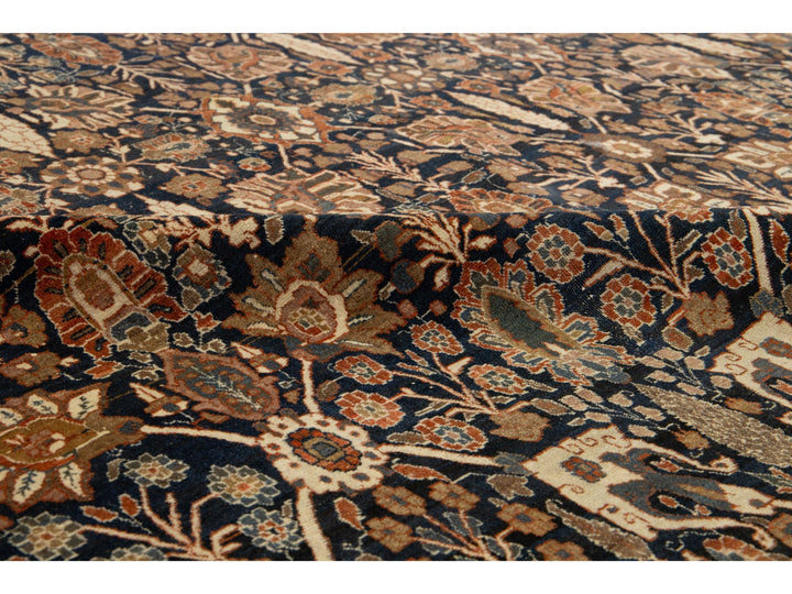 This antique Persian Tabriz rug from the 1900s features a stunning dark blue field decorated with an intricate floral pattern, highlighted by rich rust accents.