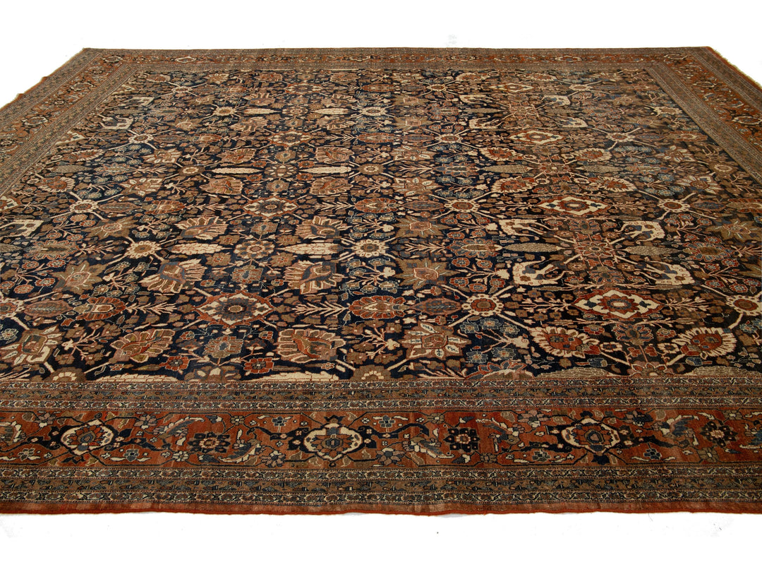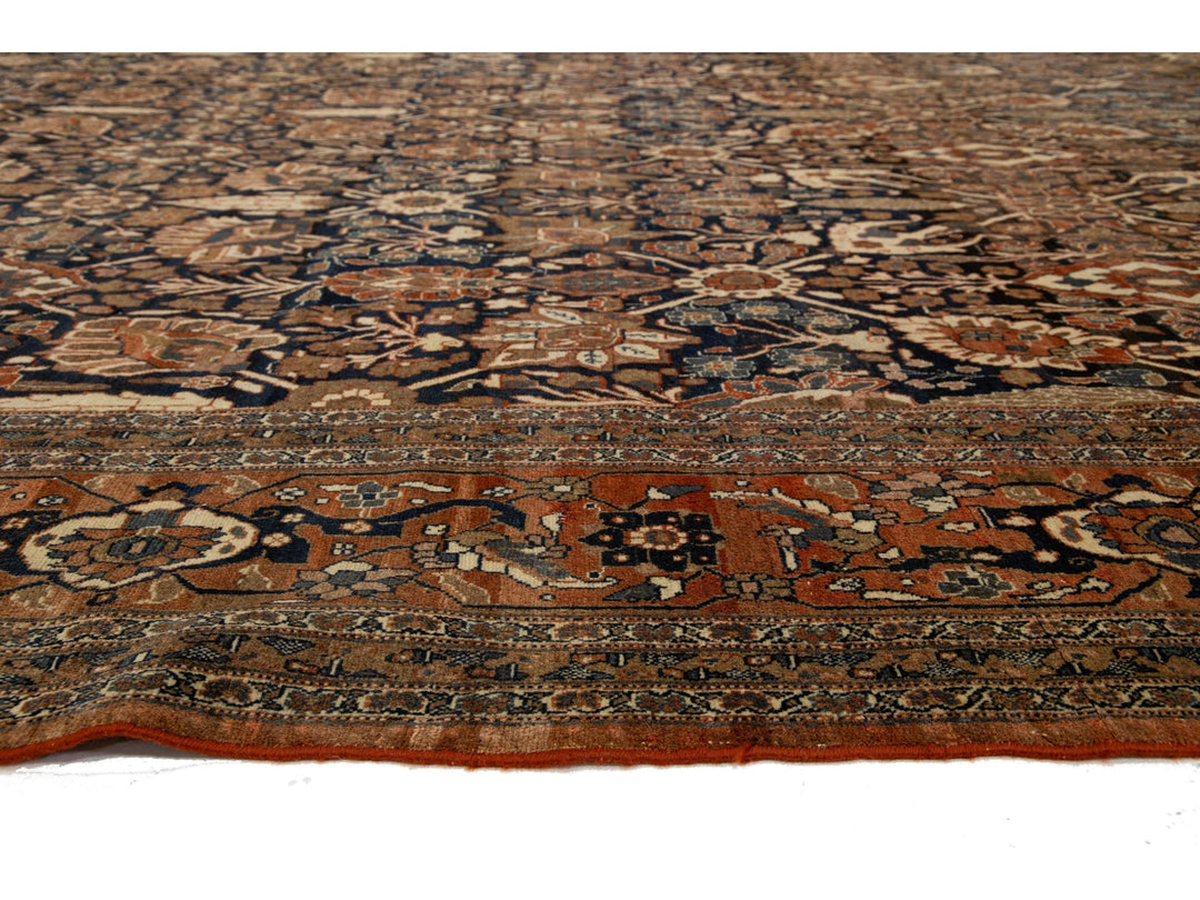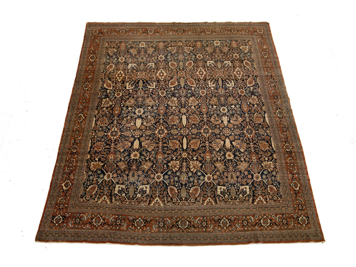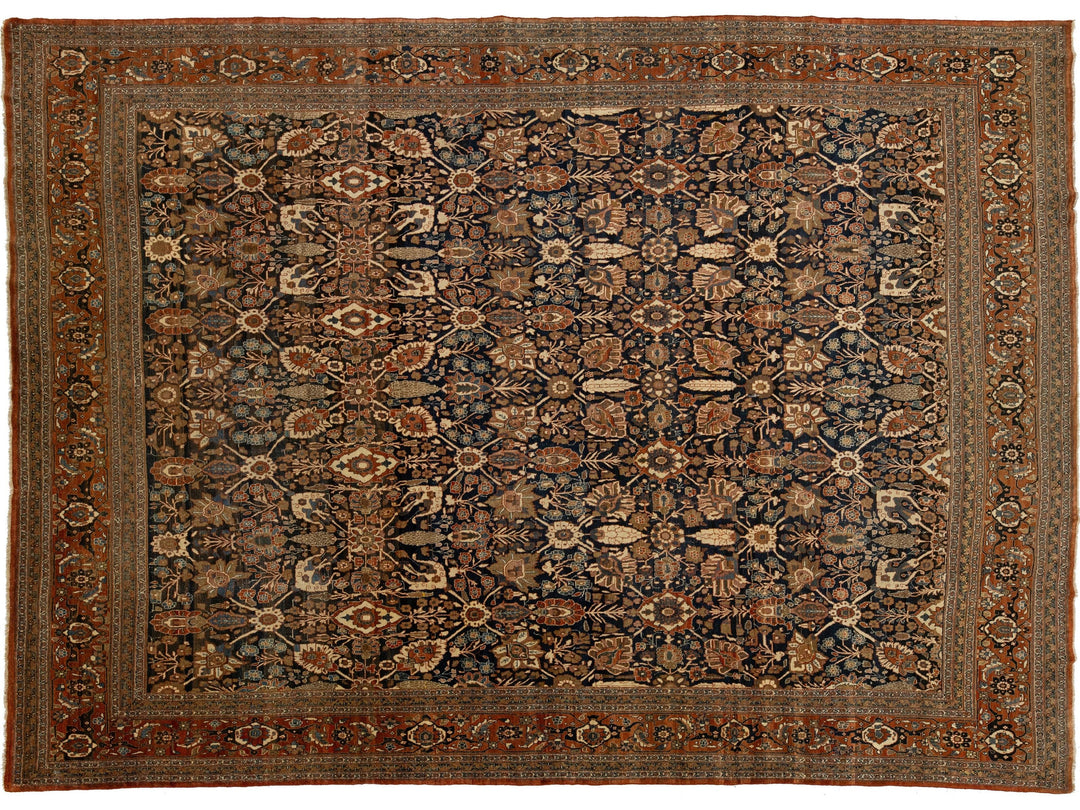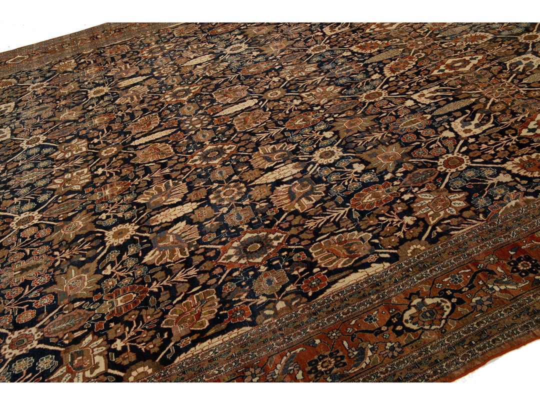 This antique Persian Tabriz rug from the 1900s features a stunning dark blue field decorated with an intricate floral pattern, highlighted by rich rust accents.