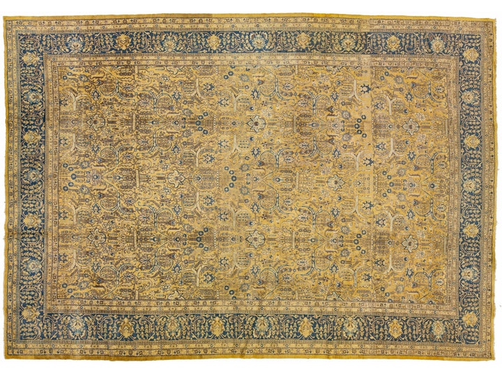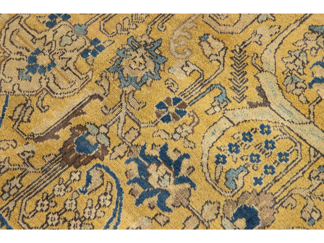 Beautiful antique Tabriz hand-knotted wool rug with a yellow field. This Persian piece has a blue frame and brown accents in a traditional floral design.